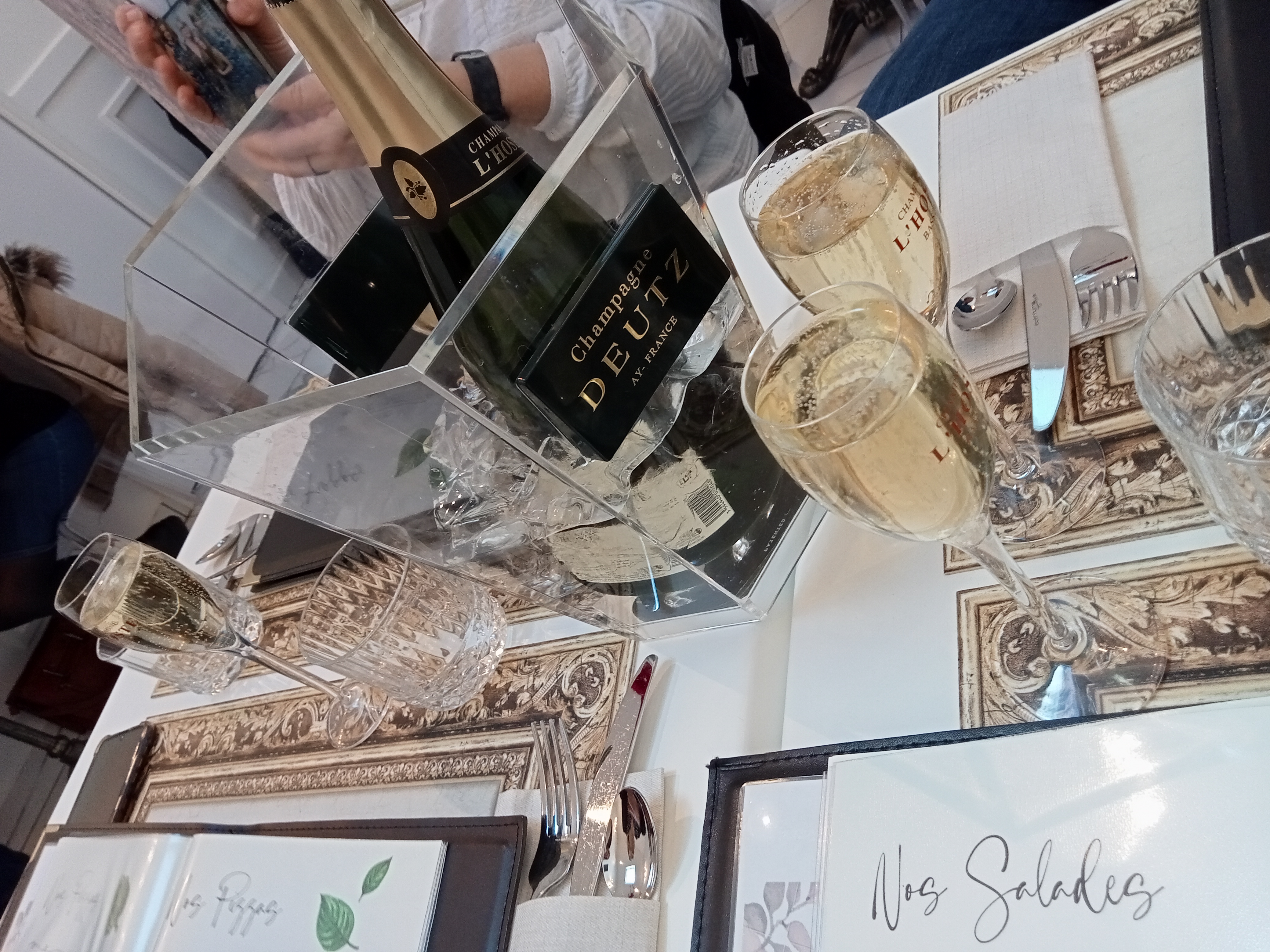 Prise de réservation par tél vers 12 h 50 pour 13 heures si c'était possible ? Un monsieur me répond OK mais la cuisine arrête le service à 13 h 45 et le restaurant ferme à 14 heures 15.... Ouuuuf....13 heures pile nous étions là et répartis 14 h15 .Le temps qui nous était accordé a été respecté ! Malheureusement le restaurant avait encore qq convives à notre sortie, apparemment, ils n'avaient pas eu les mêmes consignes de restriction !