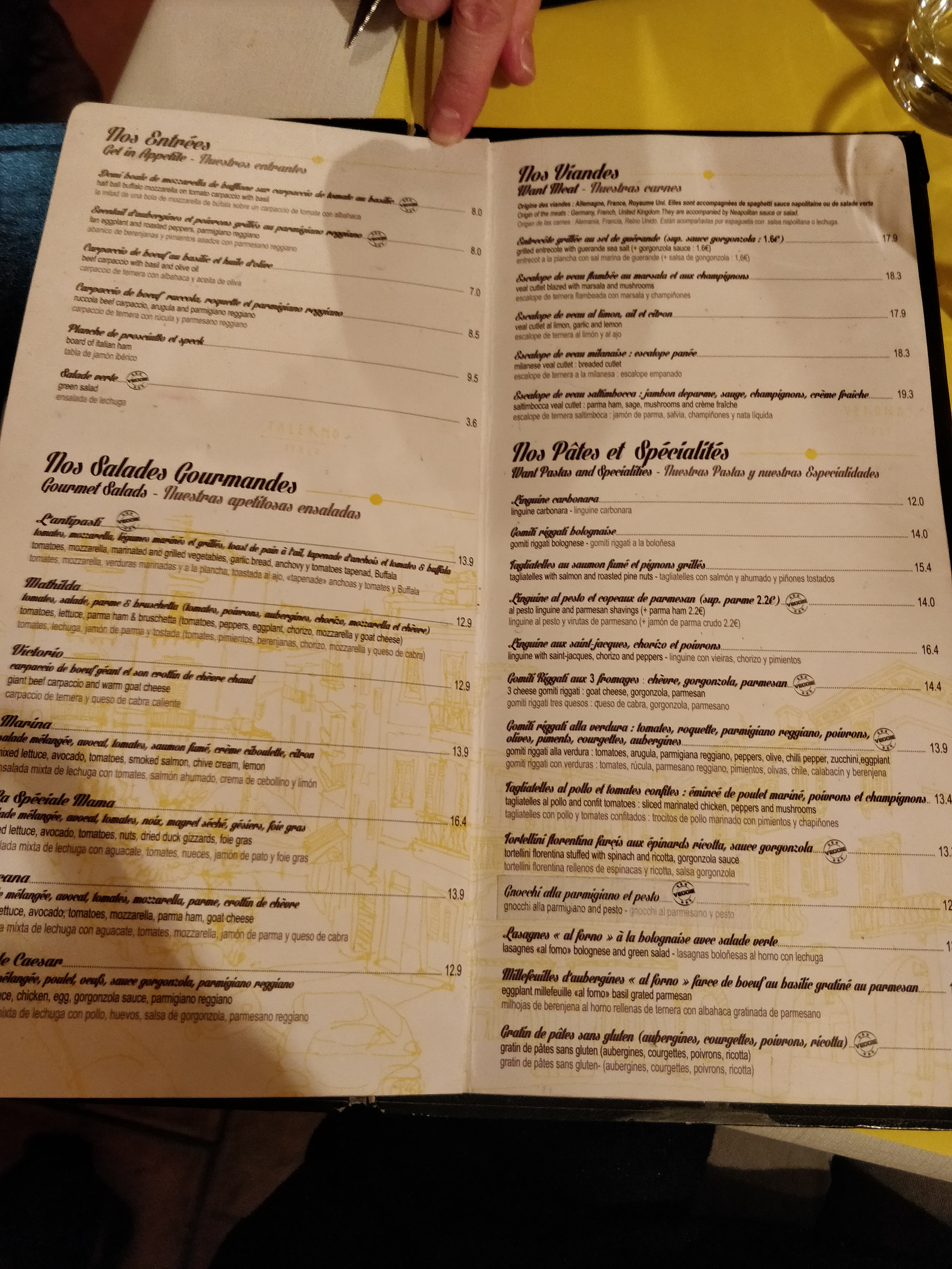 au menu à la carte une entrée prévue avec aubergine et poivrons cuits et marinés.... plat servi avec 2 tranche d'aubergines bruléées et poivrons et remplacés tranches de tomates.....et aprés demande d'explication vers le patron du serveur.....c'est comme ça en final avec une simple pizza reine trop cuite et un verre de lambrusco .....facture de 40 euros un soir de semaine ! et sans sourire quand on regarde de prés le détail! restaurant à éviter, n'est pas à la hauteur de sa réputation de plus ancien restaurant italien de Bordeaux ! Allez ailleurs pour le même prix