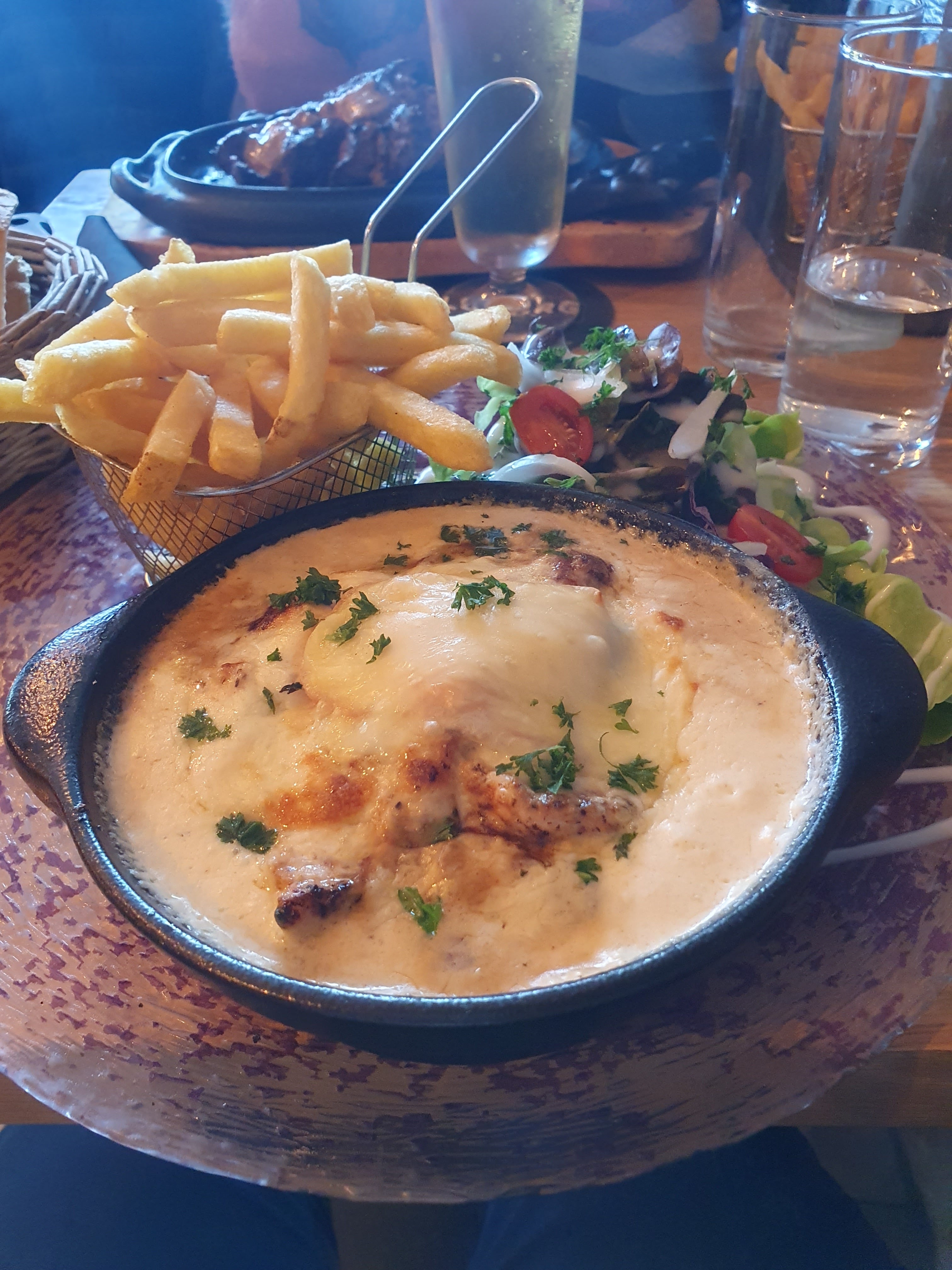 Nous avons eu un peu peur au début, couteaux sales( il reste le repas de la veille dessus) Le verre qui contient la mayo et le ketchup n'a pas été lavé depuis un moment. Serveur pas très convaincant, on l'embête un peu avec nos quelques questions. On sent qu'il manque du personnel, le petit jeune serveur qui ne sait pas trop ce qu'il fait ici. Et puis arrivent not plats ! Moules à la crème délicieuses, cuites à la perfection avec ce qu'il faut en jus pour reprendre des frites, le welsh très bon (bon, un peu trop de cheddar, mais c'est un welsh), les nuggets de ma fille donne l'impression qu'ils on été panés maison, et la salade au chèvre chaud à vraiment plu. Un petit bémol pour les profiteroles, choux tout petits avec glaces à l'intérieur, on sait que ça vient du congel tout fait. Satisfaits.