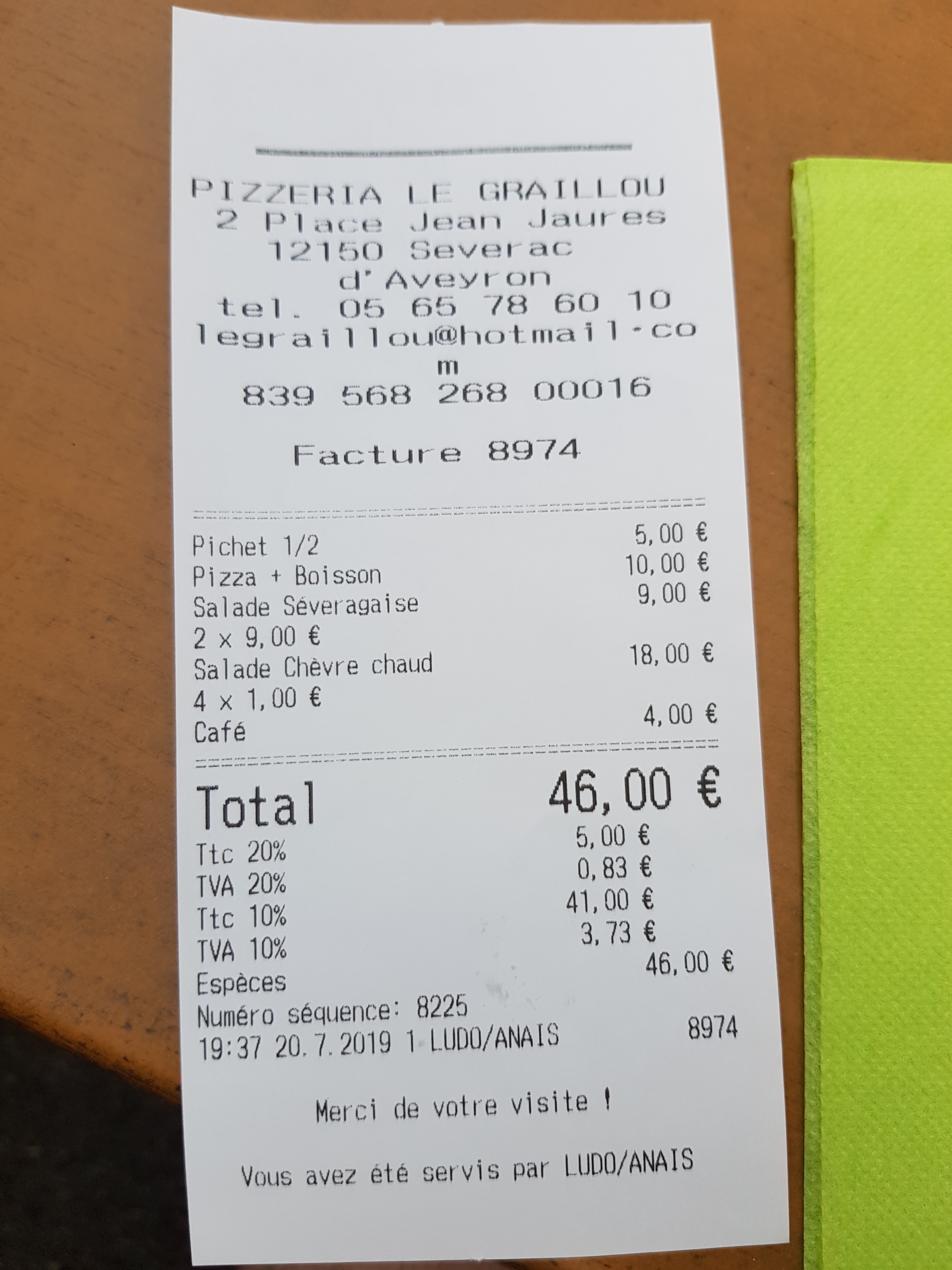 Le Graillou, restaurant trouvé au hasard dans le centre-ville. A proximité immédiate de la gare de Sévérac-le-Château, possible de se garer proche de la pizzeria. Accès pour handicapés Prend en compte également les allergies alimentaires. Pour en revenir à la pizzeria, large choix de Salade, Paninis, Pizzas...etc...pour franchement pas chère ! Assiettes garnis, pizzas gourmandes et surtout personnel à l'écoute ! . Surpris par le prix du café ! 1€ en terrasse !!! Plusieurs années que je n'avais pas vu un prix aussi bas pour un café servi en terrasse ! Je recommande vivement cet endroit. Ma remarque : ✔Établissement recommandé !