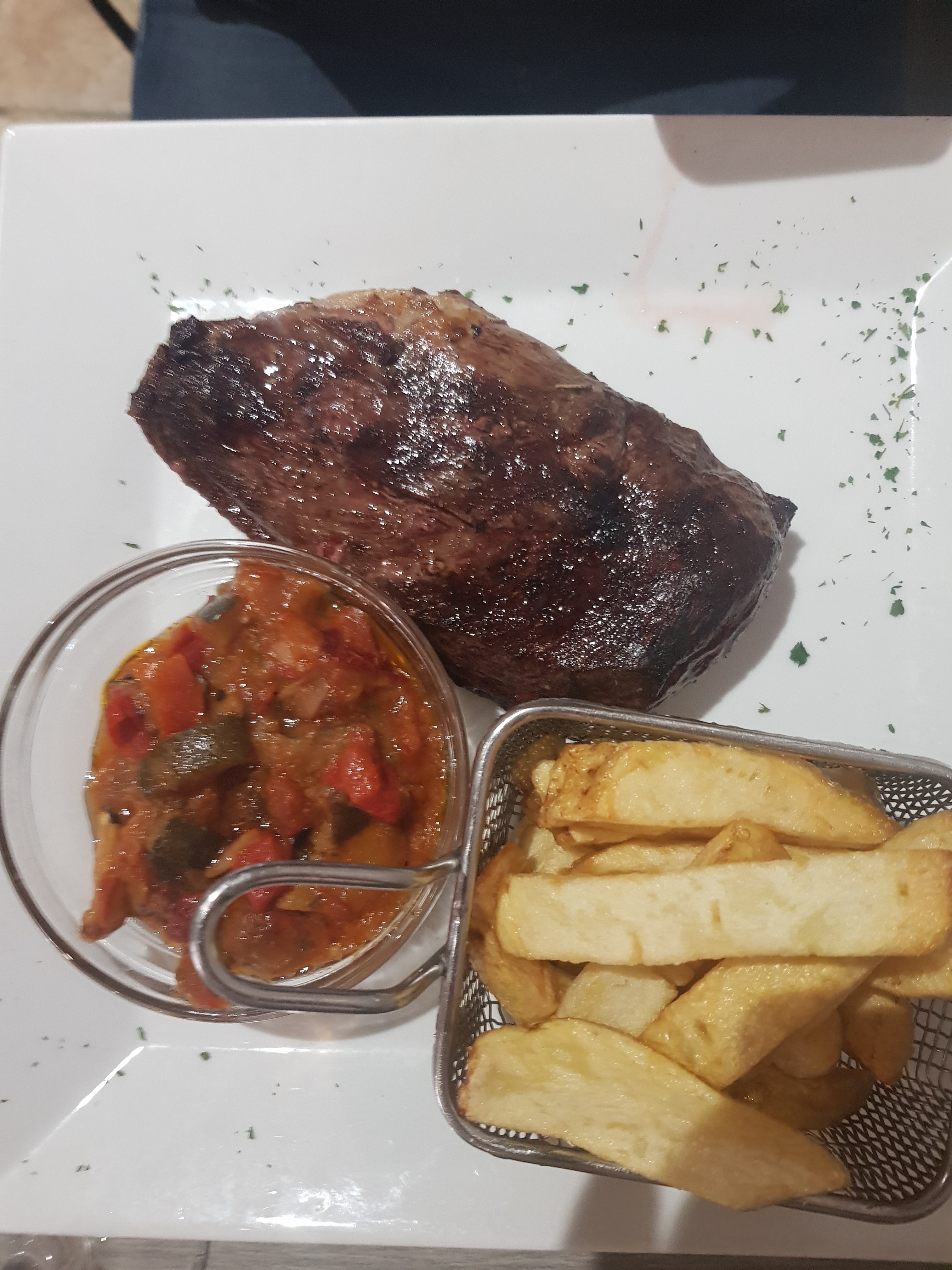 Accueil sympathique Cadre à l'ancienne un peu trop gris, ça ne donne pas trop envie au premier regard. Mais on s'y fait. Restauration pas mal, pour ma première côte de taureau. J'ai juste trouvé dommage le manque de sauce et un petit panier rikiki avec quelques frites qui se balladent..