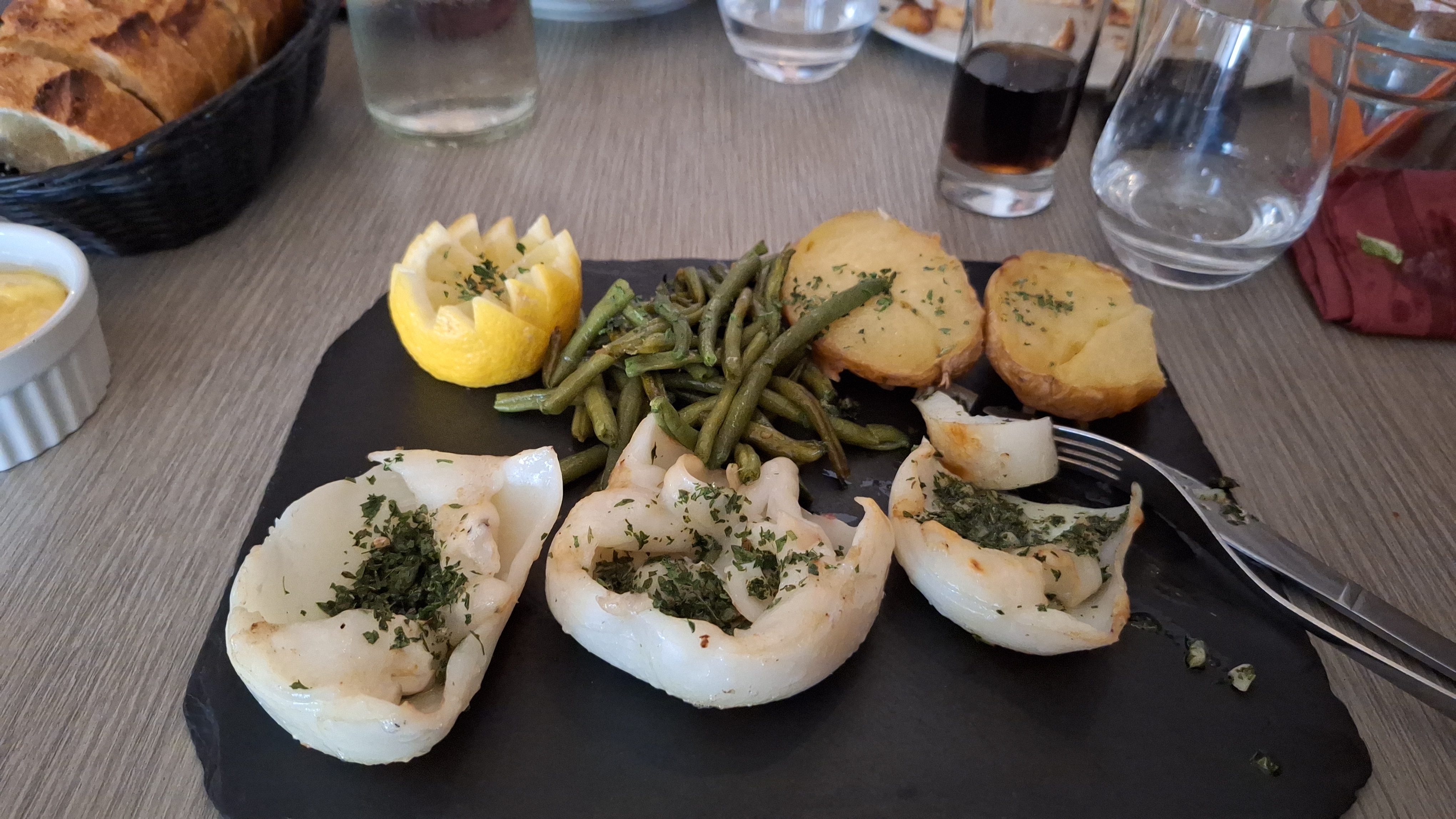 Très belle soirée passée sous une agréable tonnelle de muriers pleine de fraîcheur pour déguster d'excellents plats notemment des moules gratinées et encornets farcis sans oublier les seiches grillées et d'excellents desserts le tout servi par un personnel très agréable et à l'écoute très bon rapport qualité-prix à recommander