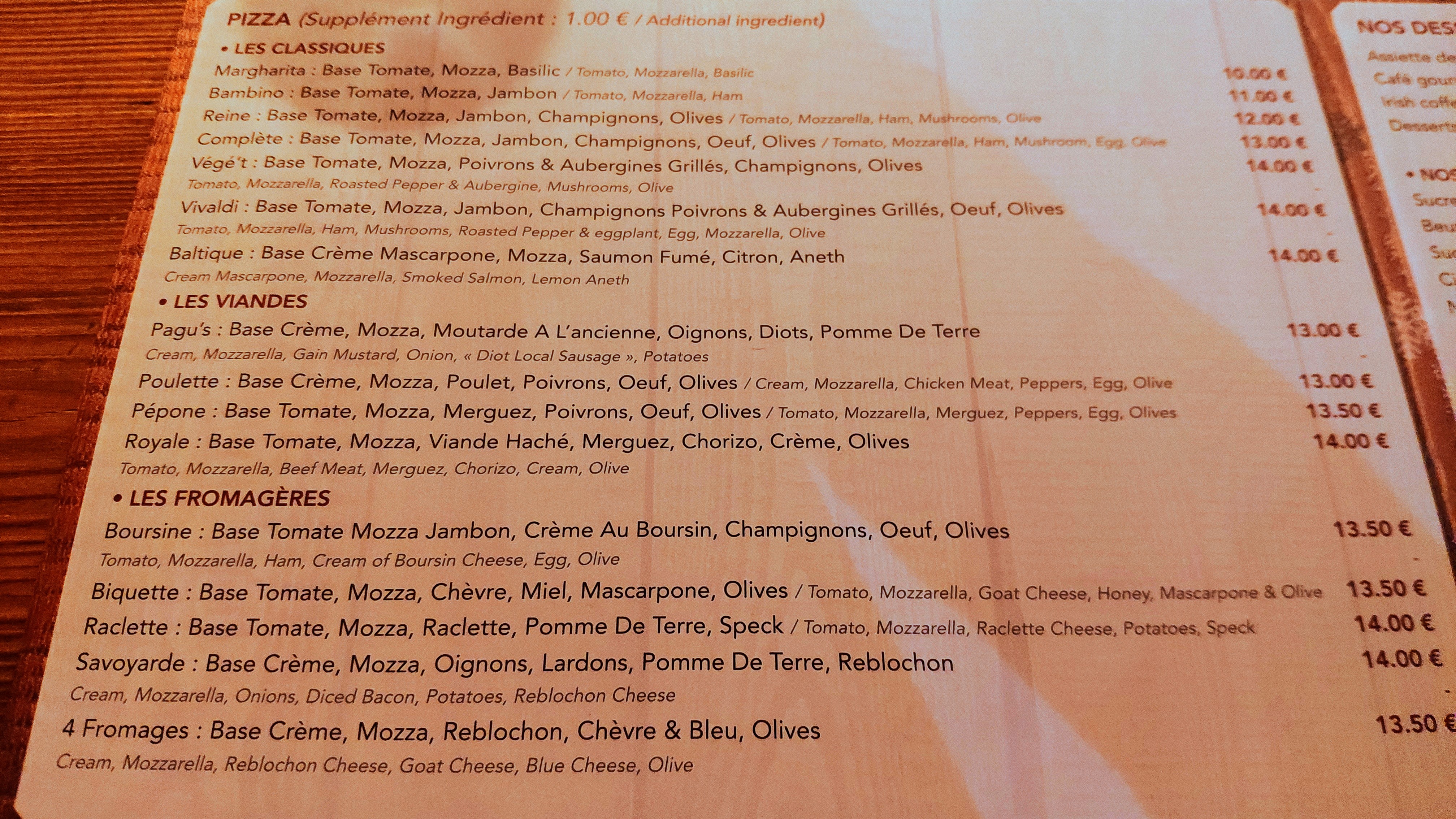 Super petit restaurant! Pizzas excellentes (prix allant de 12€ a 14€), beaucoup de garniture et fait maison! Pas eu l'occasion de gouter la chevriflette qui m'a vraiment l'air super! Le tiramisu aux fruits rouges et spéculoos était vraiment excellent! Je conseil vivement! Attention, ouvert uniquement le soir et midi et soir le week-end. En plus super acceuil et servir rapide! Hâte d'y retourner!