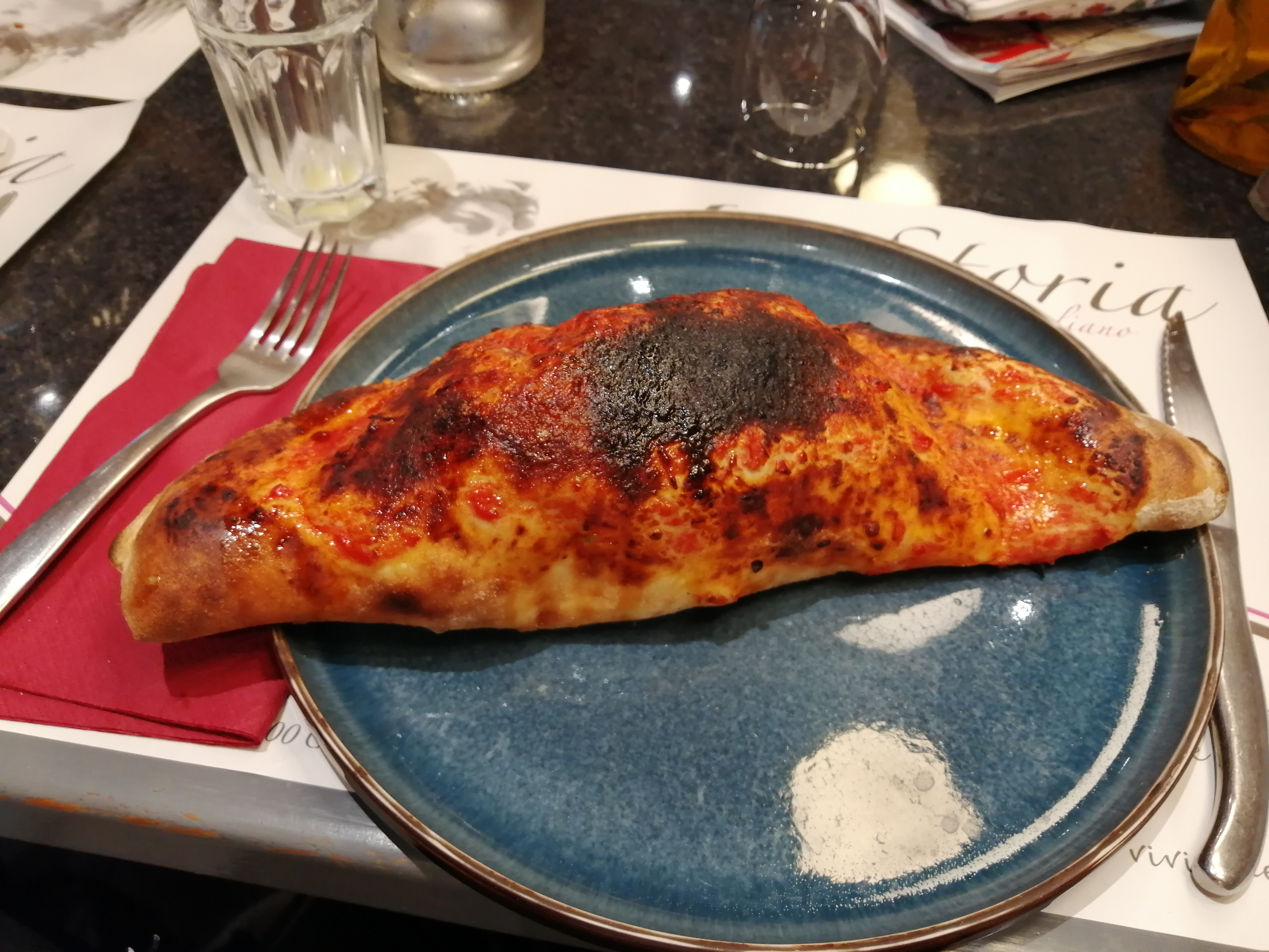 Calzone brulée à l’extérieur, crue à l’intérieur. Cher pour une pizza n’occupant qu’un tiers de l’assiette, voire un quart.