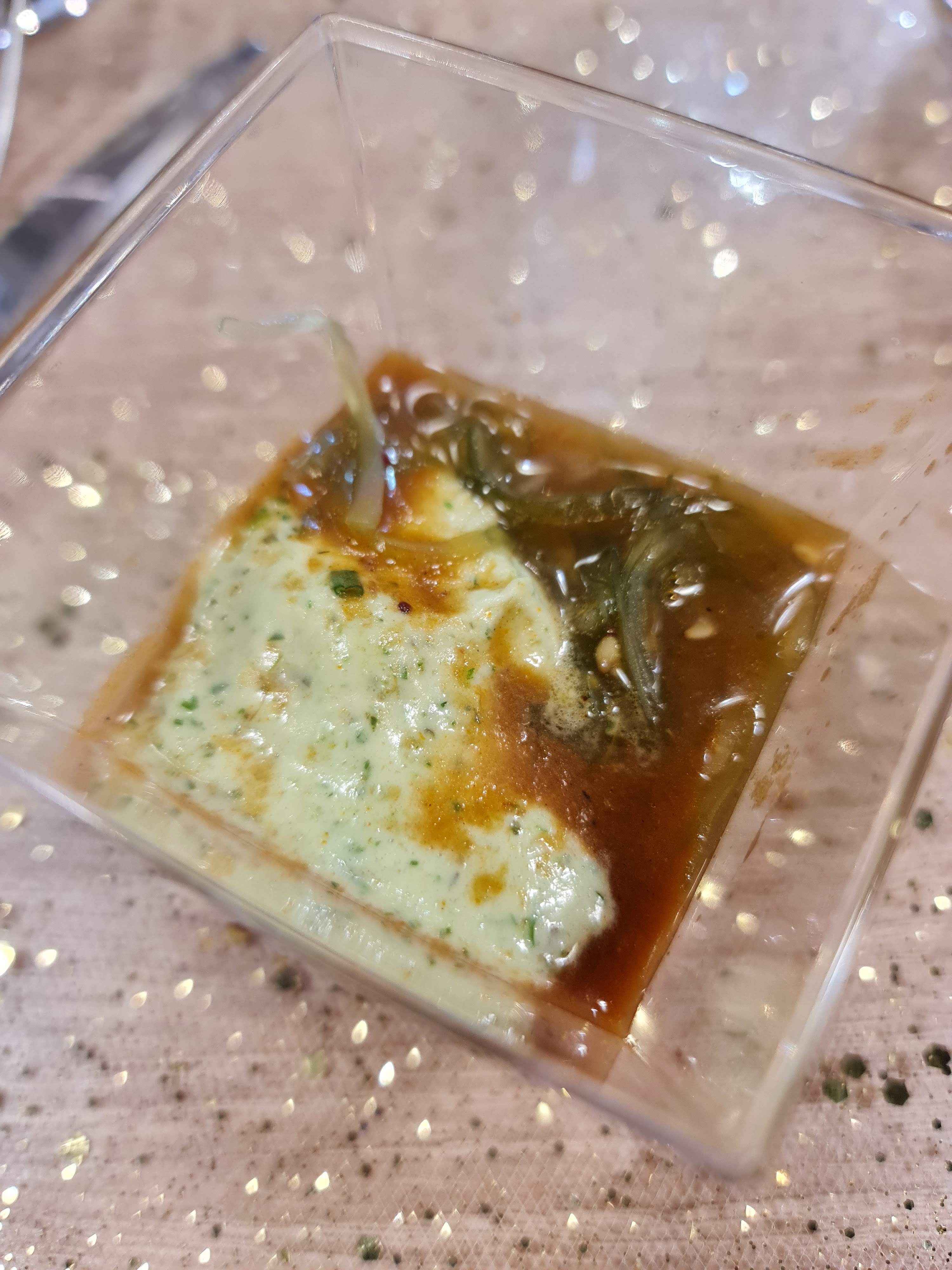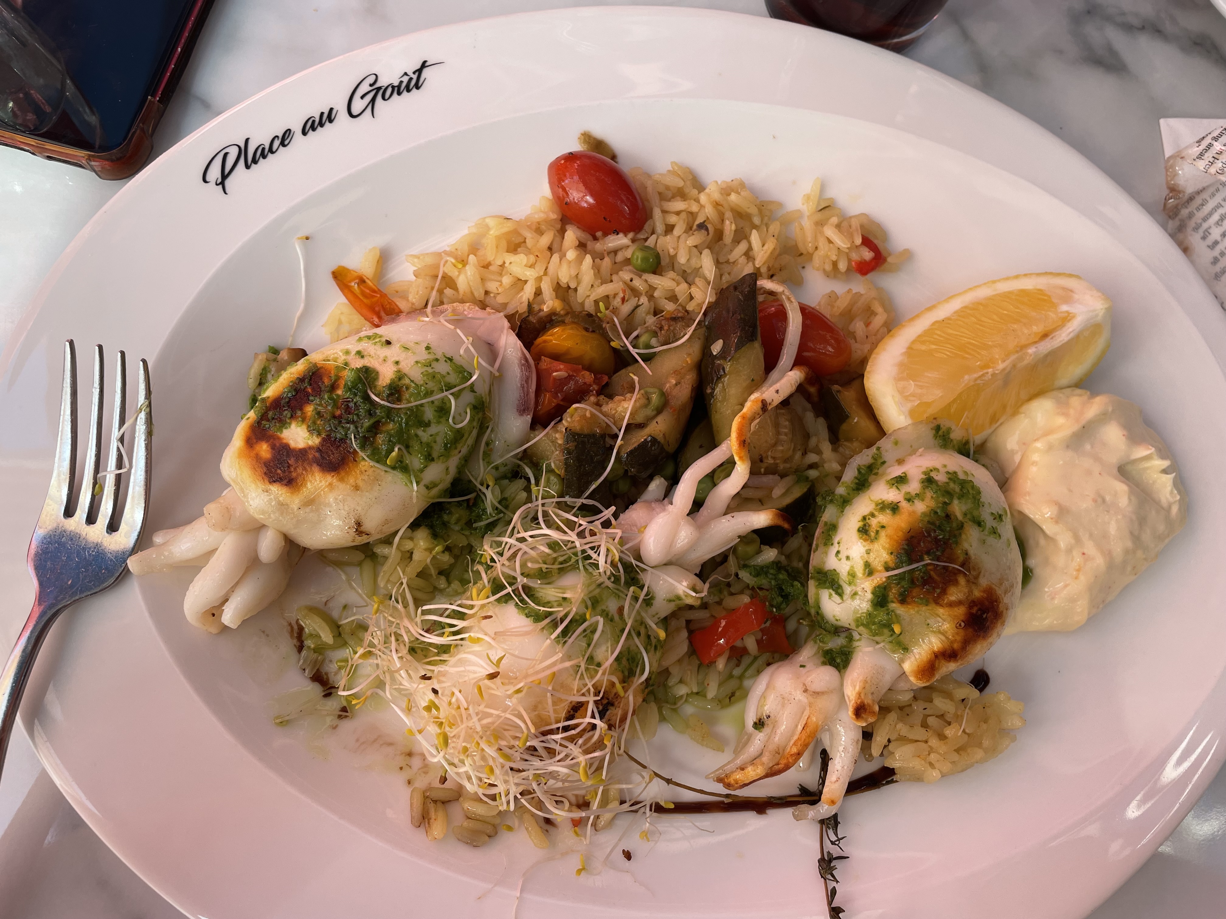 Une découverte et j'y retournerai c'est sûr ! Mon choix s'est porté sur une petite salade fraîcheur. De loin je vois un serveur avec une très grande assiette et je dis à mon mari ya des assiettes elles sont énormes ! ... c'était la mienne ! Pas moins de 14 ingrédients différents dont des gouttes de poivrons délicieuses que je ne connaissais pas. Repas complet et frais. Même pas peur un café gourmand très bon après. Le serveur très gentil et souriant. What else ?!!!!