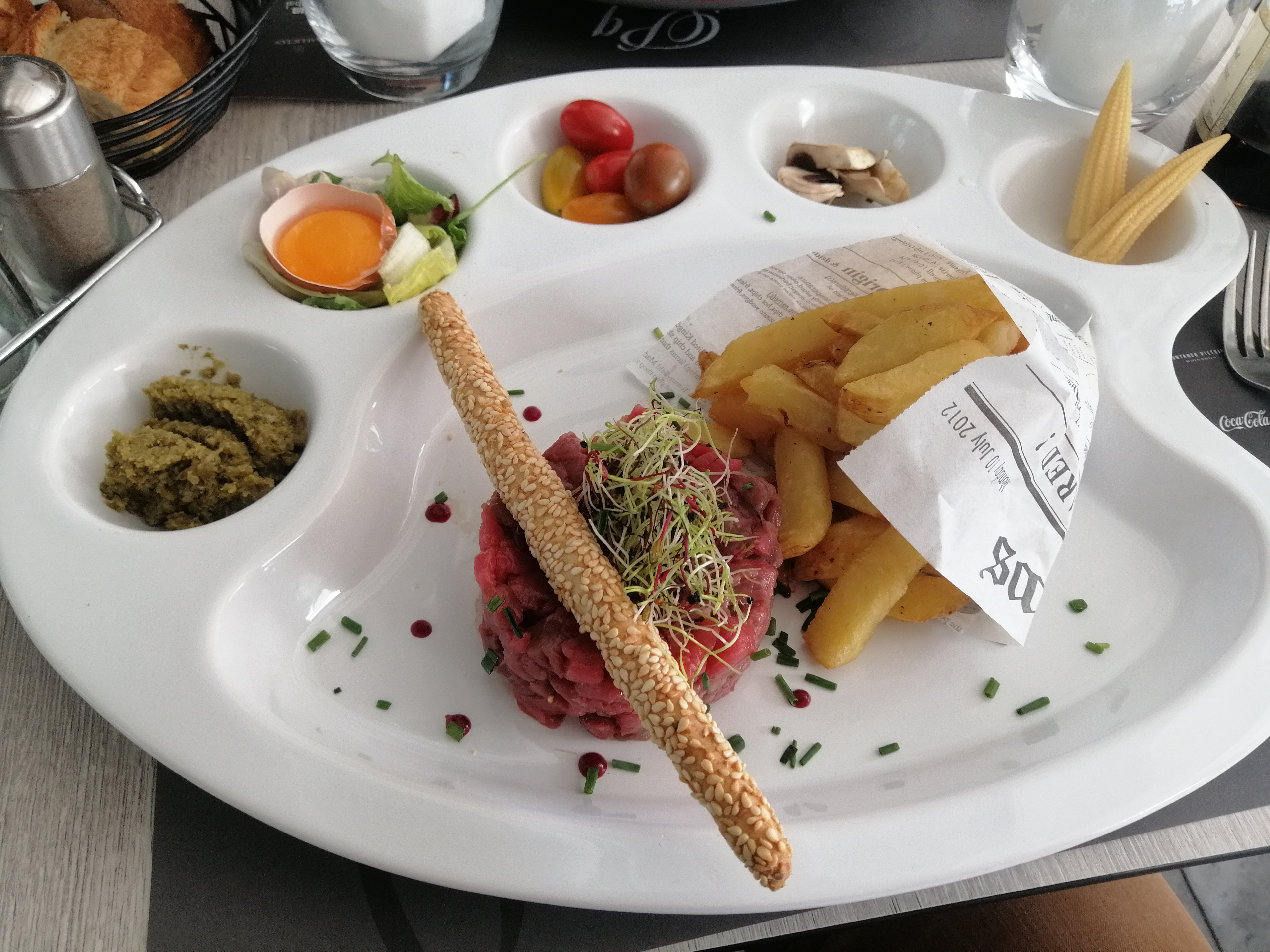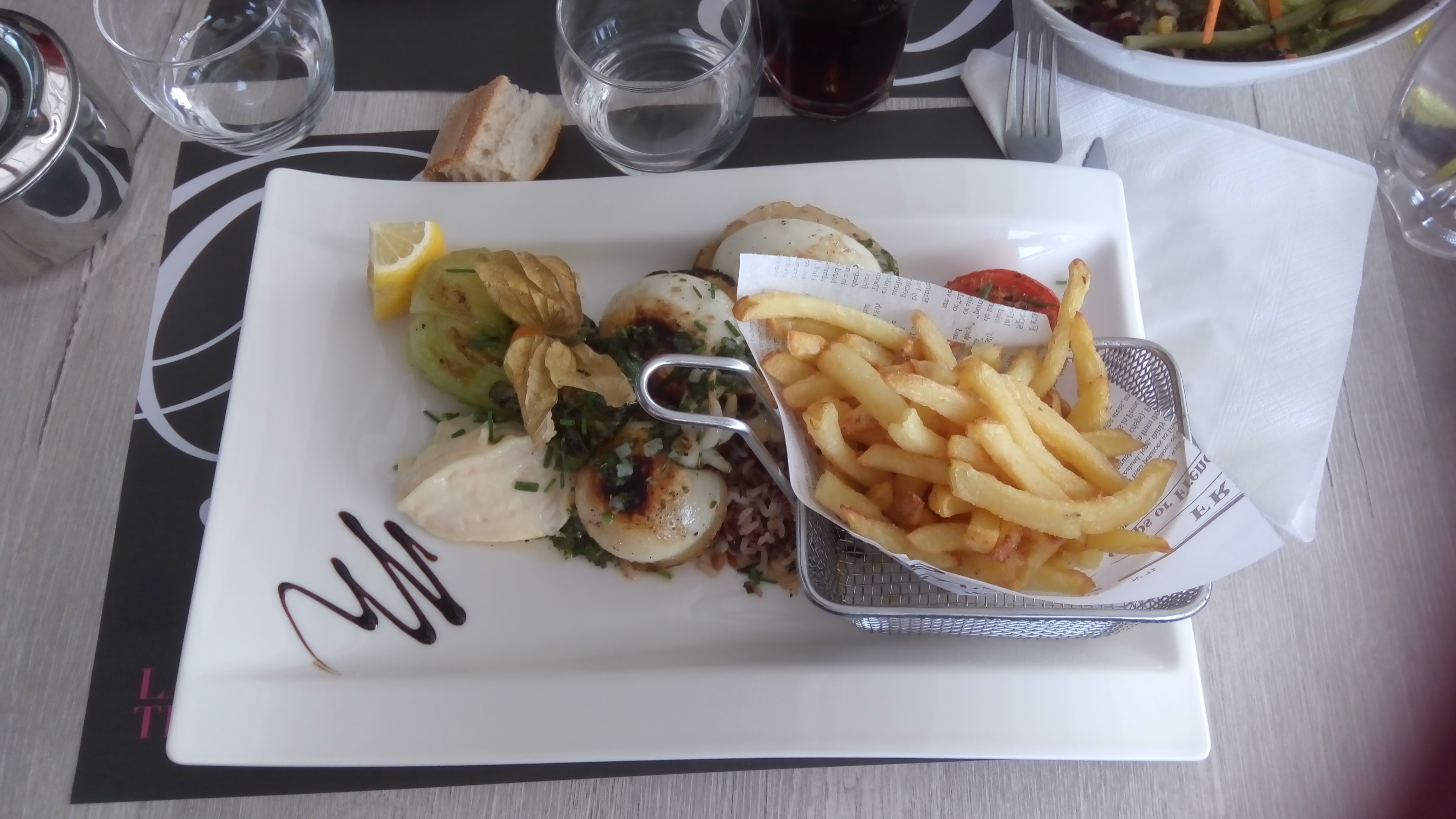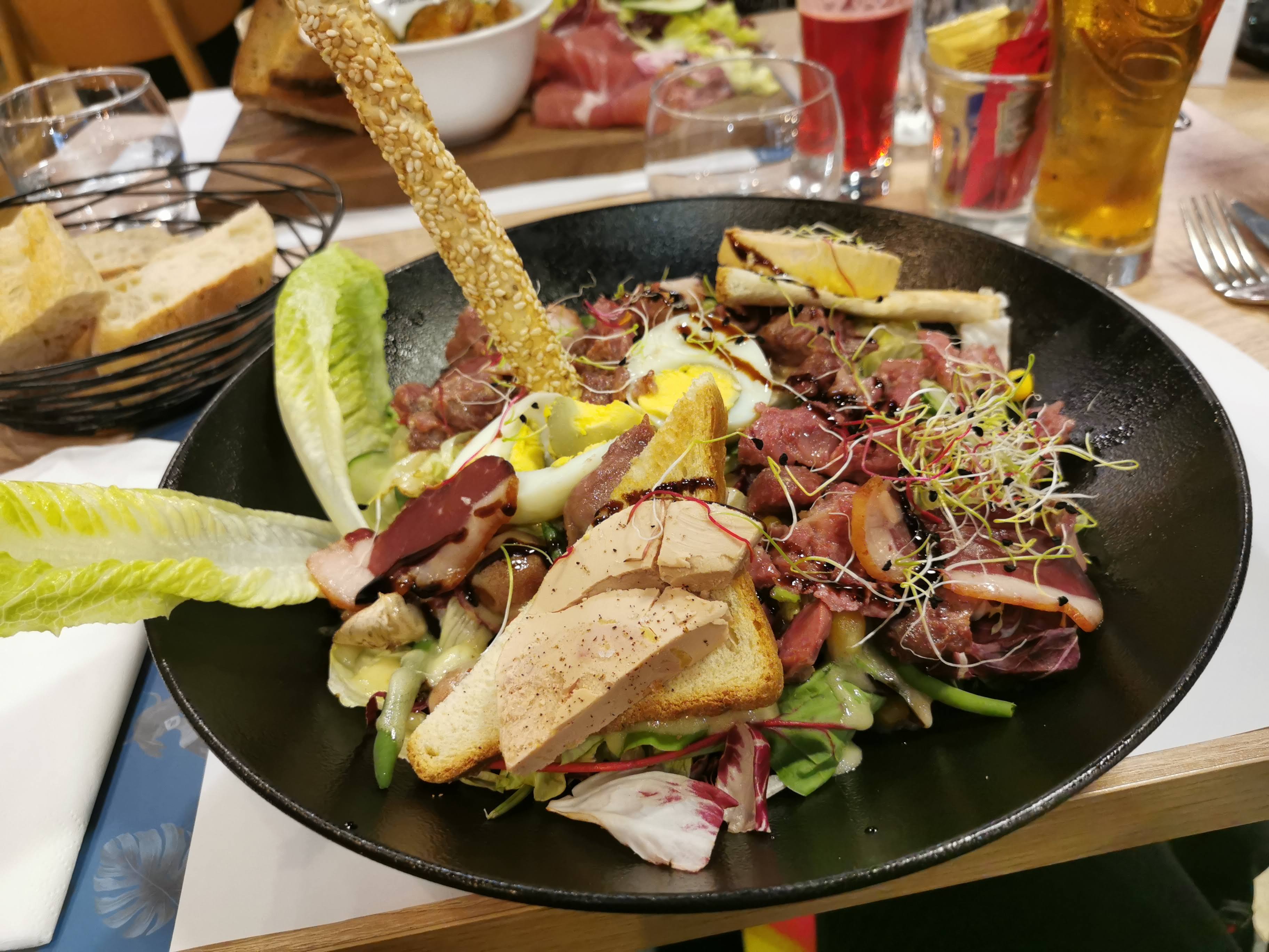 A peine assis que l'on demande déjà ce qu'on veux boire. Le service est rapide, une salade composée très copieuse or mis la découverte d'un mouchoir au fond de l'assiette.