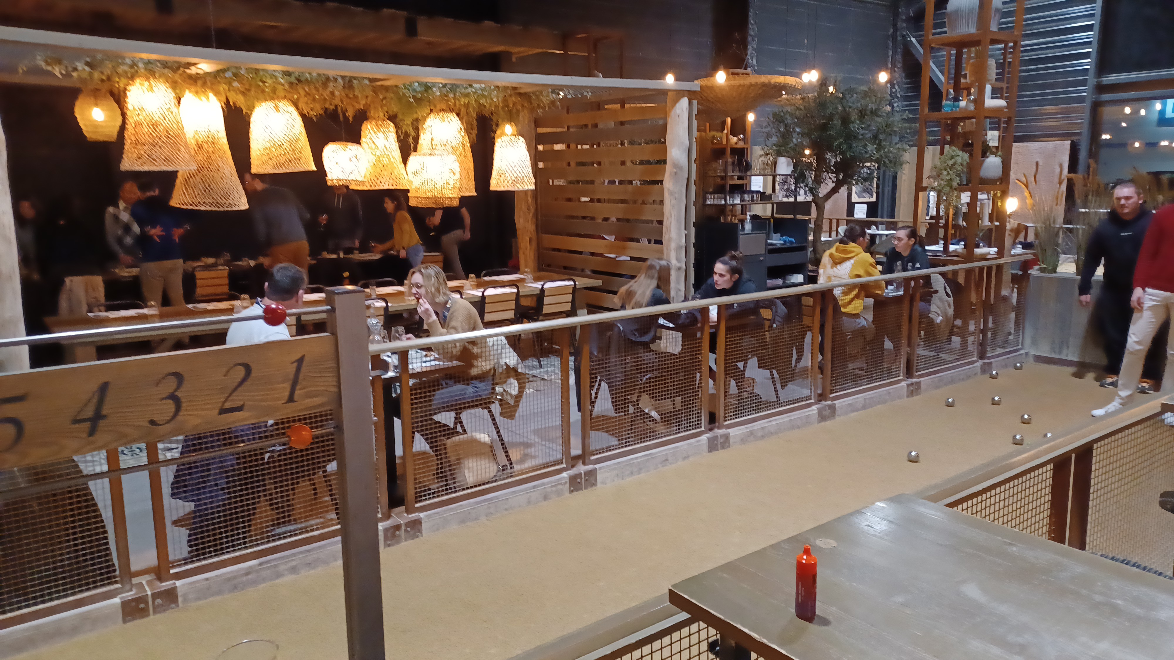 Pour notre part , arrivée à 2 donc moins intéressant que les grosses tablée servi en dernier, vu l heure choix rapide car cuisine ferme 40 min plus tard, pas le droit droit comme par hasard à jouer aux boules malgré 2 terrain vide , le service pas trop agréable bref malgré l envie de jouer sur la moquette je ne pense vraiment pas revenir un conseil ne vous placé pas au extrémité des terrains . Trop bruyant