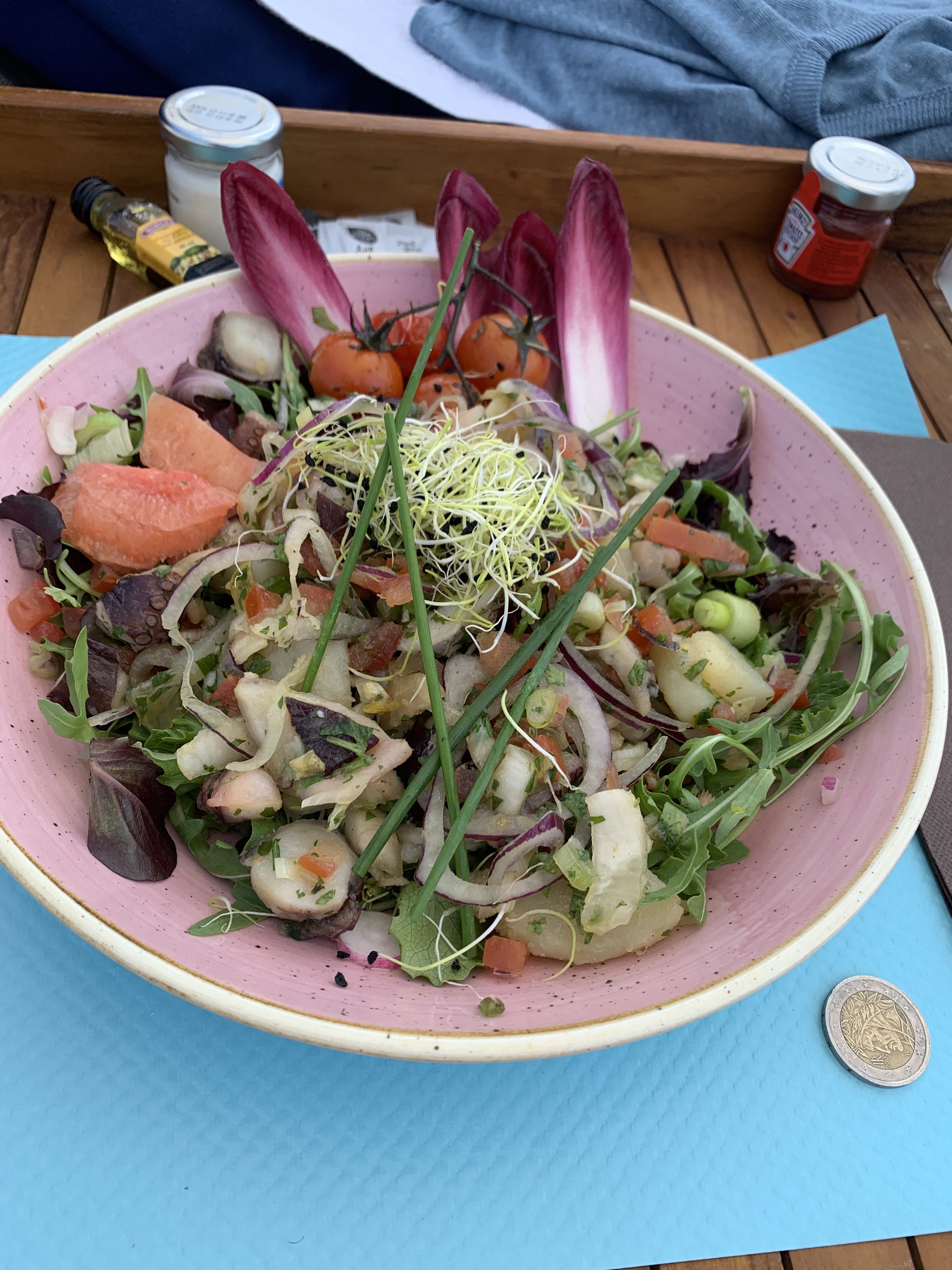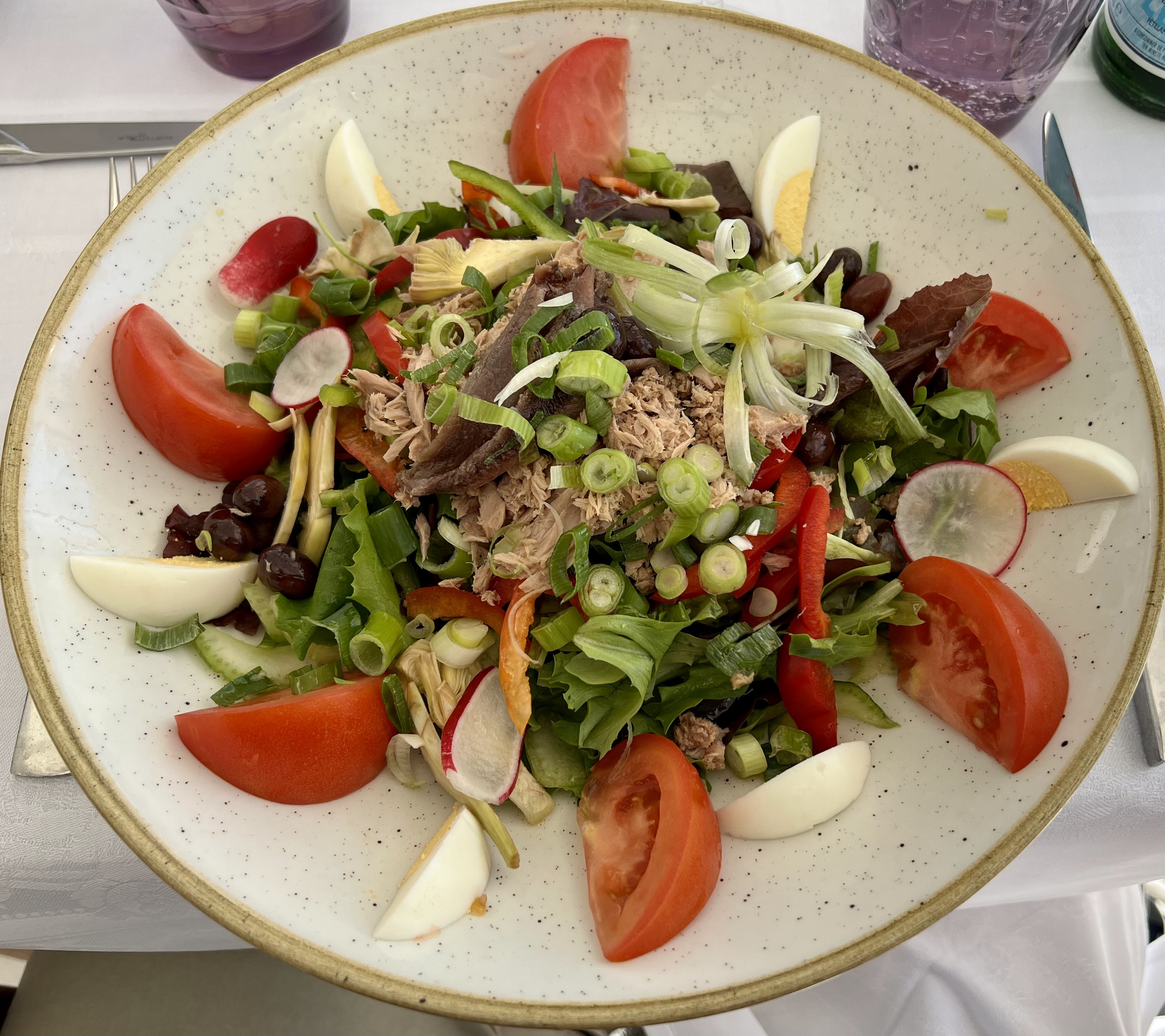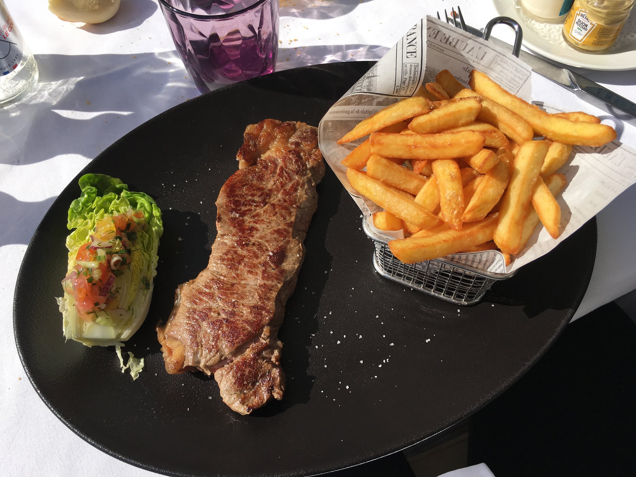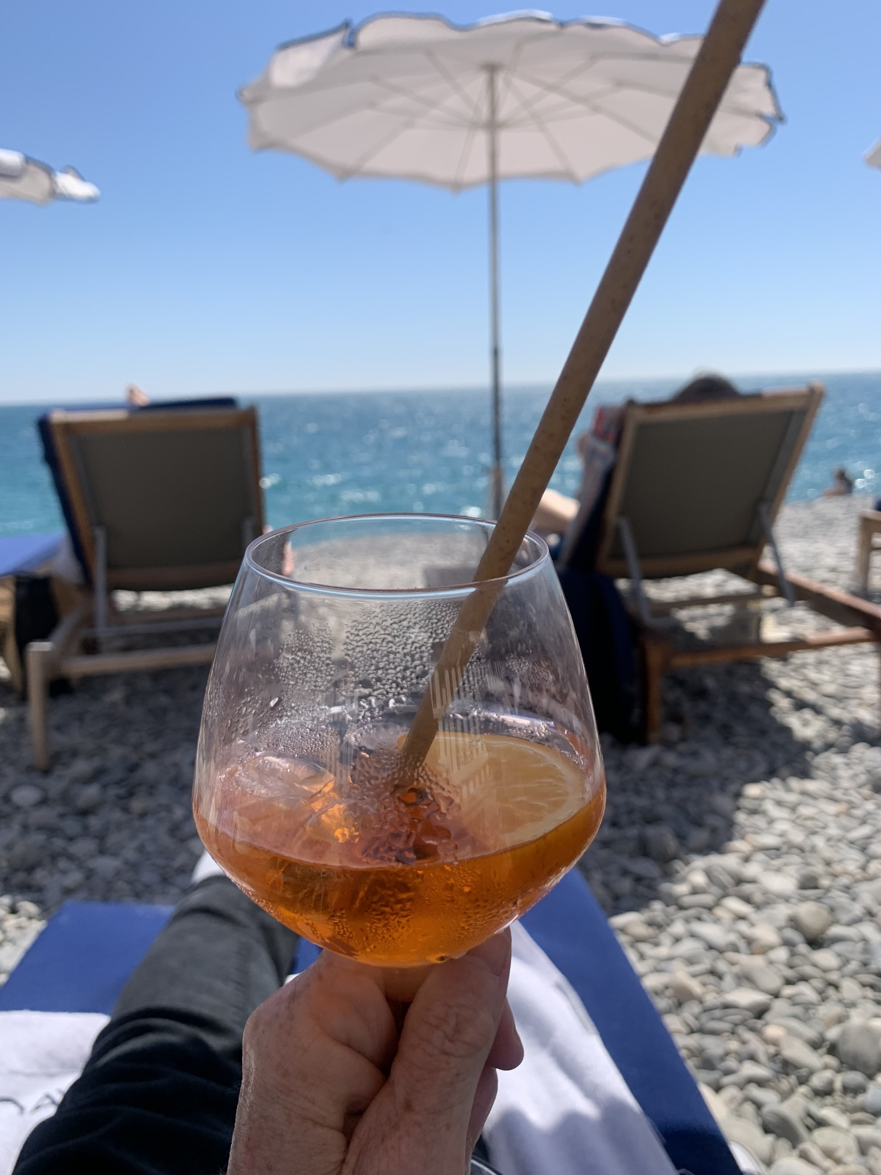 Nous attribuons cinq étoiles en fonction de l'emplacement, de la nourriture et du service. Nous souhaitions manger léger, ce qui signifiait leurs gnocchis et une salade Nissarda. C'était aussi partager un assemblage Minuty Sauvignon Blanc / Grenache Blanc. Cette bouteille était légère et croustillante et nous convenait parfaitement. Nous sommes allés un peu trop loin pour prendre les profiteroles, mais nous les avons partagées et elles étaient légères et recouvertes de crème fouettée et de chocolat. Nous avons dû marcher le reste de l'après-midi pour surmonter ce merveilleux déjeuner tardif. C'est un endroit merveilleux pour déjeuner si tard et passer du temps à regarder la Méditerranée faire… absolument rien.