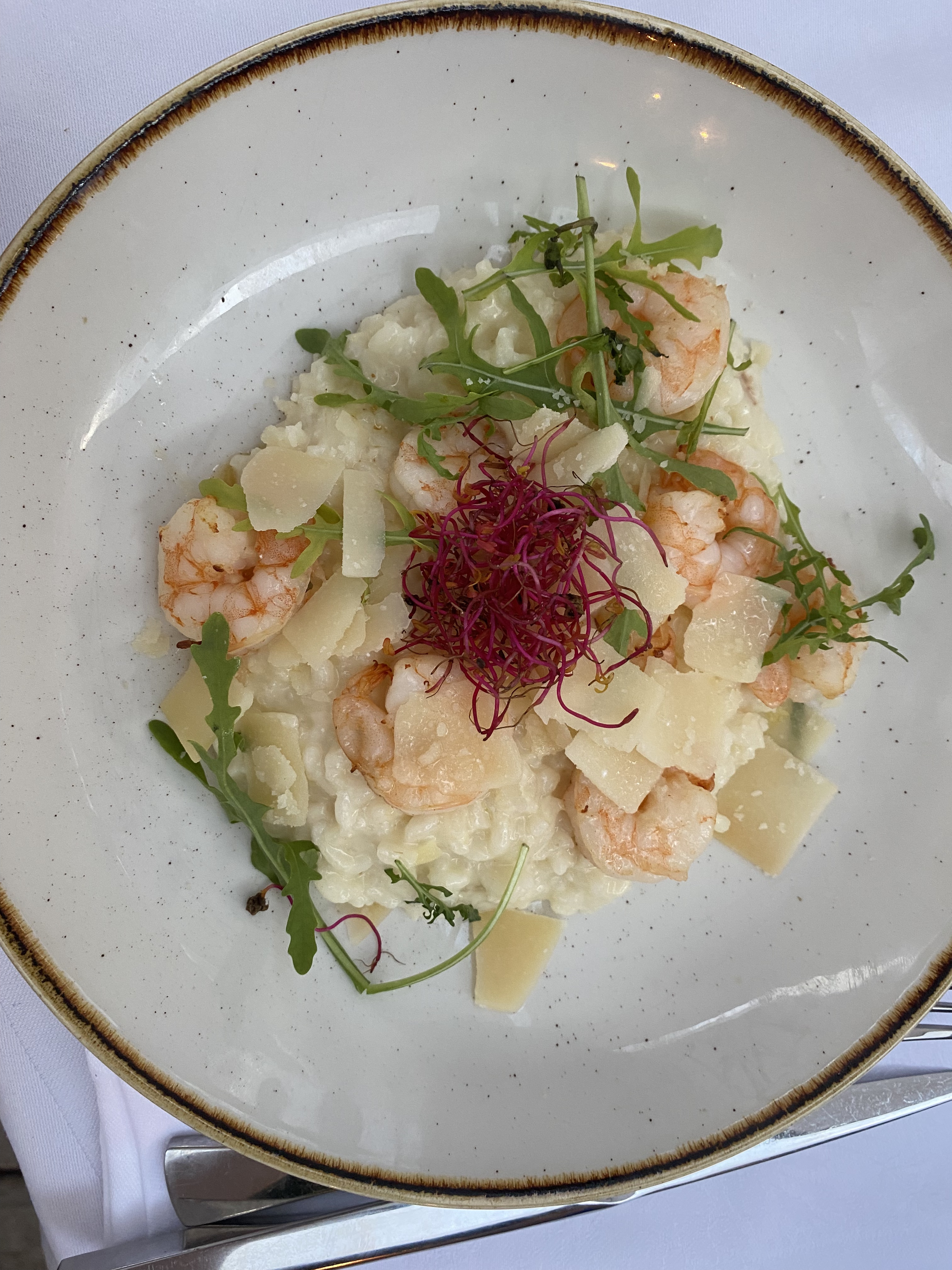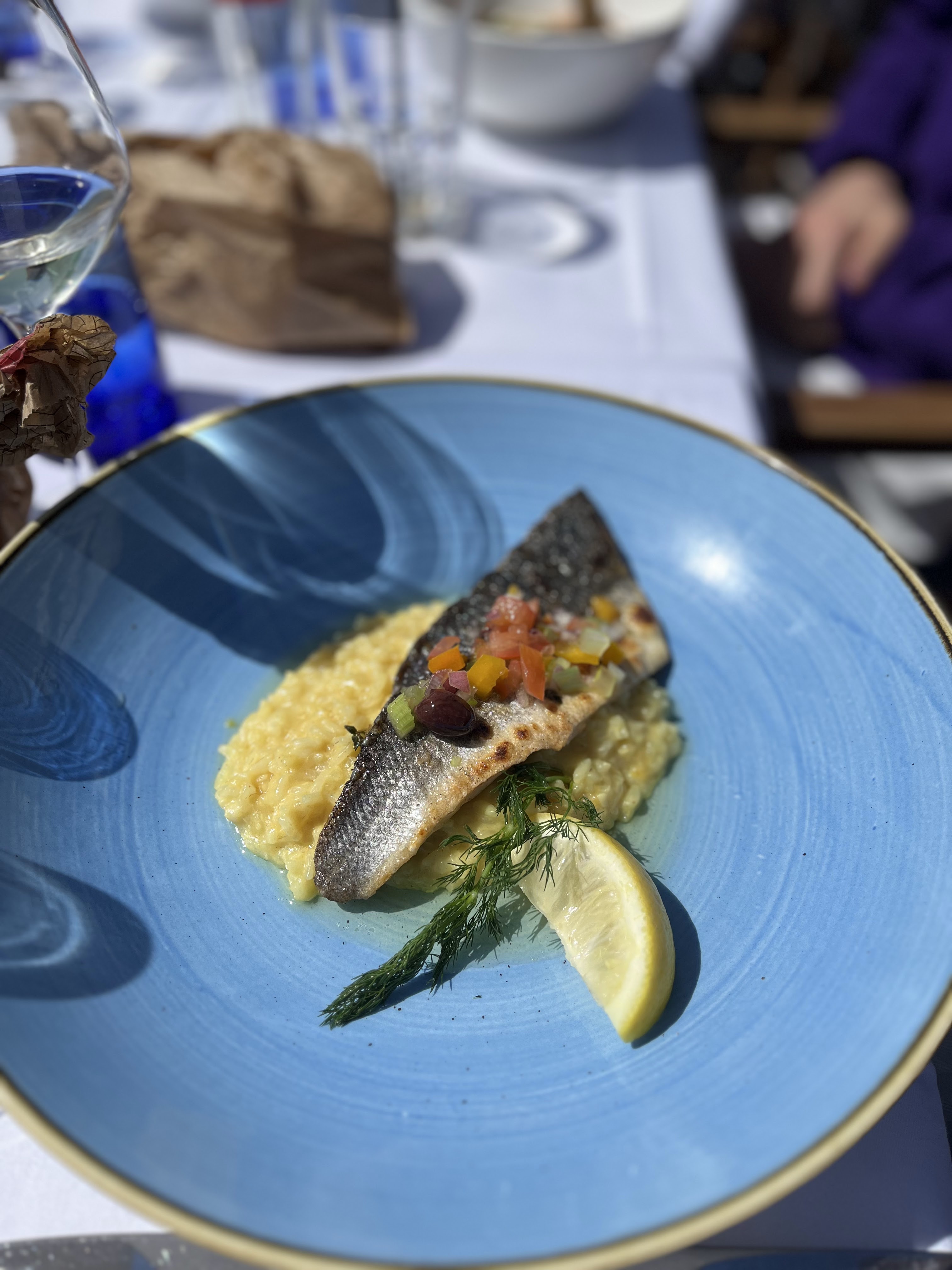 J'ai eu le risotto aux pétoncles que j'ai vraiment adoré ! Le riz était cuit à la perfection et les fruits de mer étaient frais et avaient un goût incroyable. Le placage était bien aussi. Le pain était frais et copieux. Leur cocktail sans alcool était correct, mais rien de spécial en toute honnêteté. Le restaurant est directement sur la plage, donc la vue est superbe et l'air marin est merveilleux. L'ambiance était vraiment sympa dans le restaurant, car il y avait de la bonne musique, à un volume agréable. Tout le personnel était vraiment sympa, en particulier le maître d'hôtel, qui était très arrangeant et sympathique, et qui portait une tenue incroyable))) Dans l’ensemble, c’est une expérience formidable, que je recommanderais sans hésiter à tous ceux qui souhaitent prendre un repas de qualité tout en profitant de la mer et d’un peu d’air frais en même temps.