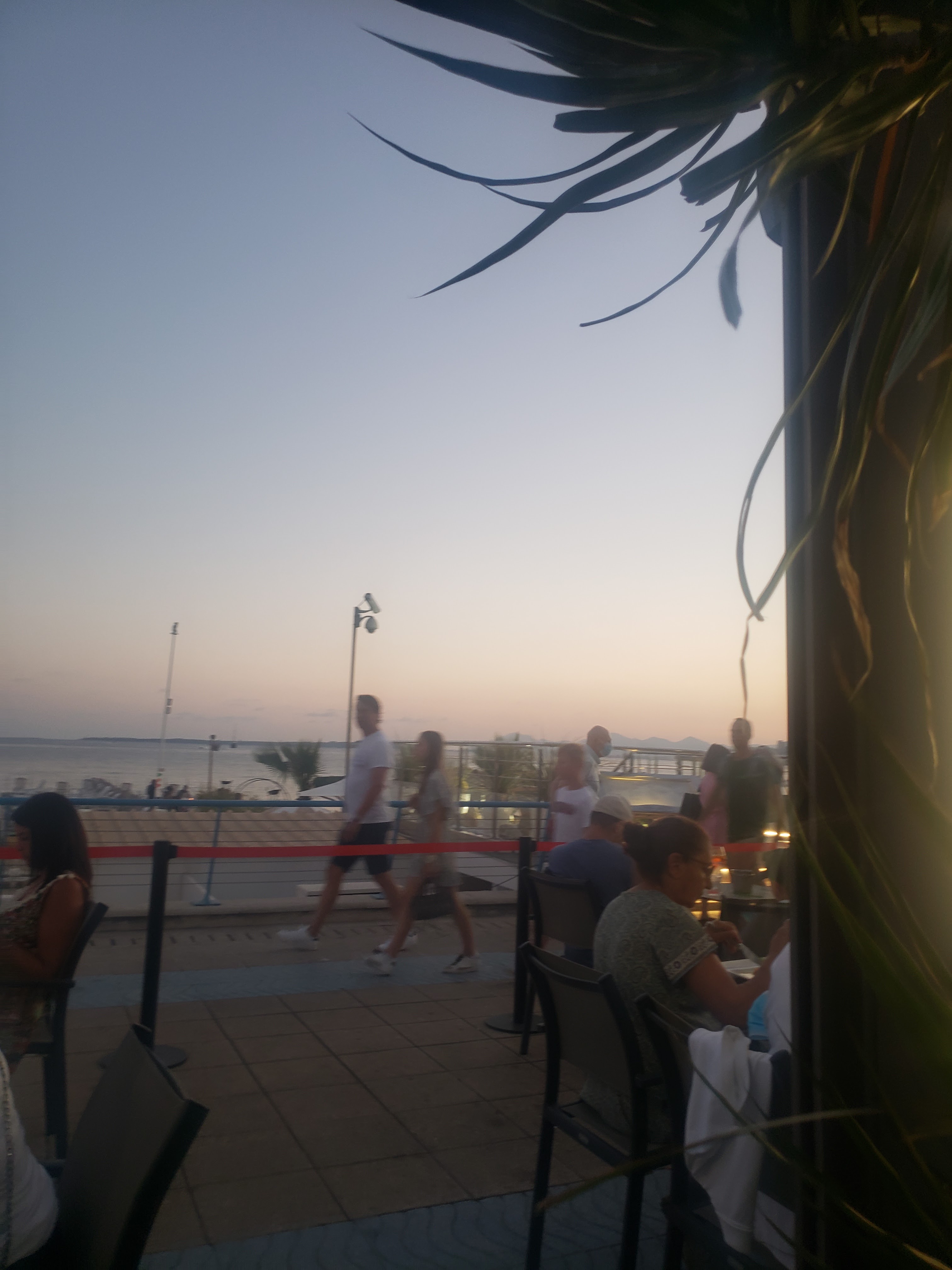 Lieu sympa le long de la promenade qui longe la mer à Juan les pins. Choix pour boire un verre. Le vin était très bon et j ai apprécié que la serveuse apporte des petits toasts de tapenade pour déguster avec le verre. C est un petit plus qui fait la différence et qui se fait rare.