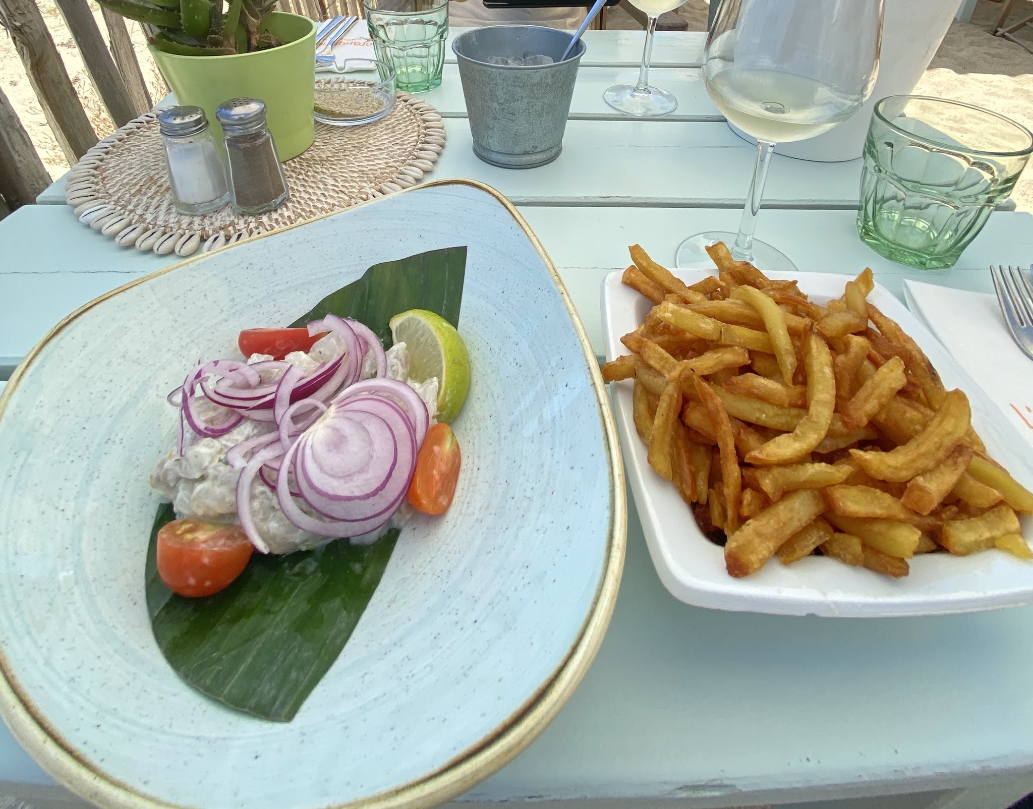 L'environnement est tres sympa ambiance des iles. parking payant obligatoire... tarif élevé par rapport aux prestations. menu enfant à plus de 20 balles pour 1 steak frites... 1 ricard à 6 balles... 1 verre de rosé 8 balles... ( le prix d une bouteille ) 1 mojito à 15 balles le plat du jour est bon mais la portion est tres light on va pas s étouffer... 25 balles 1 salade de fruits à 15 balles apres midi plage : transat 1/2 journée interdit obligation de payer la journée complète meme si on arrive après le repas... supplement parasol 5 € on avait jamais vu ça. la plage est superbe. une bonne 1/2 journée mais un sentiment d attrape touristes.