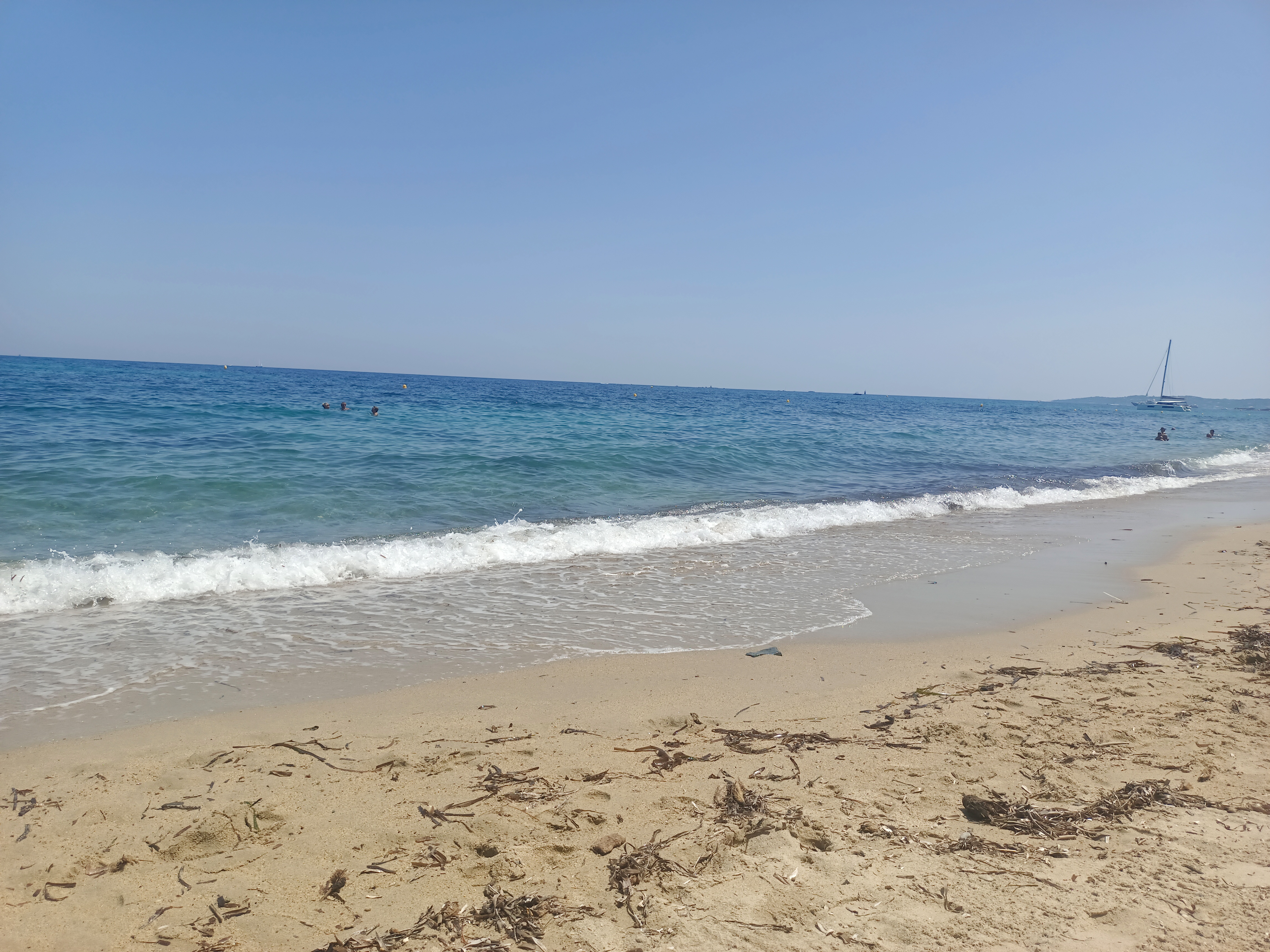 La plage est belle. Dommage qu'il y ait des algues sur le bord de la plage. En s'éloignant du bord de l'eau. L'eau est magnifique