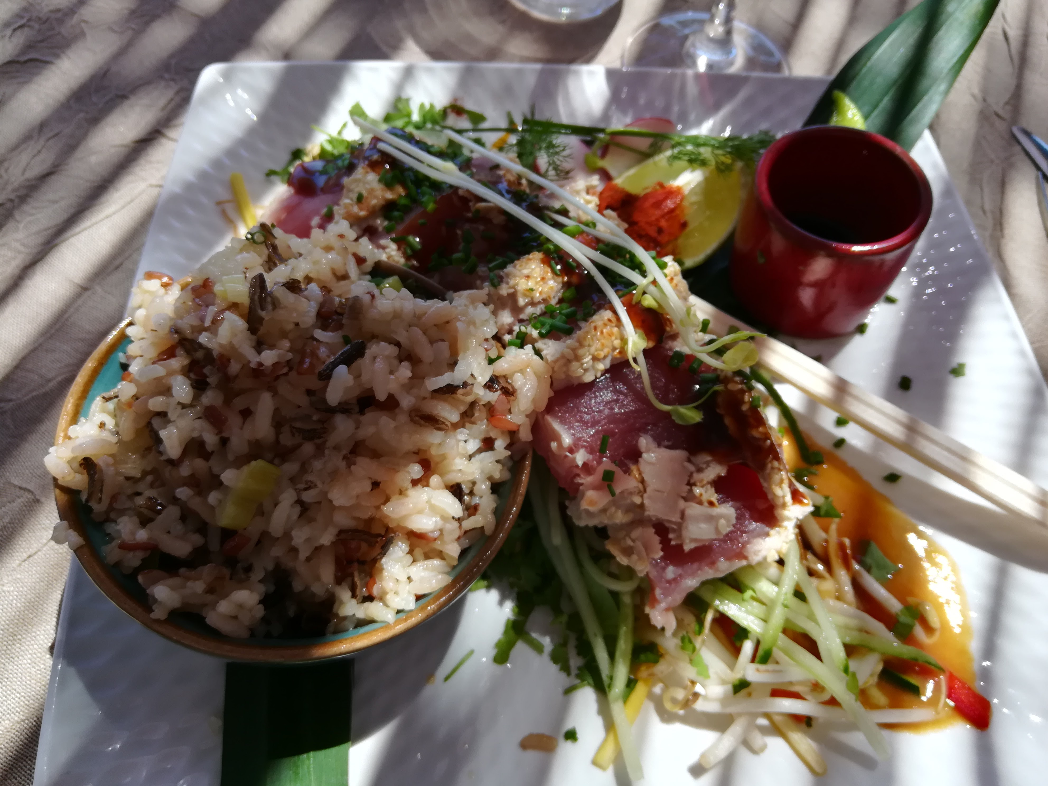 Hélas pour nous le lieux a changé. Les prix ont flambé. 32€ un tataki de thon et 26€ une salade thai. Mais surtout 12€ une salade de fruits servie dans un bol abîmé, c'est abusé. Étant du coin, on passera notre chemin.