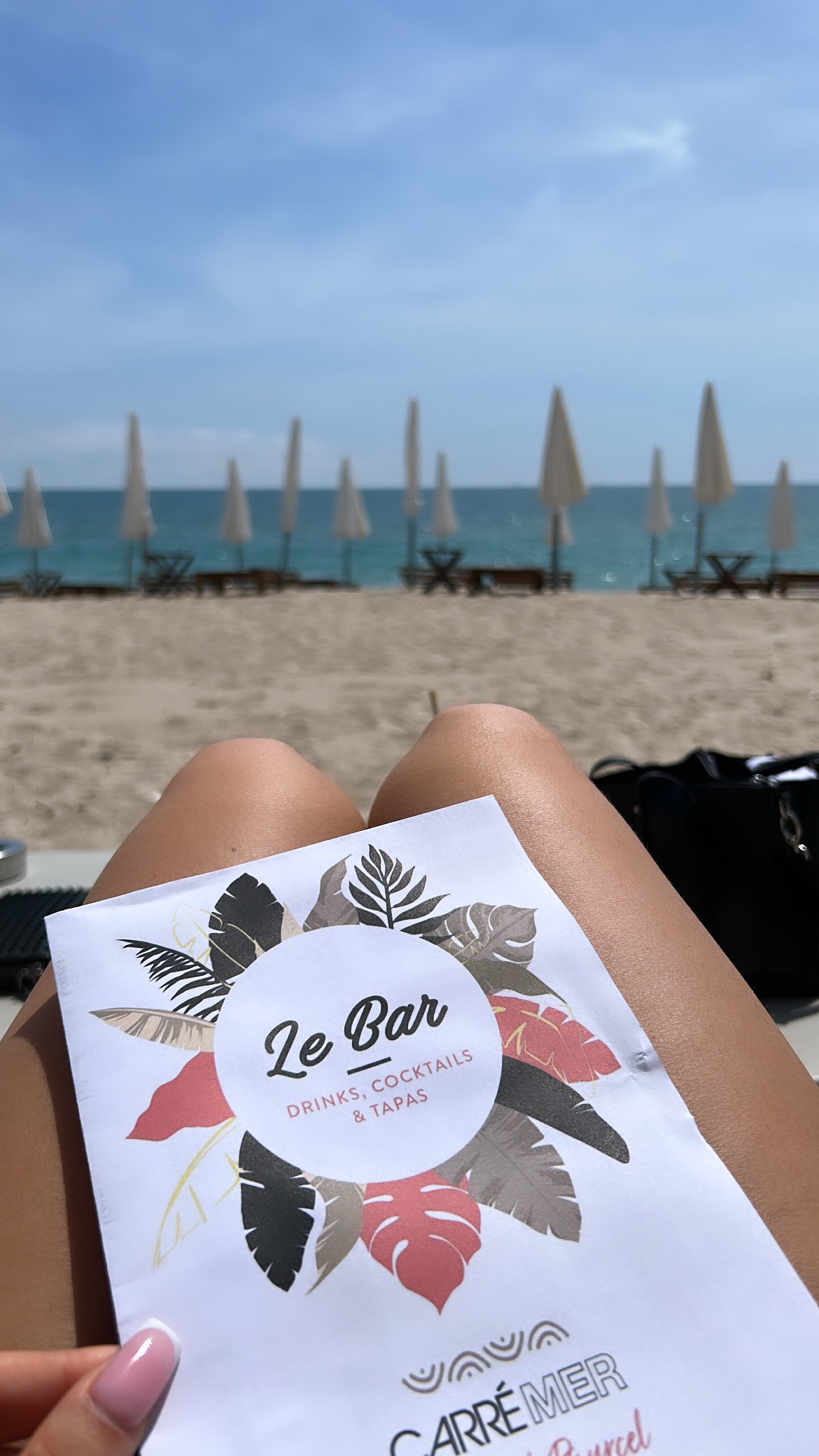 Toujours dans mon TOP 3 des plages privées de Montpellier! Le Carré Mer (blanc) reste constant depuis son ouverture il y a 11 ans. Toujours une belle décoration recherchée qui laisse libre court à notre envie de voyage du côté de Bali. Blanc et bleu à perte d'horizon. Une journée sur la plus jolie plage de Montpellier, Villeneuve-les-Maguelonne est toujours un bonheur surtout lorsqu'on est chouchouté par une équipe bienveillante. Pour le déjeuner, sur transat ou à table, l'accueil et le service sont très professionnels. Les tables ne sont pas trop serrés et le service est rapide. La cuisine est variée (même si la carte ne change pas trop d'année en année), il y en a pour tous les goûts des petits aux plus grands. Évidement on dira que les prix sont un peu chers mais on dira aussi c'est une plage privée, on sait où on va. C'est toujours la première plage privée que nous faisons car elle sort en premier de sable et c'est celle où nous retournons très souvent tout l'été... jamais déçus!