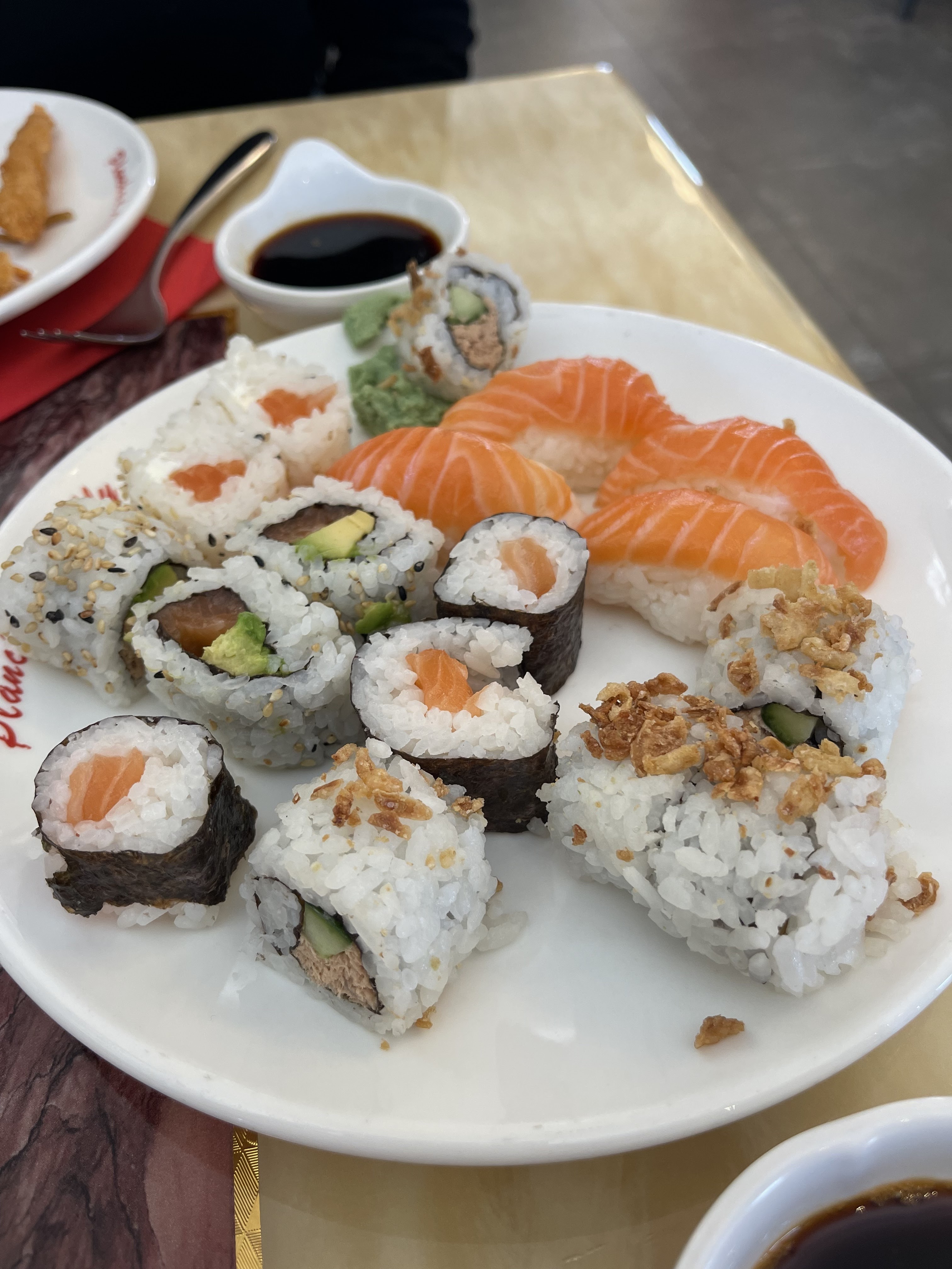 On y va un dimanche soir, pas trop de monde, cest agréable. Bien garnie, beaucoup de choix. Sushi Maki super bien fait, plancha et wok super bon. Les cuisiniers font souvent le tours pour faire le plein et les serveurs retirent souvent les assiettes vides.