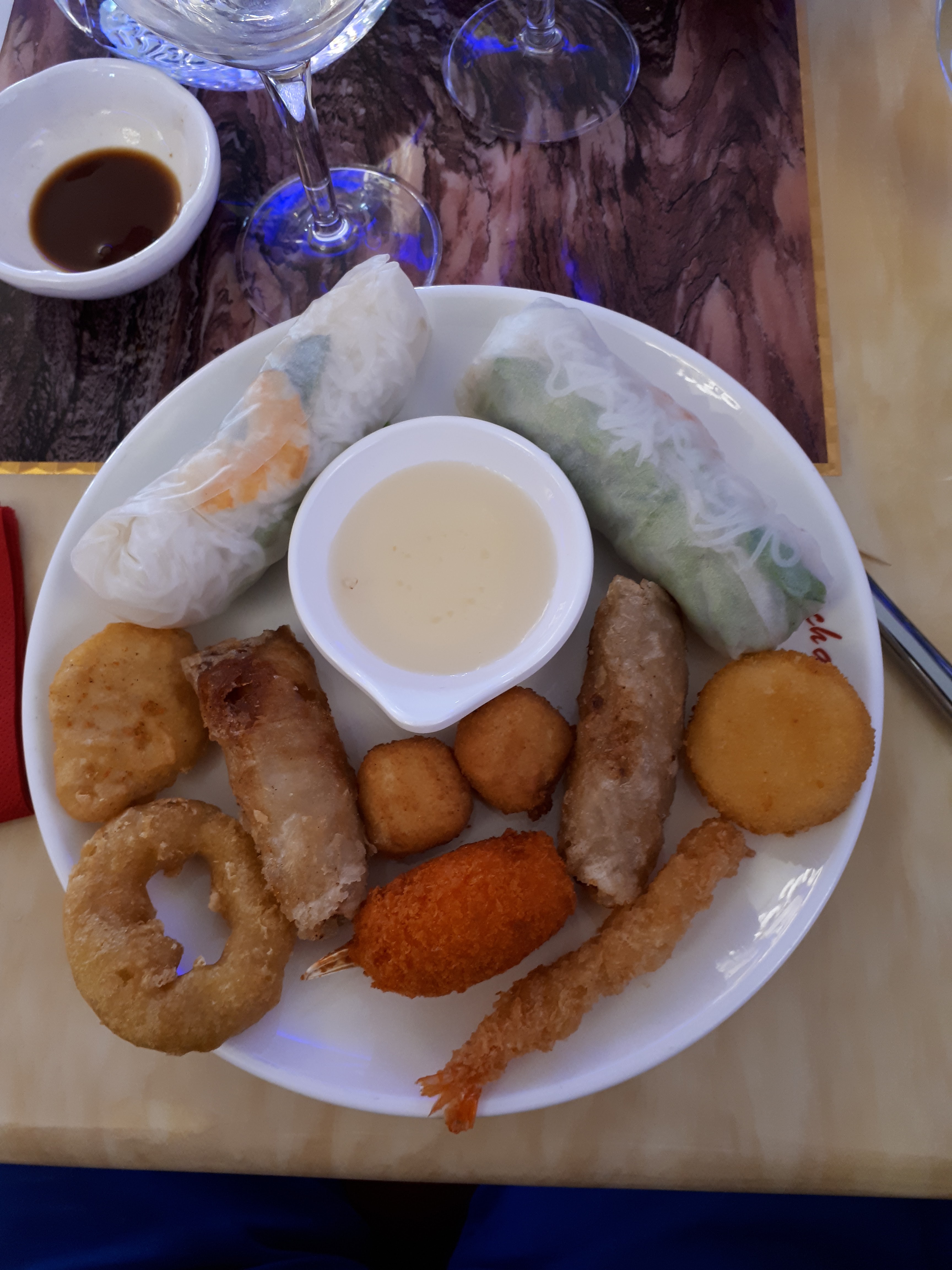 Buffet un peu léger après on était lundi soir mais vu la différence de prix entre le midi et le soir je m attendais a un buffet plus rempli les dessert quasi rien et sur les nems et samousa pas la qualité que je m attendais