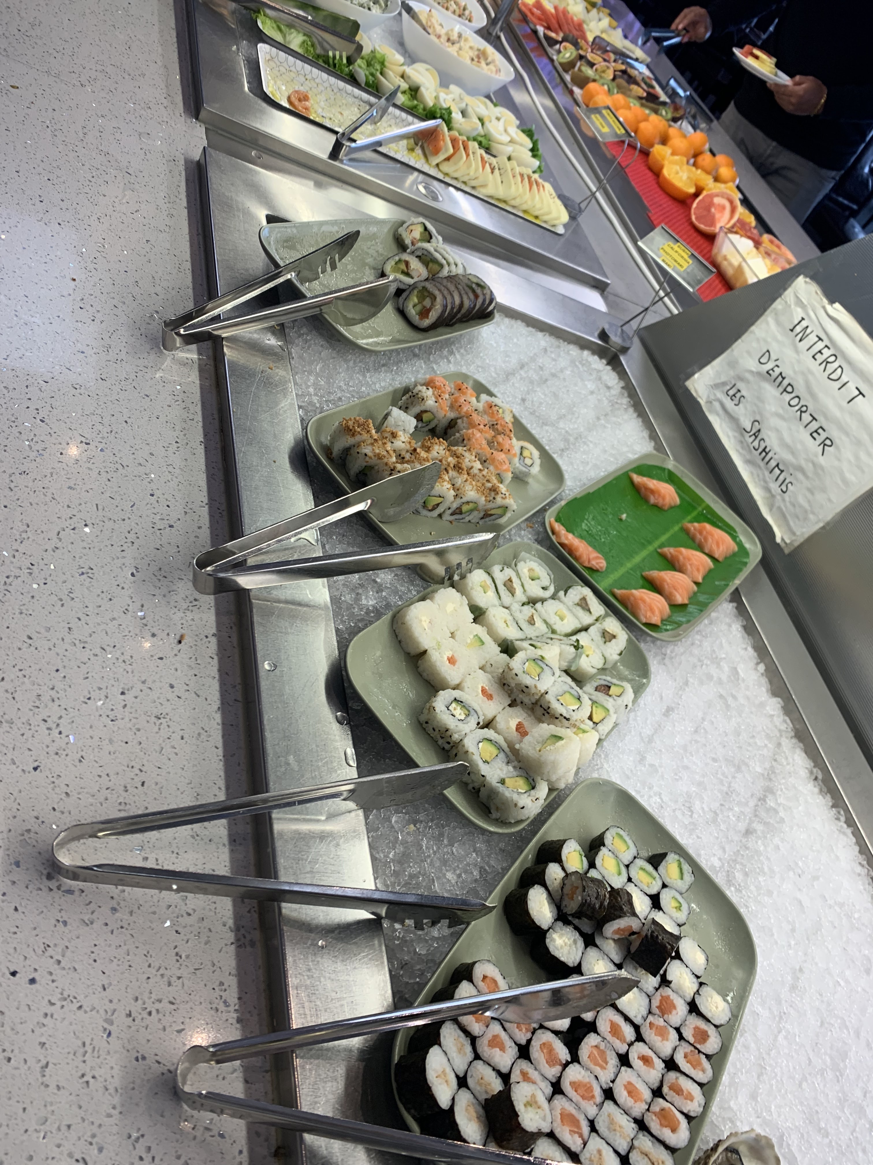 Plat froid et certains produits clairement réchauffés une seconde fois. Des mouches à m…. traînaient sur l’espace plats froids dont les sushis. Du coup rien mangé des ces plats. Hygiène et qualité des plats à revoir. 19,99 pour manger des nuggets c’est moyen.