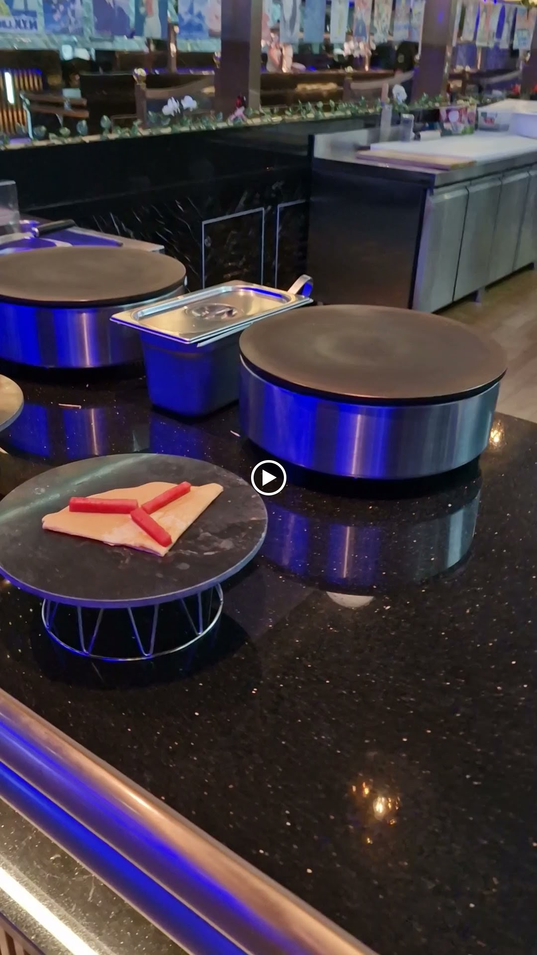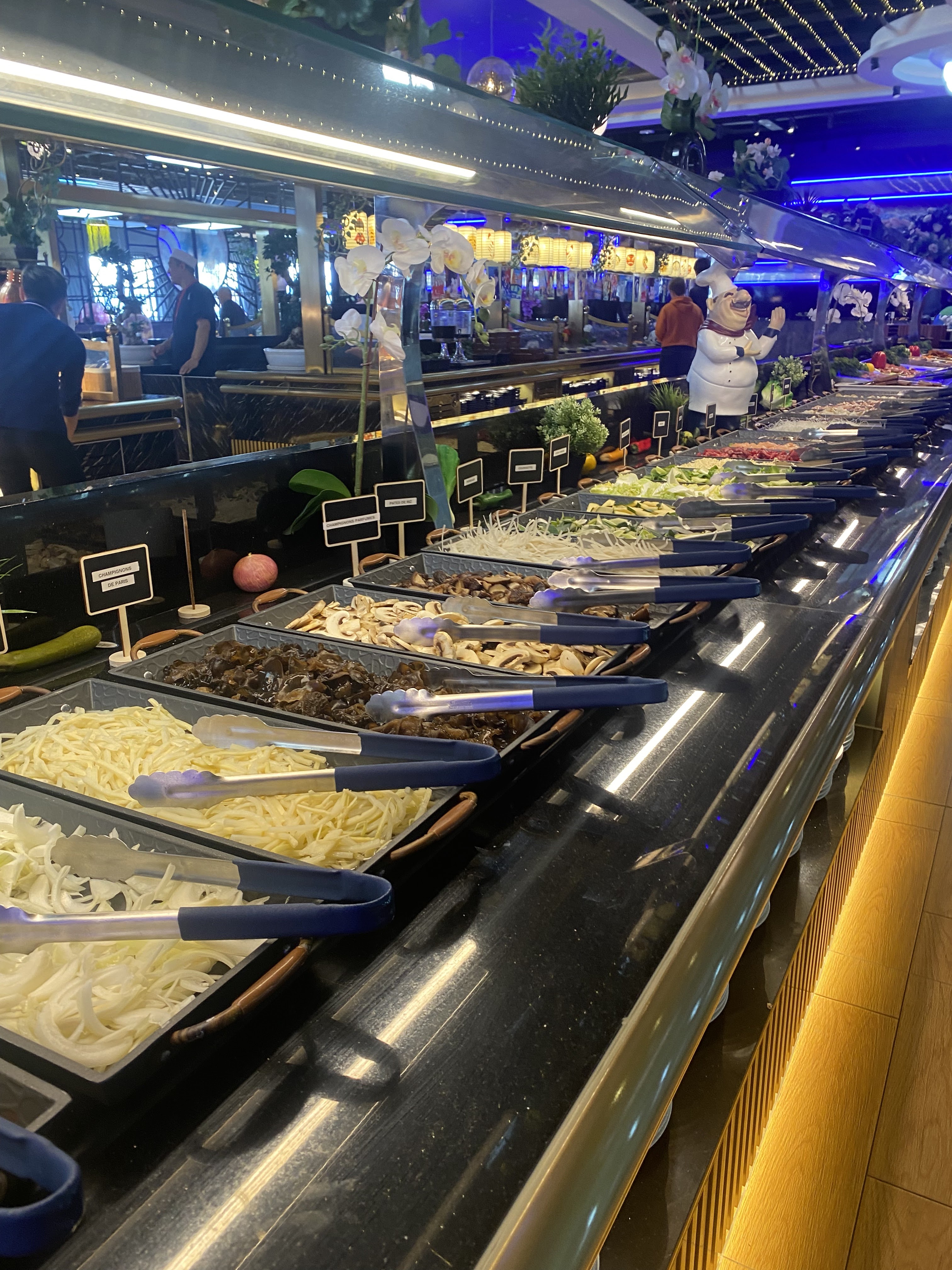C’est juste grandiose, on se croirait dans une attraction ! Énormément de choix. Le resto propose le traditionnel chinois, japonais mais aussi des compositions françaises et indiennes. On y trouve également de beaux morceaux de viande à la broche. Un petit moins pour le monde, c’est presque stressant et les clients se servent un peu n’importe comment, en mettent partout et les enfants ont tendance à se servir avec les doigts ou à prendre et à reposer… un petit moins également pour les desserts qui ne font pas vraiment frais ou qui sont surtout à destination des enfants. Cependant j’ai apprécié le grand choix de fruits frais. Je le referai un jour où j’aurais vraiment faim pour peut-être vraiment apprécier. Nous avons fait presque 1h de queue et ça reste un peu cher comparé à d’autres peut-être moins achalandés mais moins débordés par le monde.