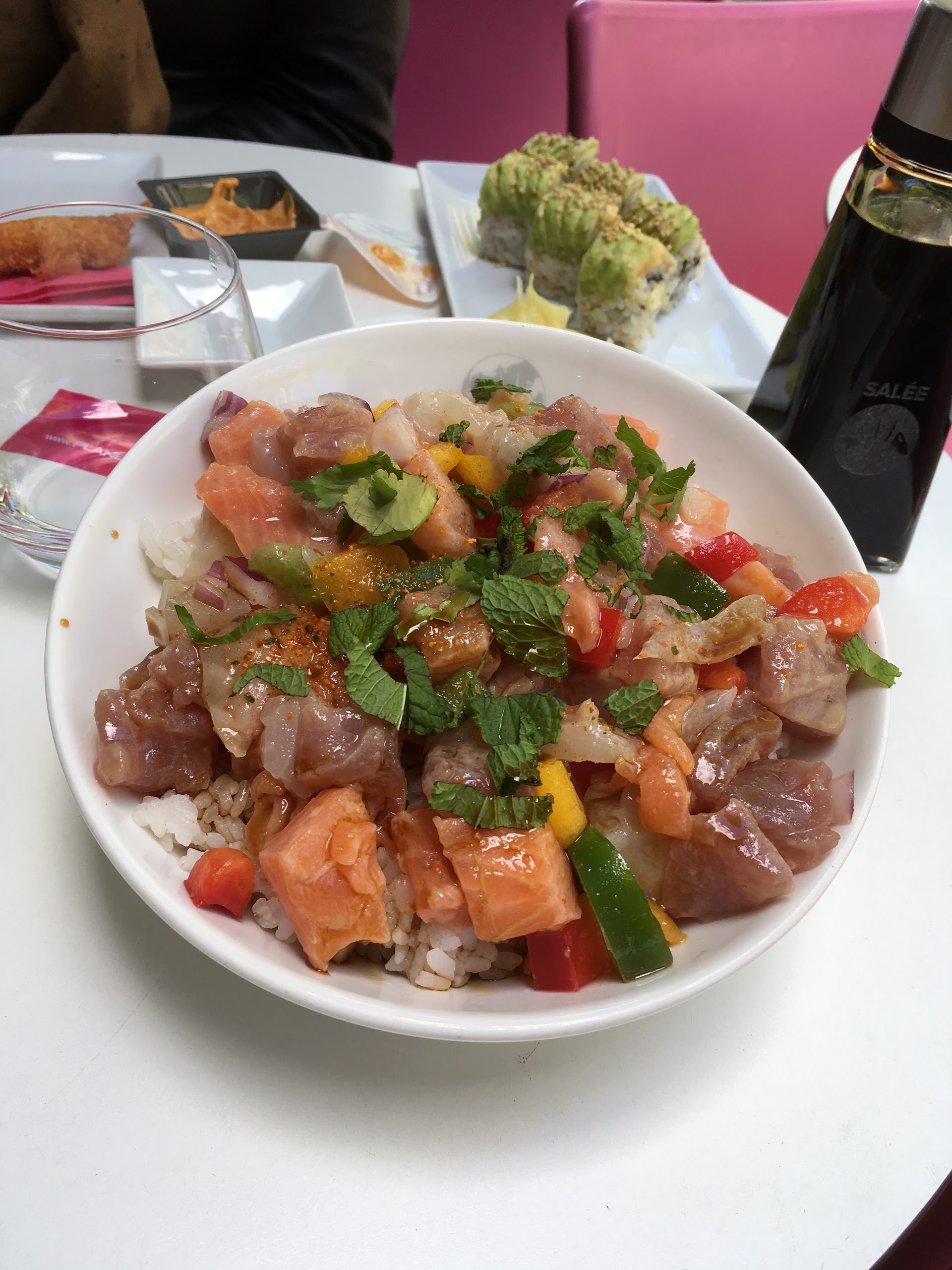 -riz très dur voir pas cuit. On aurait dit un plateau fais le midi recyclé le soir pour écouler le stock... - sashimi saumon extrêmement gras, manifestement pas du poisson de qualité (même s’il était frais) -quant au service, on vient en couple et les plats sont servi à dix minutes d’intervalle - en terrasse les tables sont tellement collées que vous mangez sur les genoux d’inconnus Bref, je ne conseille pas et ne renouvellerai pas l’expérience.