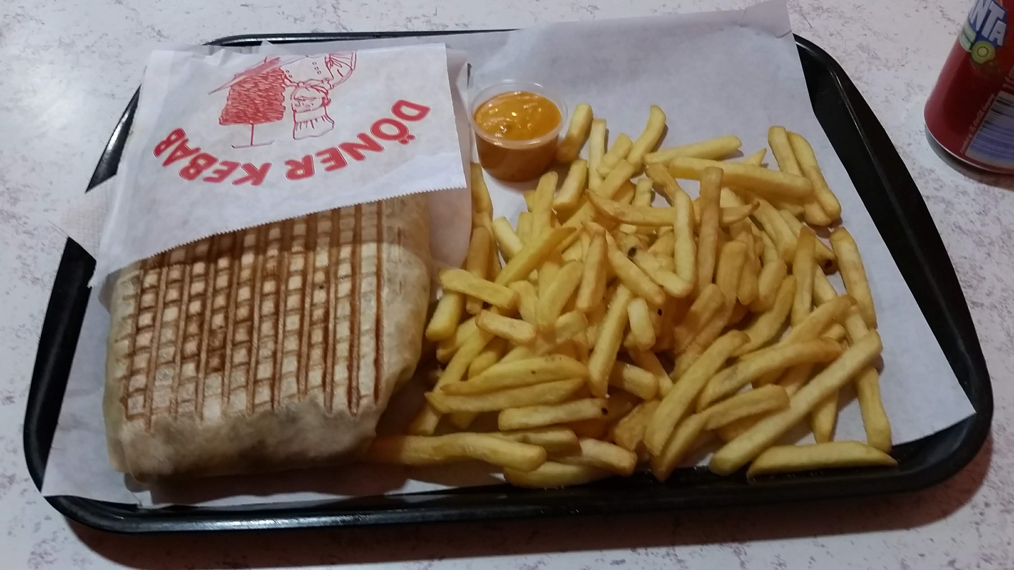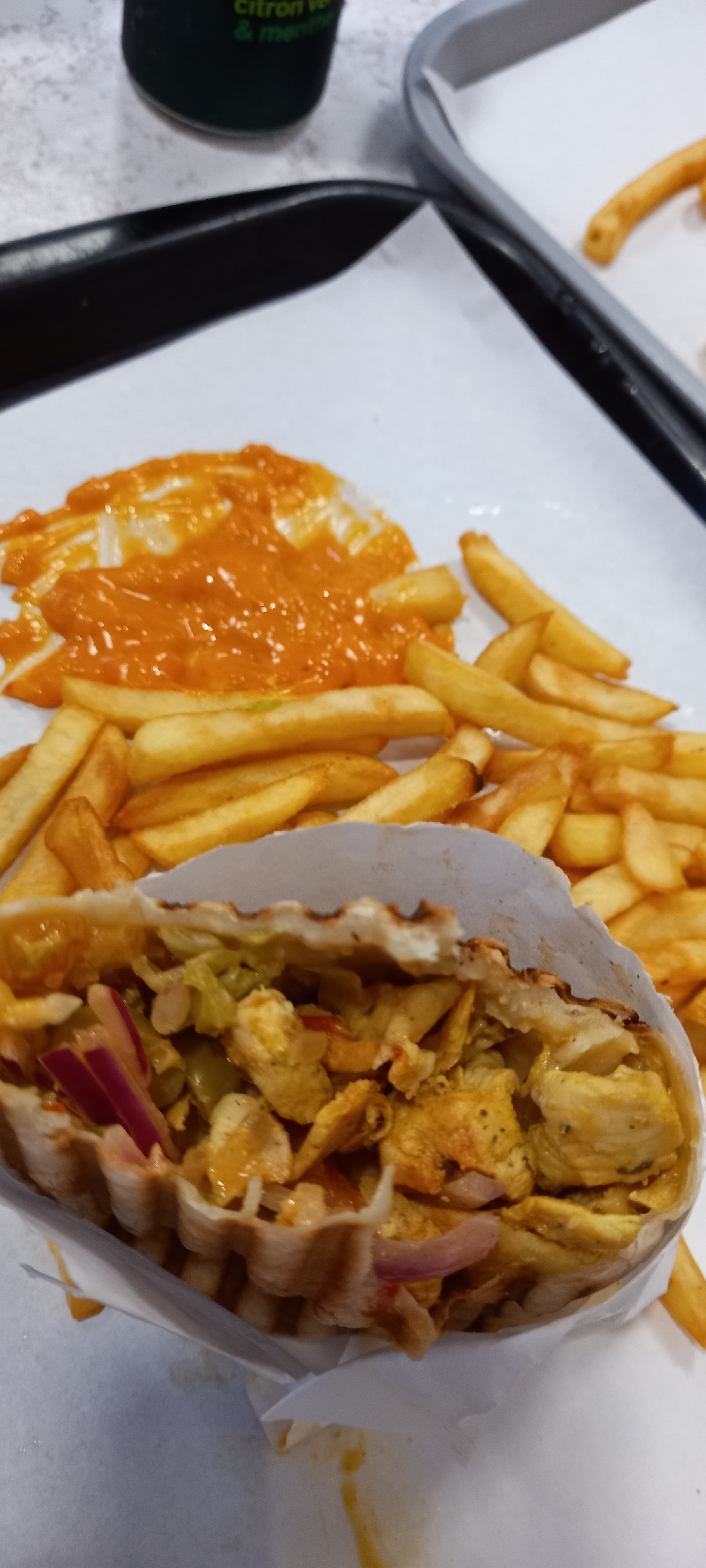 Frites croustillantes et chaudes, le pain du kebab est très croustillant et bien garnis, dommage la viande était froide. Faire un effort pour accueillir les clients. Endroit propre ça ne m'empêchera pas d'y retourner la prochaine fois