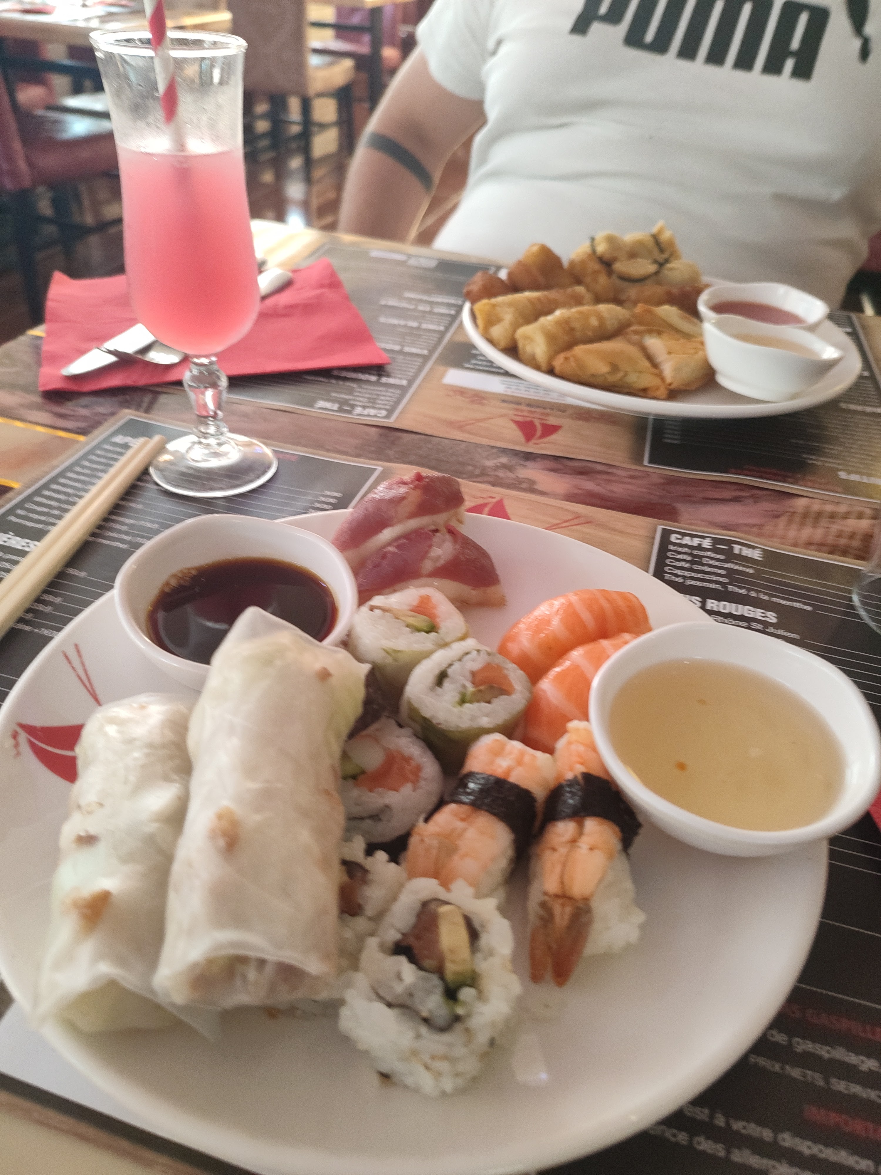 Moins de choix la semaine à midi que le week-end pas beaucoup de dessert la prise de commande des boissons un peu longue sinon on y mange bien sushis nems excellent