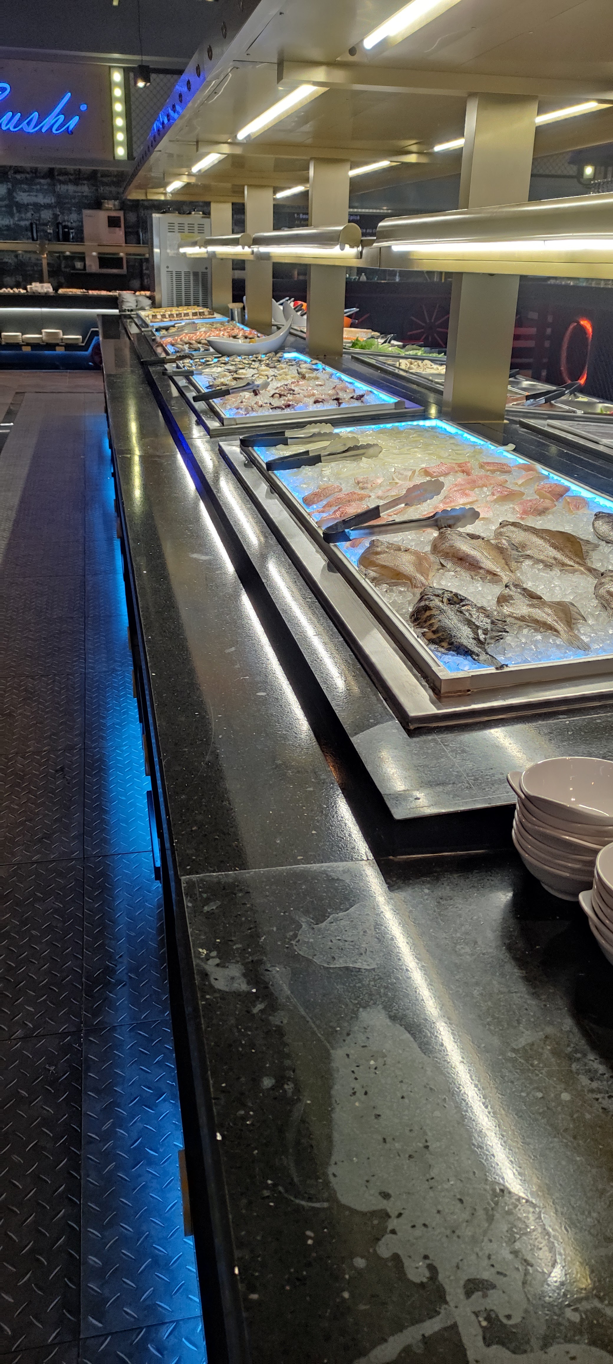 Restaurant très grand avec une décoration sympathique Cependant, il y’a de gros bémols : 1- Nous n’avons jamais eu de serveur pour nous demander les boissons, on s’est contenté d’une carafe d’eau 2- A 19h30 il n’y avait presque plus rien à manger et il a fallu du temps pour qu’il y ai quelques remplissage 3- Bondée de monde et des queues à l’entrée a n’en plus finir,et pas assez de serveur/ de nourriture je me suis demandé se qu’allait pouvoir manger les clients qui arrivaient De ce fait étant donner que payé 20,80€ pour un soit disant buffet à volonté et finalement pour 2 assiette de quelque sushis/nuggets/pâte nous avons demandé un geste commercial qu’un responsable nous a gentiment accordé (nous n’avons payé que la moitié de la note) En bref, nous n’y retournons pas en tout cas pour l’instant, peut-être leurs laisser le temps de commencer 🤷🏼♀️