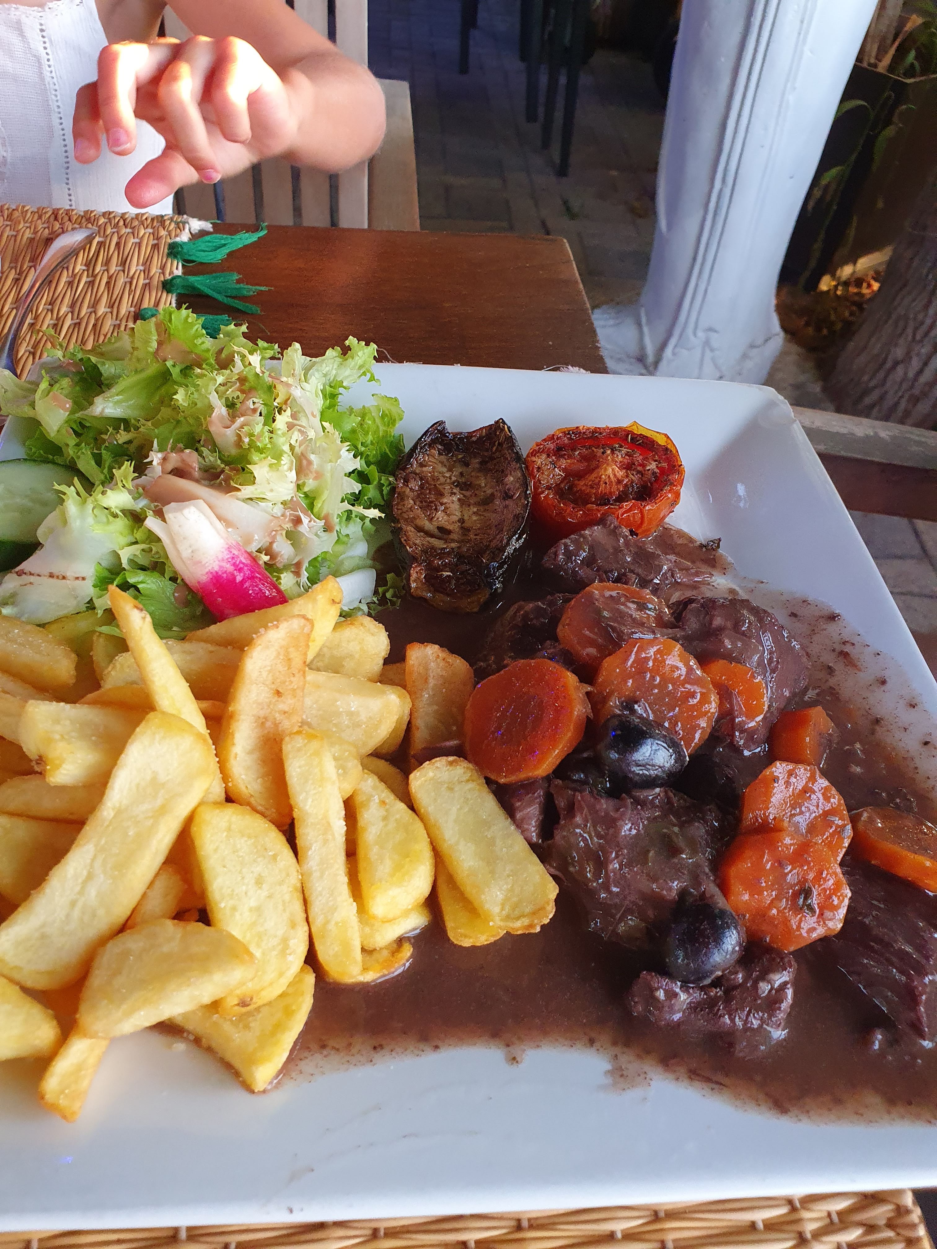 Très bien accueillie par un homme et une femme très gentil tous les deux tout au long du repas rien à dire. Bémol sur la cuisine il ne faut pas s'attendre à de la grande cuisine. Tout est servi avec des frites, dommage pour la gardienne de taureau on s'attendait du bon riz. Le menu enfant reste simple et pas cher. Servi rapidement on a pas eu d'attente très agréable avec des enfants. L'ambiance était sympa avec la musique on a bien aimé. Pour manger sur le pouce il convient.