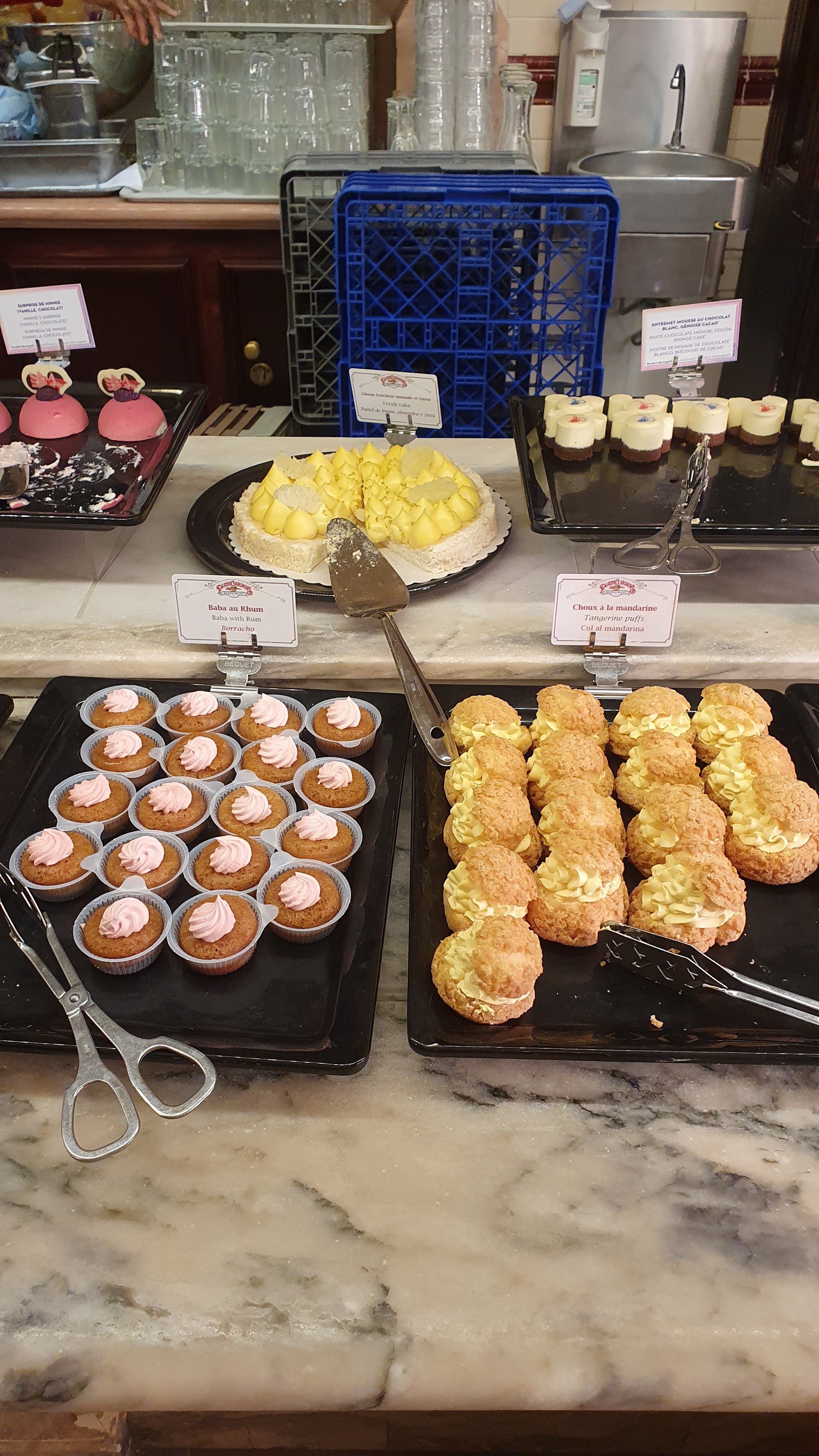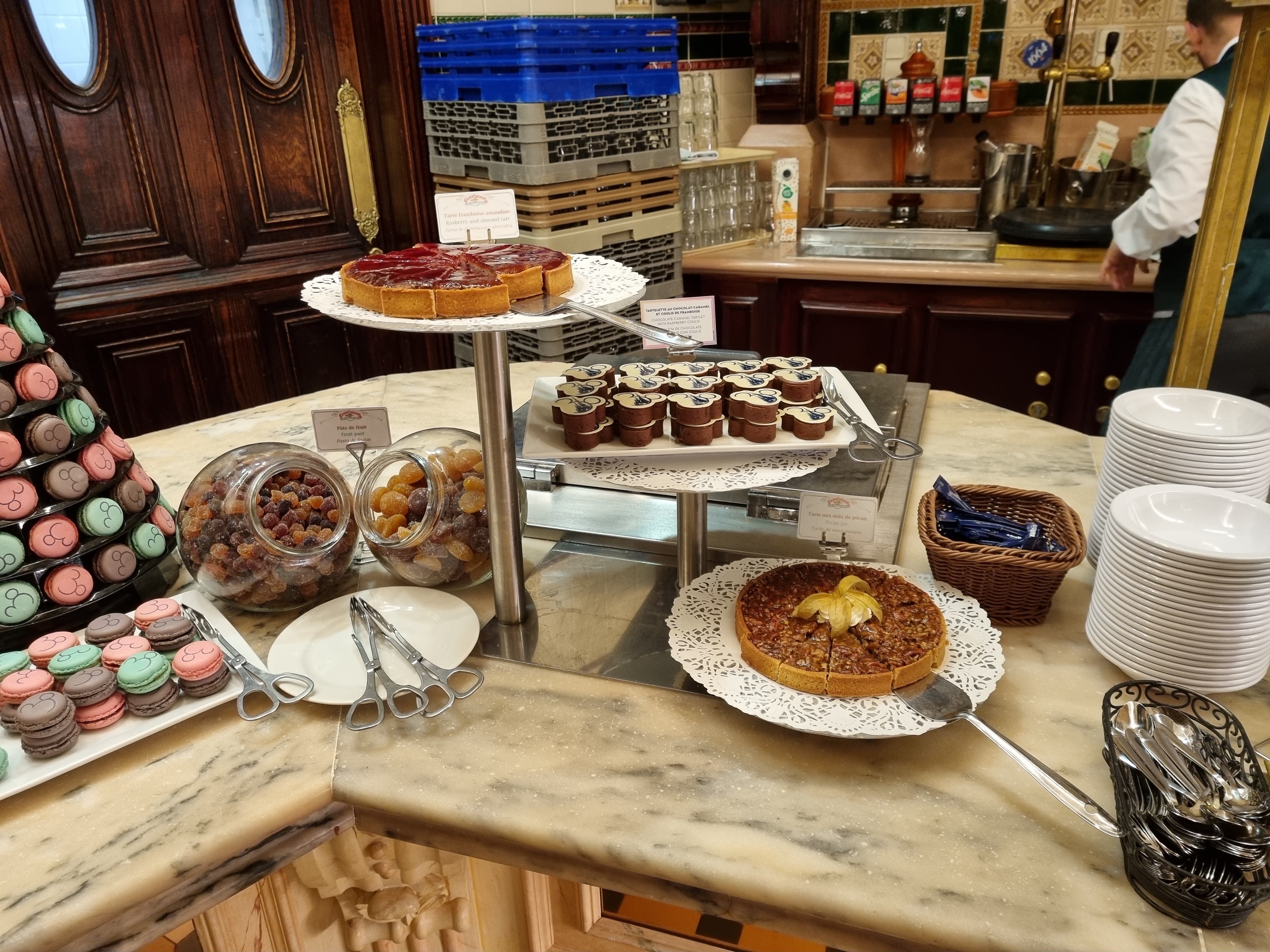 Super décor à l’américaine avec une charmante véranda et une belle hauteur sous plafond. Le buffet à volonté est de retour après une période COVID particulièrement restreignante pour les buffets à volonté. Le buffet présente un large panel de plats à la française et à l’européenne. L’organisation de la réception à l’accueil jusqu’à la table fut nickel et l’approvisionnement du buffet en temps réel parfaitement organisé. Ceci étant je n’ai pas été emballée par la viande de porc et de veau. Le saumon fume était correct mais les plats en général surtout les pâtes, les pizzas et les viandes m’ont déçue. Le poulet rôti avait également l’air sec. En revanche les pâtisseries étaient exquises, que ce soit le fondant au chocolat avec sa crème pâtissière, les macarons ou les moelleux au chocolat recouverts d’une couche de chocolat blanc coloré à l’effigie de Disneyland Paris. Nous avons croisé Cendrillon dans le Plaza Garden Hotel. Elle n’avait qu’une seule chaussure aux pieds.