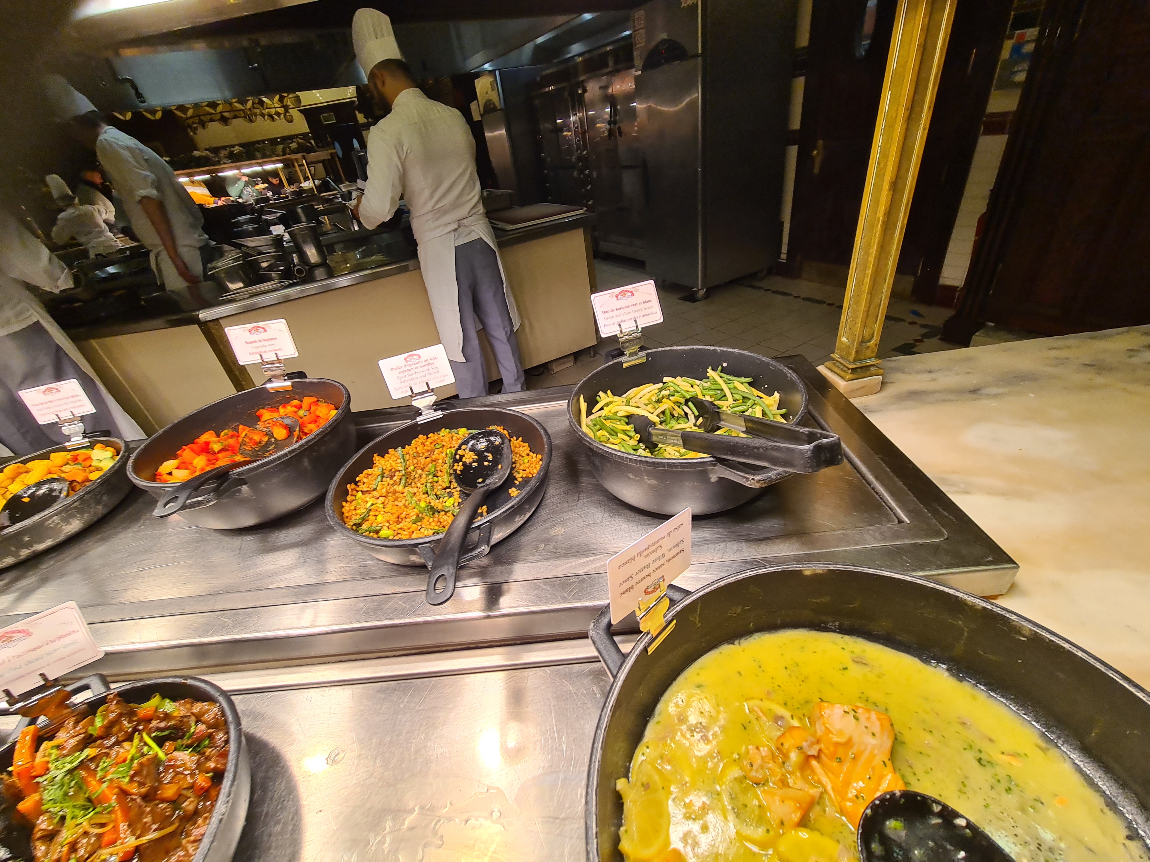 Beau buffet avec beaucoup de choix et d’options végétariennes/veganes. Bon accueil, casts members sympatiques et attentionné. La cadre est magnifique avec une très belle décoration et musique dans le thème.
