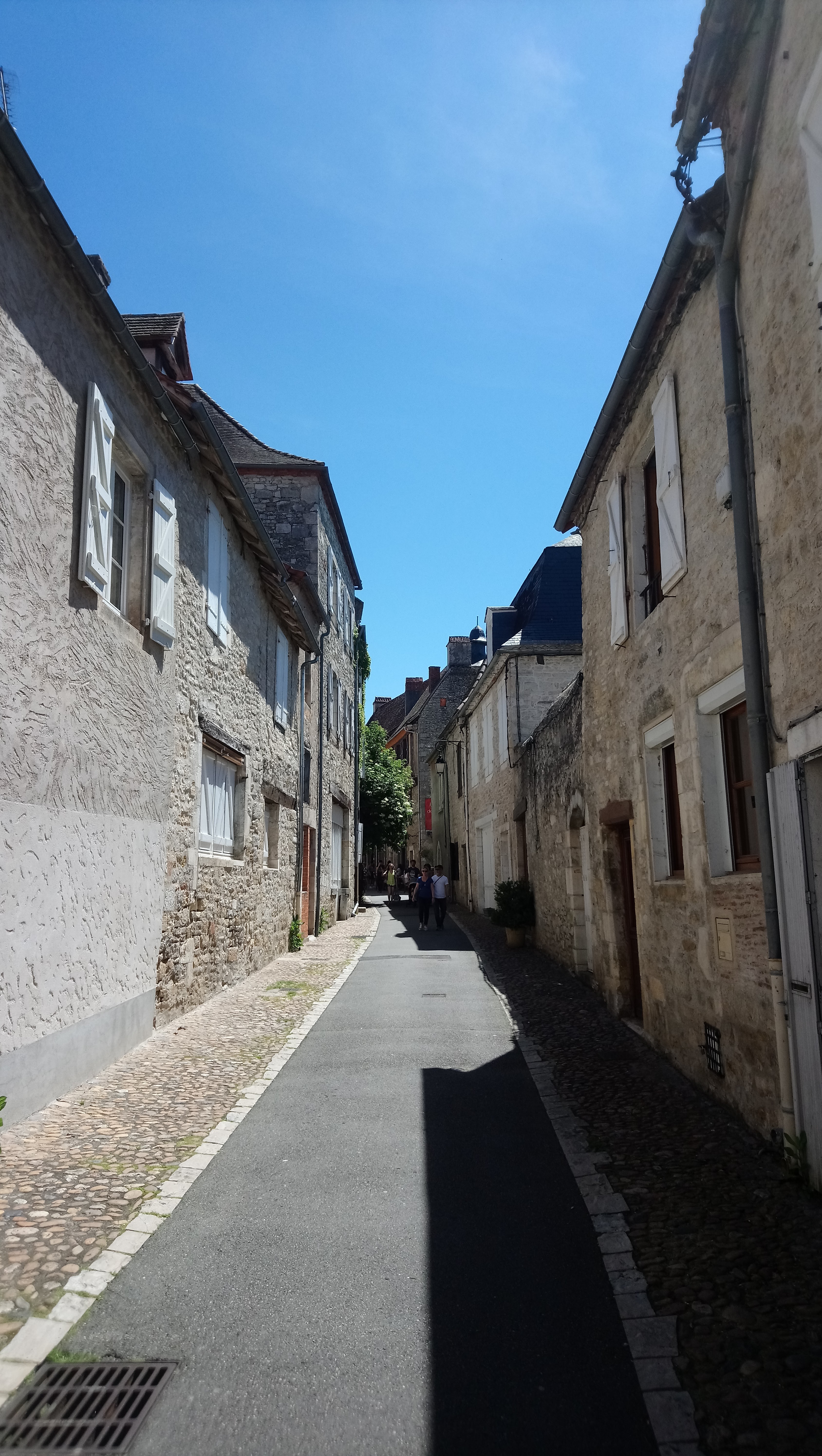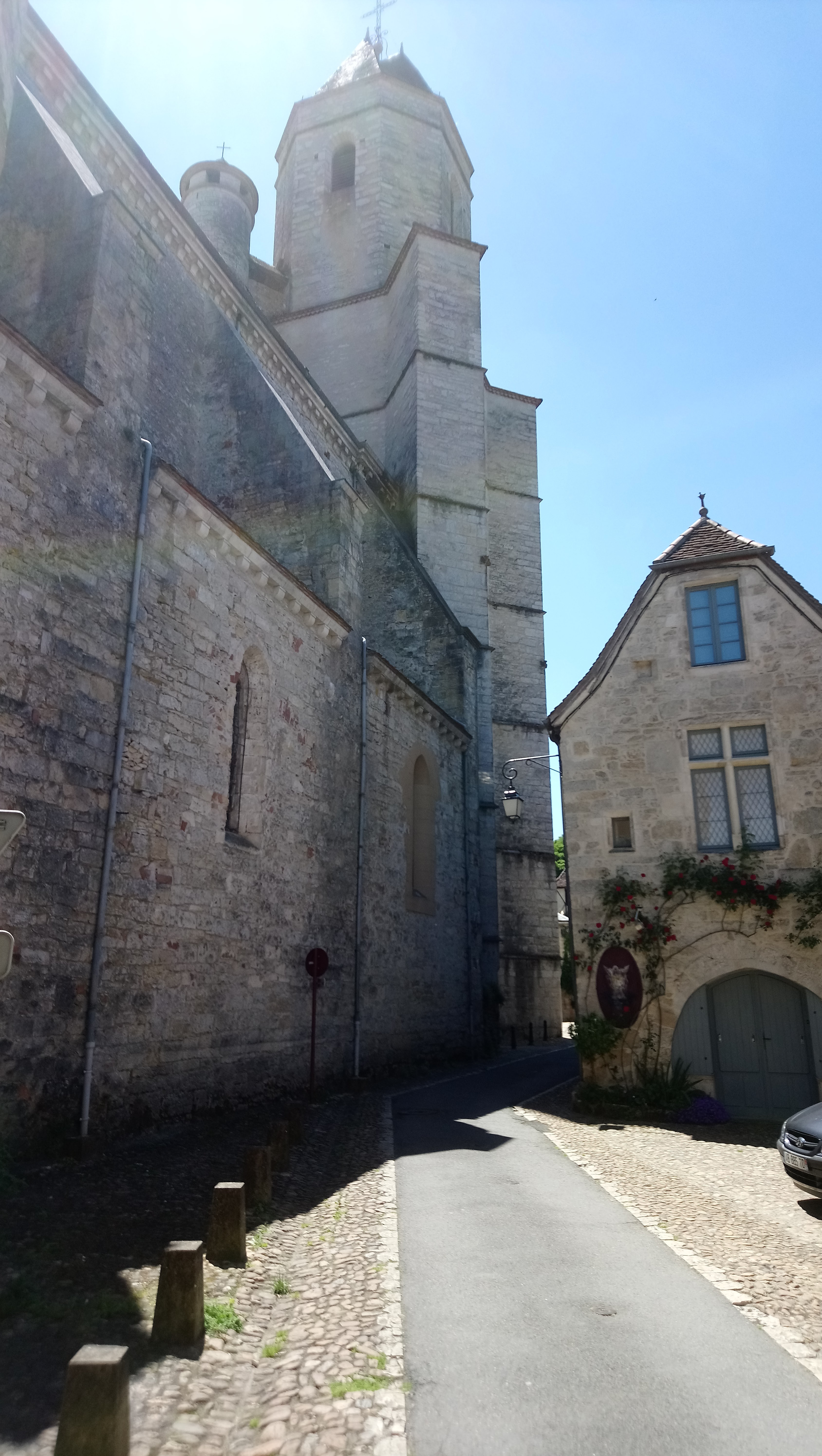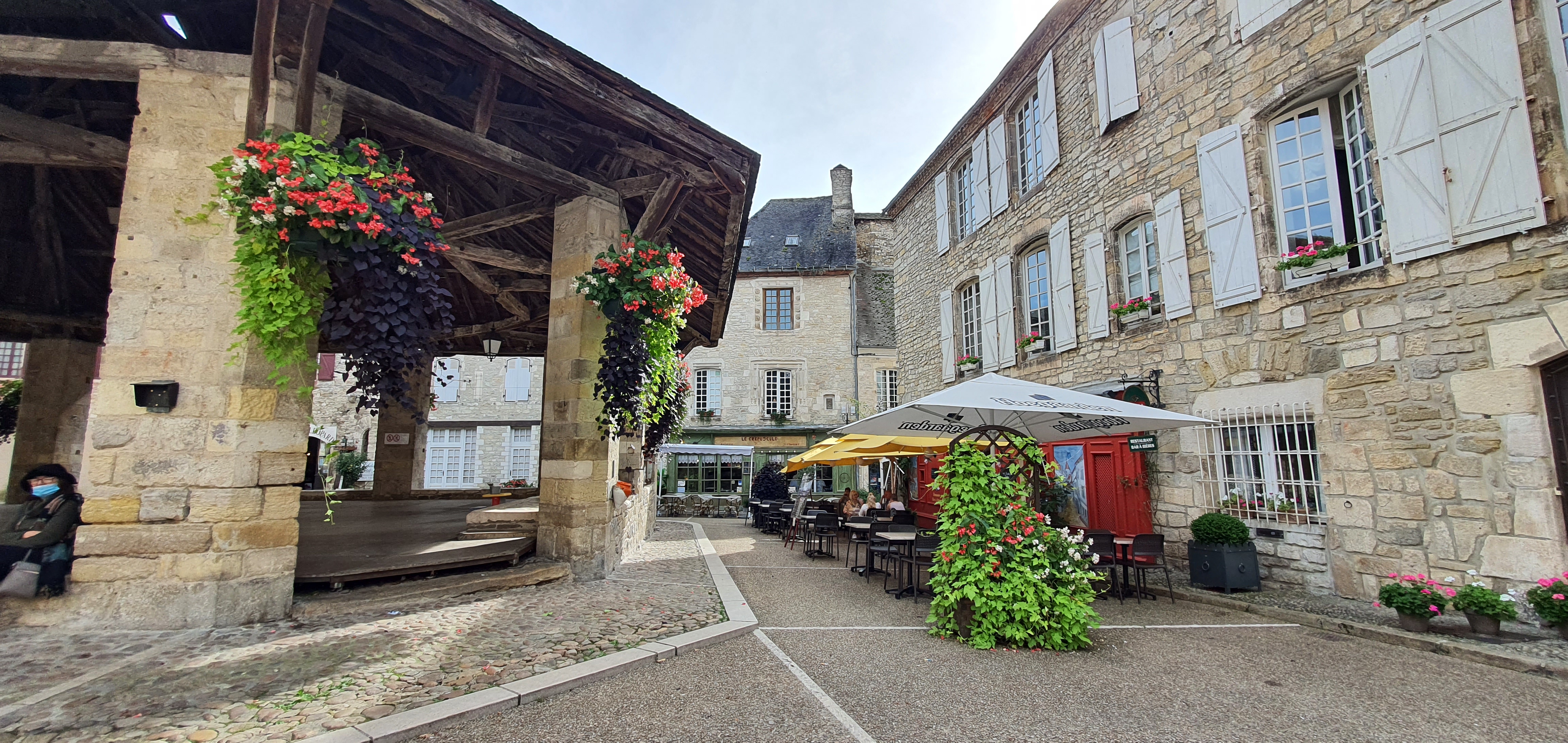 De passage, un jour de bruine à Martel. Se garer sous les arbres (gratuit) et découvrir le centre ancien, ses beaux bâtiments et l'imposante halle du marché. Et se restaurer : Plein Sud nous a accueilli alors qu'il n'était pas encore midi. Nous avons choisi une salade gourmande qui enfin en était une, copieuse, goûteuse avec de bons produits, une sauce suffisante pas trop envahissante. Le rosé du Lot conseillé était excellent. Le fraisier, dessert du jour, a couronné ce beau moment lotois.