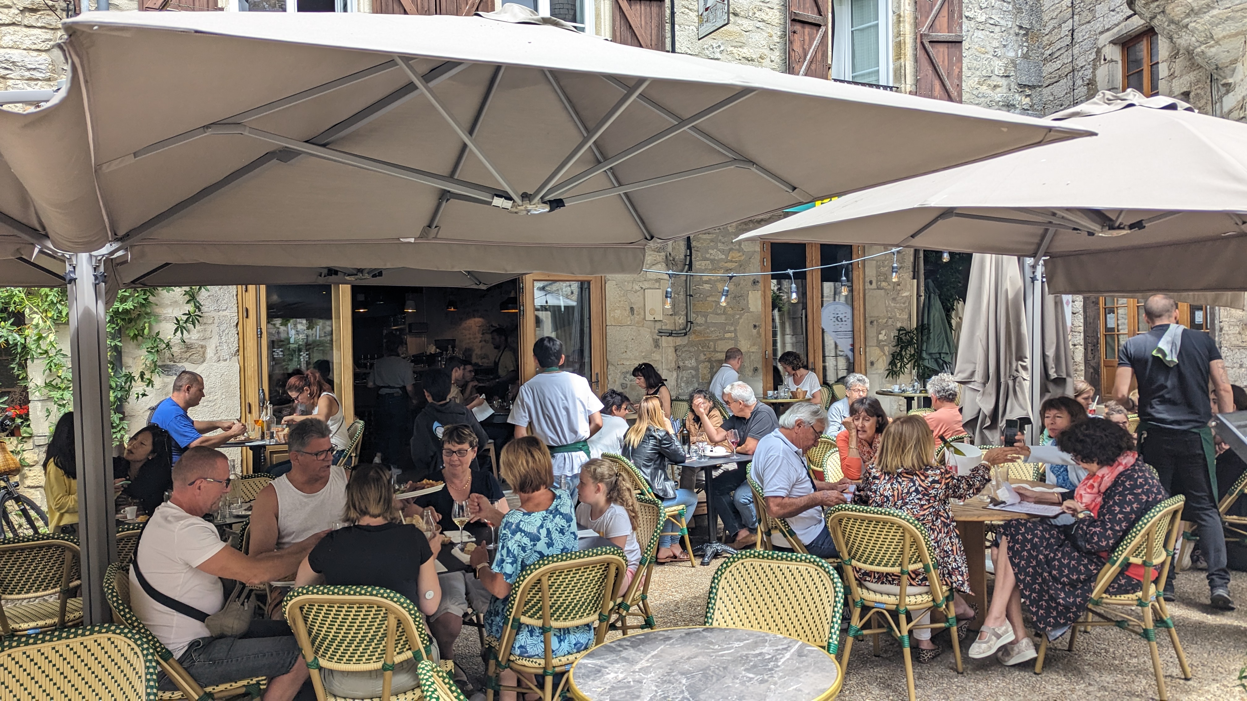 Local ayant voulu tester pour mieux renseigner les visiteurs de passage, je ne peux que conseiller pour ceux qui veulent un restaurant avec un cadre charmant, une cuisine simple mais maîtrisée et un service très humain. Voulant tester un plat qui nécessite une bonne préparation et qui peut être consommé par une grande partie de la clientèle, je me suis tourné vers le cordon bleu accompagné de sa salade et de frites ( cuisine rapide mais nécessitant tout de même une bonne maîtrise ). En plein rush de midi, le plat arrive après une quinzaine de minute et fait remarquer son entrée en table : une assiette bien garnie accompagnée d'une panière de pain de Bottero ( boulanger de Martel dont la qualité des tourtes n'est plus à prouver avec une croute épaisse se mariant très bien à la mie plus aérienne et moelleuse ). Après avoir dégusté le plat, voici mon ressenti : - la salade n'est pas carton et n'arrive pas chauffée par les autres ingrédients permettant aux amateurs d'en profiter dans son état le plus frais possible. - les frites sont bonnes, on voit très bien que ce n'est pas du surgelé, elles ne sont pas trop cuites ni trop grasses ; seul bémol je les aurais apprécié un peu plus charnues ( la pomme de terre étant bonne, la coupe trop fine ne permet pas selon moi de déployer au maximum les saveurs de cette dernière ). - Le cordon bleu, pièce maîtresse de ce plat, est très bon ; la chapelure est croustillante et ne boit pas le gras, la volaille est tendre et présente en quantité généreuse, le lard est fin sans être une lamelle croustillante sans goût et n'est pas trop salé ce qui lui permet de ne pas emporter les autres saveurs en bouche. Cependant, le fromage aurait mérité un affinage un peu plus poussé car il manque de caractère et se fait trop discret en bouche. Il est censé apporter un goût prononcé car, comme le reste ne se veut pas trop gras, il est là pour jouer ce rôle mais, s'il n'a pas assez de goût alors, ce rôle se retourne contre lui et n'en fait qu'un ingrédient de consistance. Malgré cela, le cordon bleu reste très bon, c'est juste du chipotage de ma part. - La sauce est légère ; elle vient compléter le plat sans pour autant l'alourdir et est disposée dans un petit récipient à part ( permet alors de ne pas influencer les saveurs du plat si l'on n'en veut pas ). Pour ce qui est de la déco, on est dans un esprit rustique assumé qui est très charmant et la terrasse est très bien exposée ( le nom de l'établissement se passe d'explications ). Pour le service, un grand merci à toute l'équipe que j'ai pu voir en plein rush ( ainsi que depuis mon lieu de travail à des heures plus calmes ) et qui ne perd jamais le sourire et l'amabilité. Ces personnes peuvent être fières de leur travail ! Conclusion : un restaurant fait pour ceux qui veulent manger des plats simples et faits avec maîtrise tout en profitant d'une vue sur la place à l'abri du passage des voitures, des prix justifiés et un service plus que qualitatif.