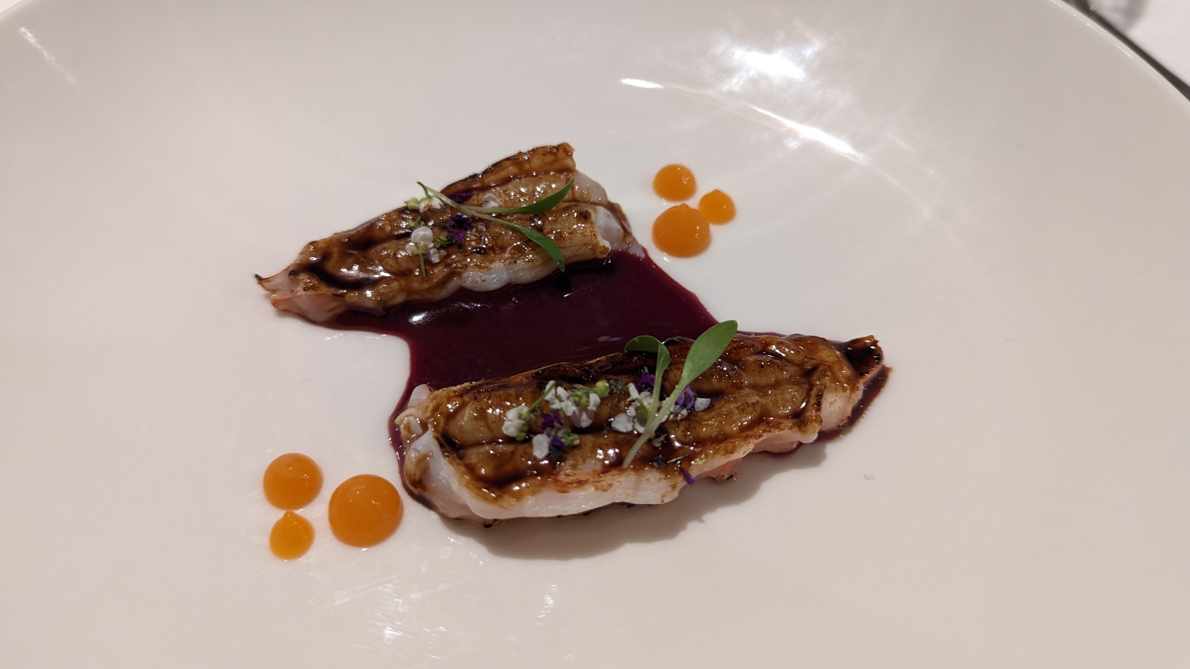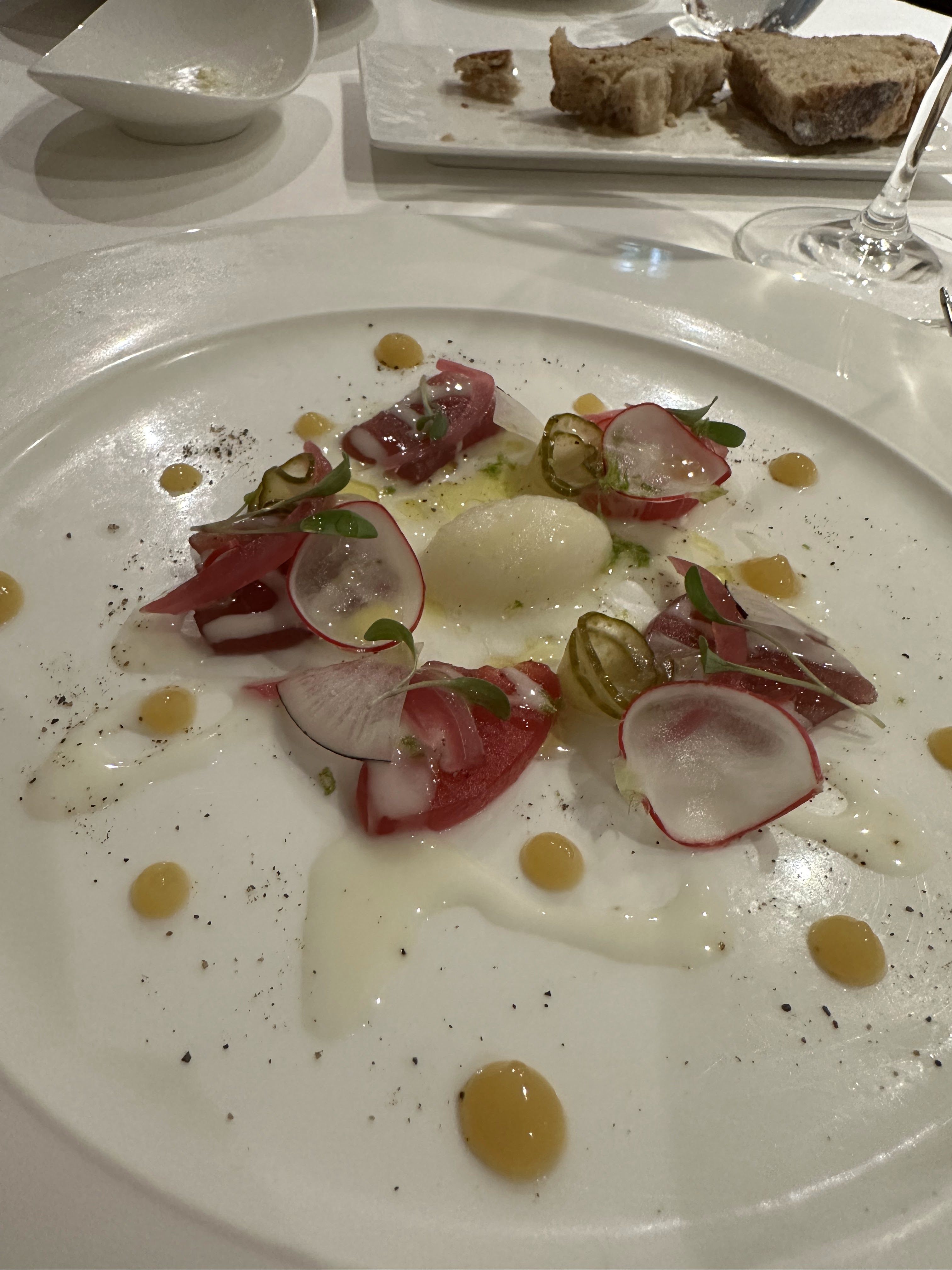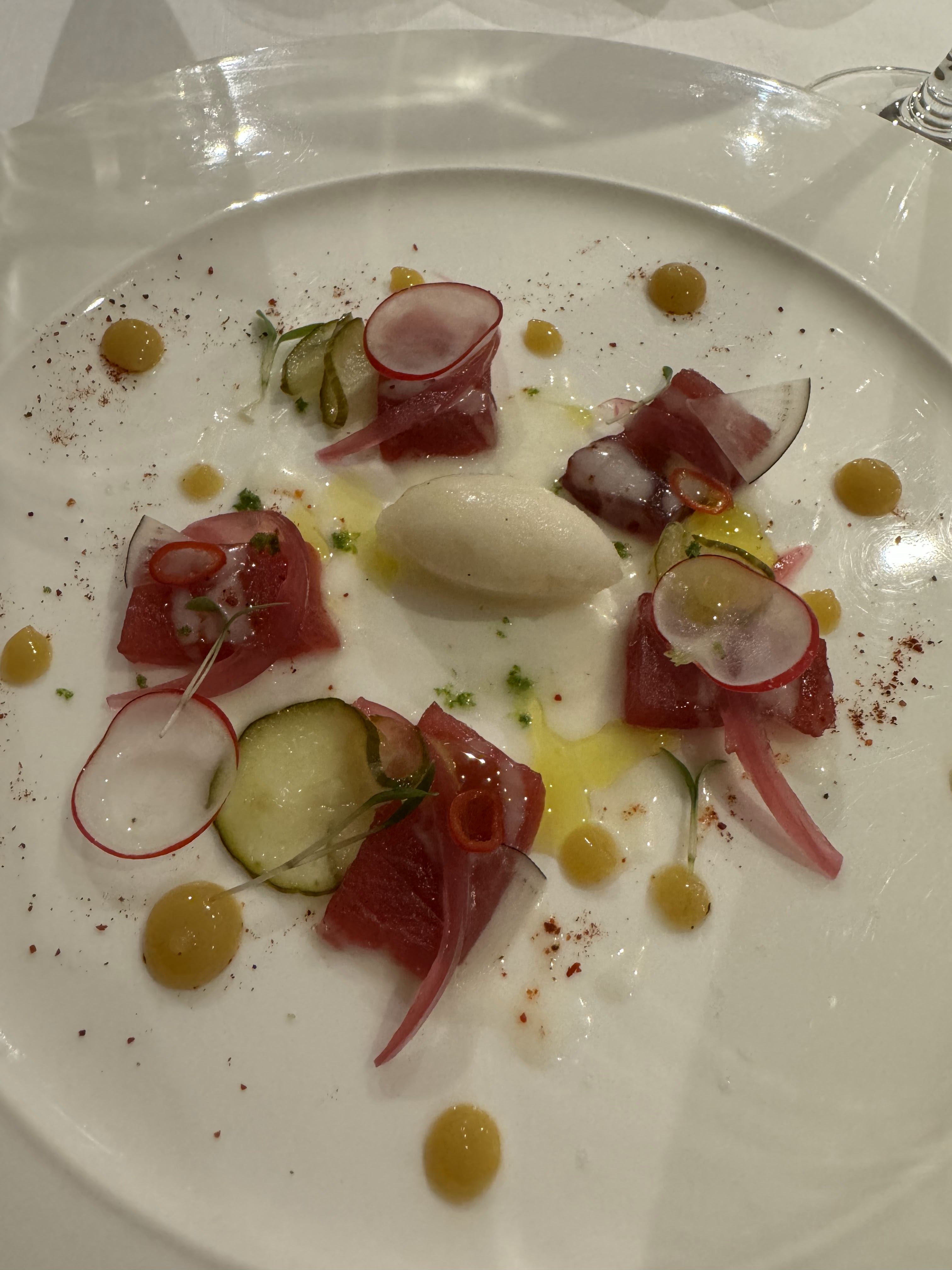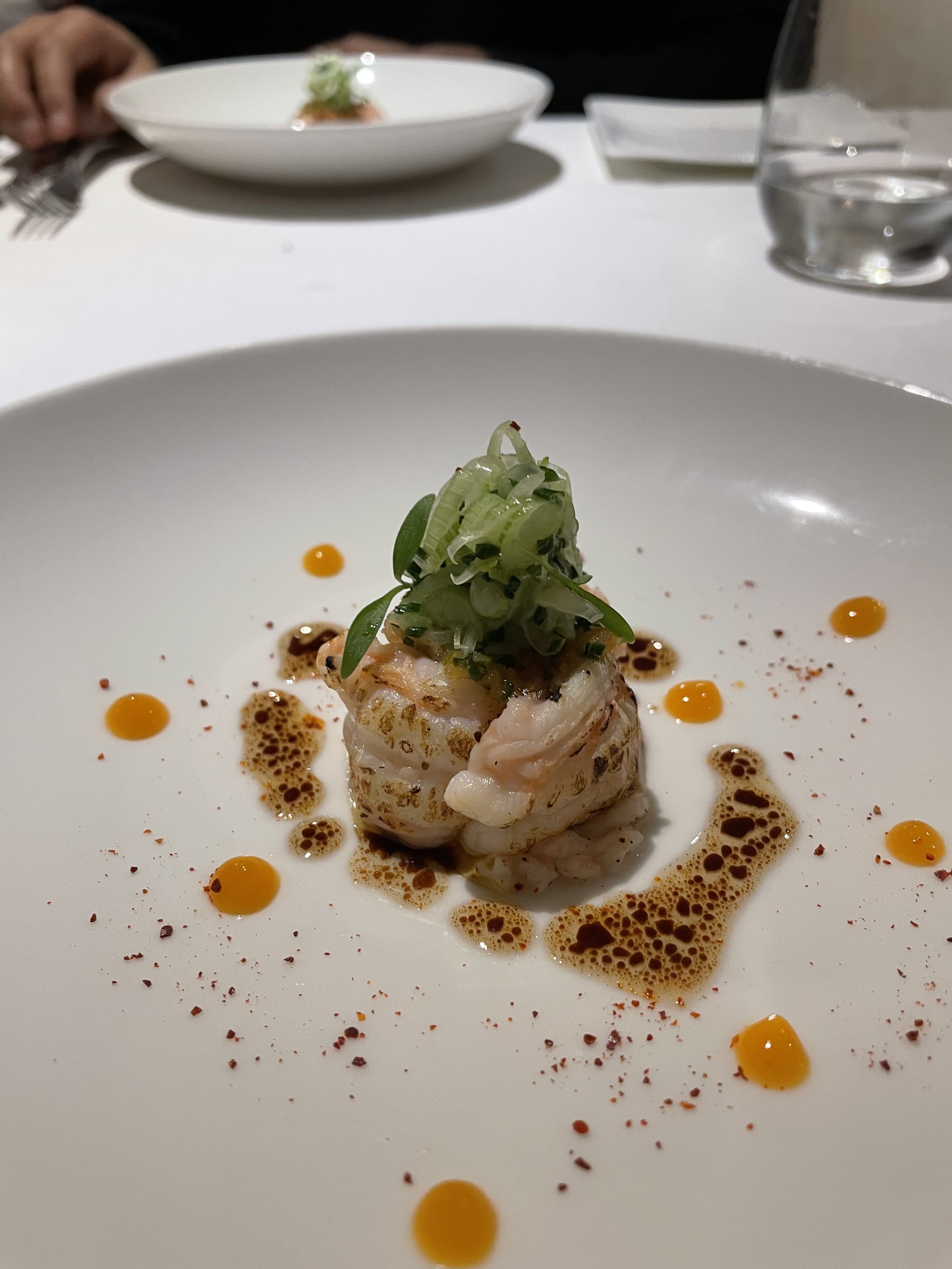 Une délicieuse expérience gastronomique! J'ai beaucoup apprécié la variété et les saveurs inventives des plats qui nous ont été présentés. Mon plat préféré de la soirée était sans aucun doute la langoustine, délicate, tendre et joliment servie. Le carpaccio de bonite a été une très agréable surprise, les saveurs sélectionnées par le chef (notamment le sorbet aux agrumes) se marient à merveille avec les éléments marinés et le poisson salé. La présentation de chaque cours était d’une beauté classique. Dans chaque plat, la plupart des garnitures et des éléments semblaient soigneusement sélectionnés et avaient leur propre objectif, mais j'estime que l'anchois ne se mariait pas bien avec le steak. Malheureusement, je dois retirer une étoile pour le service, qui me semble manquer pour un restaurant de ce calibre. Le restaurant n'était pas plein à craquer mais le serveur a oublié d'apporter notre plat de fromage et a dû être rappelé. Il y a eu plusieurs cas, notamment vers la fin du repas, où nous avons essayé d'attirer l'attention du serveur. À un moment donné, des amis du chef sont entrés dans le restaurant et les serveurs semblaient très distraits. Nous avons attendu assez longtemps pour notre plat de desserts.