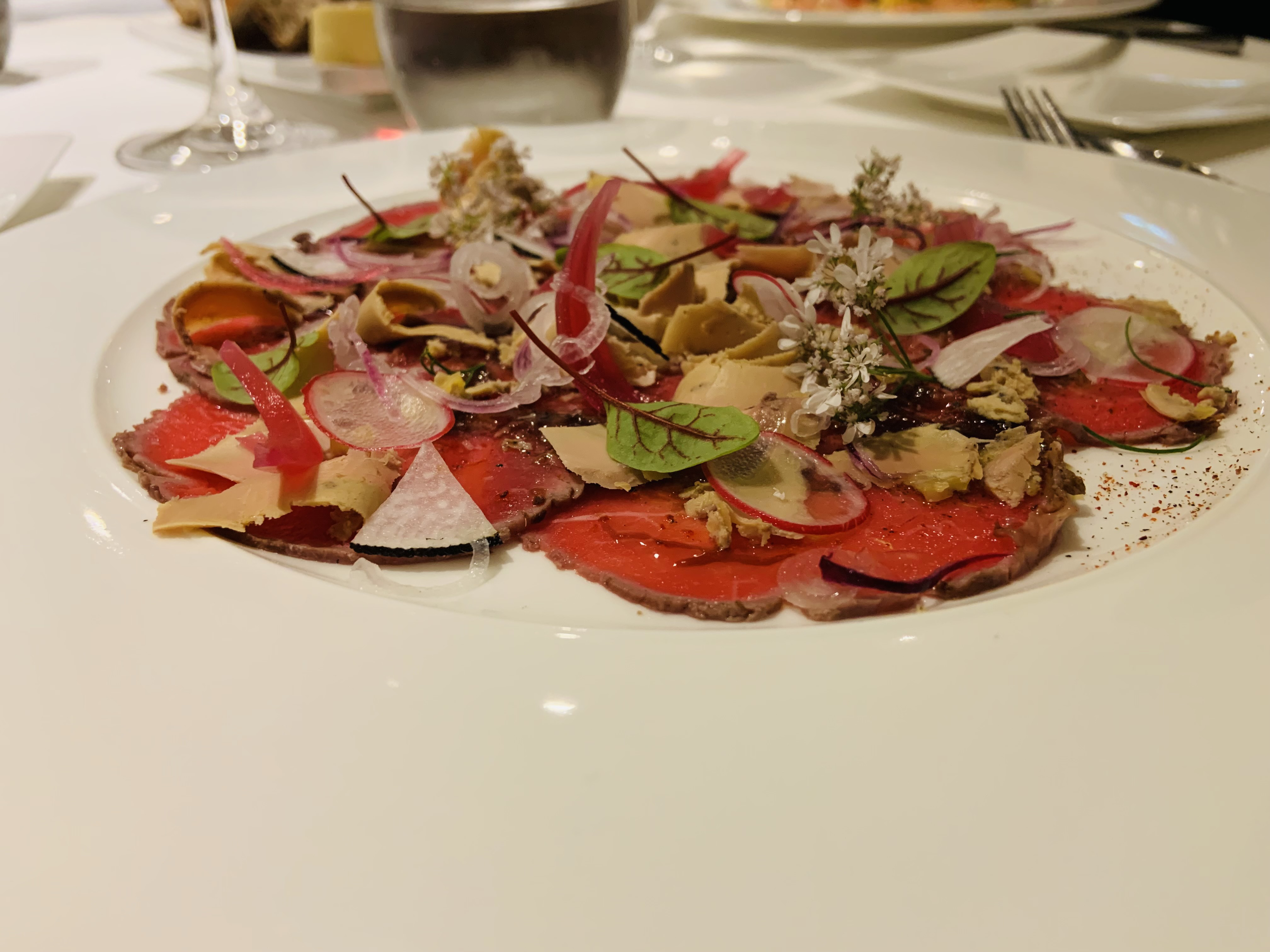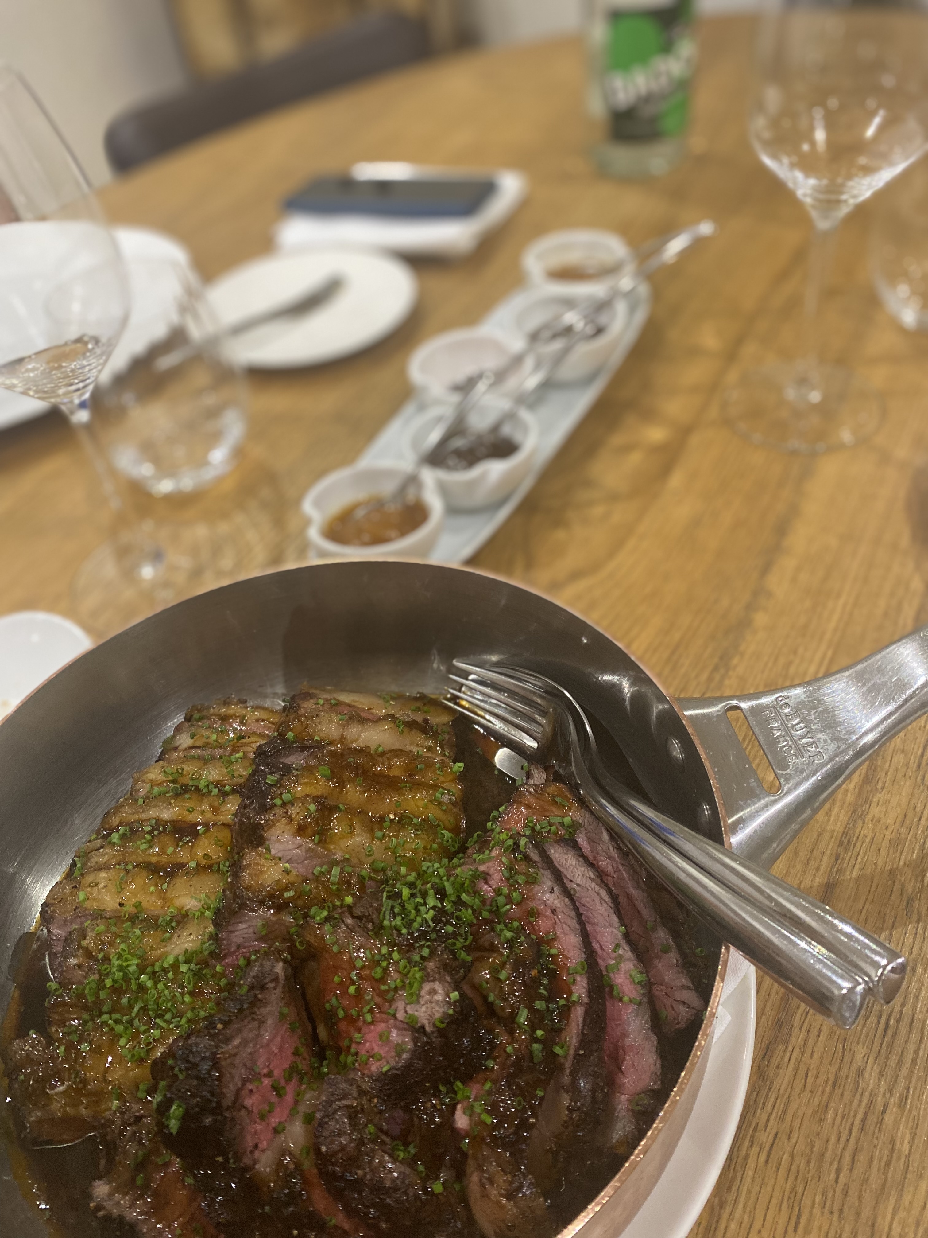Dans l’ensemble, nous avons eu une bonne expérience culinaire. Les apéritifs et les entrées étaient tous fantastiques. Le plat principal, le foie gras, était bon, le steak et la purée de pommes de terre étaient corrects.