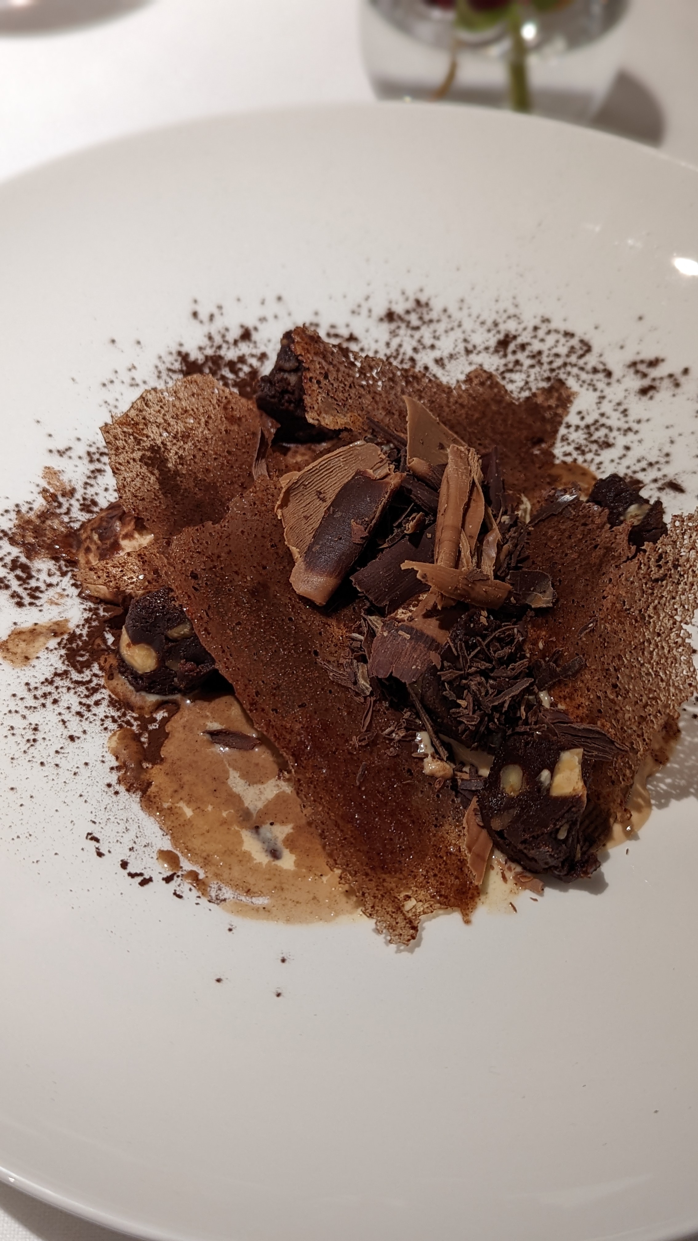 L'essentiel est avant tout de bien manger et le contrat a été rempli. Cependant, il y a plusieurs détails qui nous ont laissé une impression mitigée. J'ai demandé des précisions sur le menu dégustation et j'ai écarté cette option en indiquant que je n'aimais pas le fromage du tout (il contient un risotto et un plateau de fromages) et l'amuse-bouche qui nous est servi 5-10 minutes plus tard est au gorgonzola (fromage fort), je n'y ai donc pas touché. On m'annonce ensuite que l'effort a été fait par le chef pour me faire autre chose (super!) et finalement on me dit que les entrées sont prêtes alors qu'on va nous les servir (ascenseur émotionnel). La raviole de champignons était tiède, plus chaude elle aurait été meilleure. Le cabillaud était un peu trop pimenté et légèrement desséché (peut-être seulement 30 secondes de cuisson en trop mais ça compte). Les Saint-Jacques et l'agneau étaient très bons. Le pré-dessert était très bon, mais comme il est déjà à la poire, ça dissuade de prendre la déclinaison de poire en dessert (pour varier et découvrir l'étendue du talent du chef). La tarte soufflée au cacao était très bonne, les agrumes étaient intéressants mais il manquait une texture plus tranchante vis-à-vis des gelées, confits, mousses etc, un sablé aurait été meilleur qu'un biscuit semoule selon nous. Concernant le service, il est prévenant, mais s'il n'y a pas de sommelier, essayez de connaître au moins les bases! Je n'ai pas pris de photo de mon agneau parce que je me suis jeté dessus, le service était un peu long.