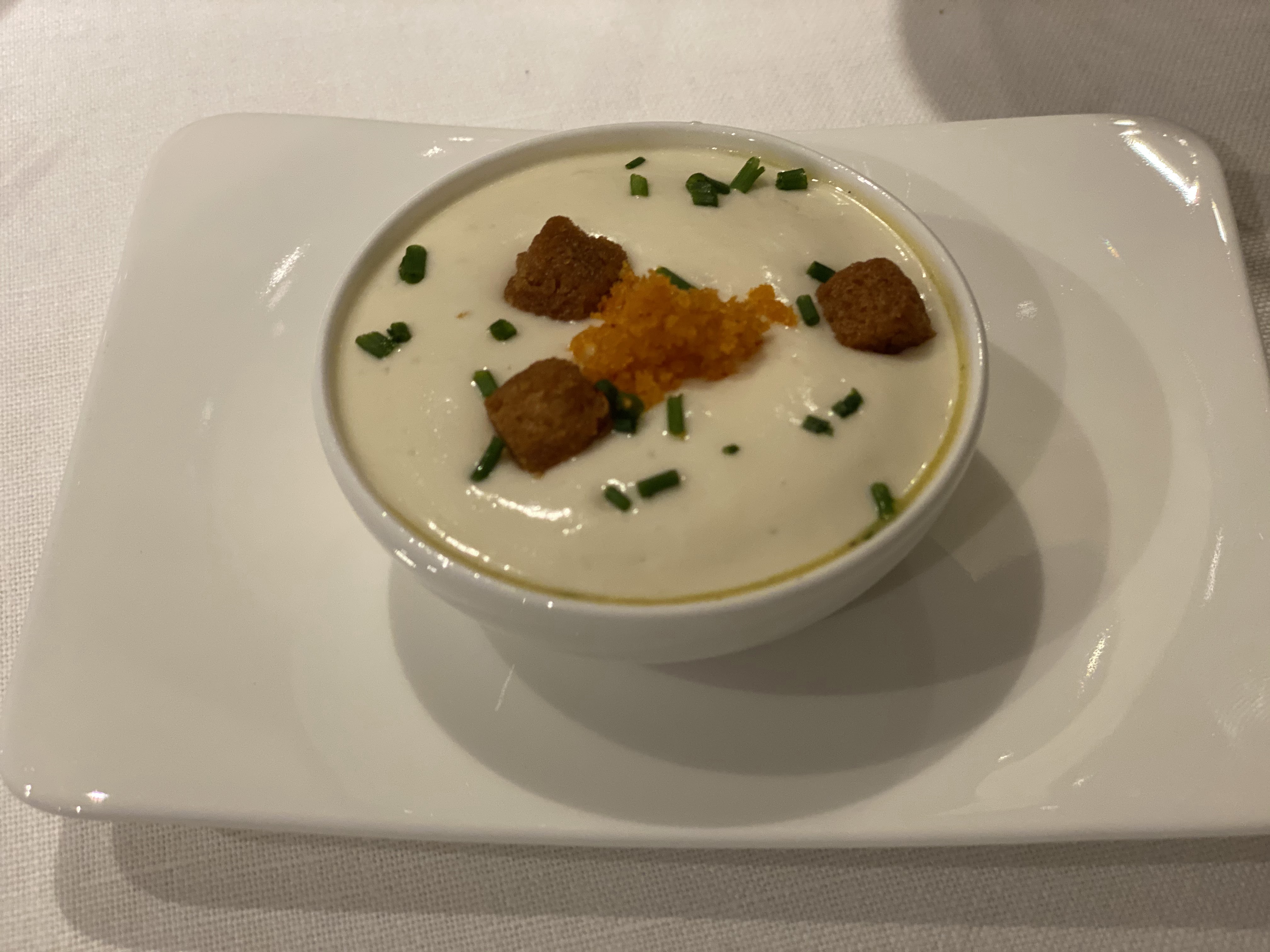 Restaurant incroyable. Chaque étape du repas était plus que délicieuse et le service était parfait. Il y avait quelques cours supplémentaires entre les autres. Je ne bois pas d'alcool, alors ils m'ont préparé une boisson avec du jus de pêche et de la vanille qui me mettait l'eau à la bouche. Nous avons commencé avec une mousse de pomme de terre, puis avons eu des écrevisses vraiment exquises. Une merveilleuse portion de chair de crabe, magnifiquement agrémentée de cuillerées de sauces colorées et de chou-rave. Thon cru, magnifiquement présenté. (Mon ami a refusé le thon et a obtenu une délicieuse mozzarella de bufflonne avec des tomates jaunes) Puis de l'agneau, servi de trois manières différentes, la plus succulente que j'ai jamais goûtée. Un pré-dessert - à base de melon et de fruit de la passion - une invention géniale que je dois ramener à New York ! Puis un dessert aux pêches melba. Puis du café et deux délicieux chocolats. J'y suis retourné le lendemain car je ne pouvais pas rester à l'écart. J'ai eu du foie gras à tomber par terre... Le personnel était incroyablement gentil et le chef - le chef !! - il était ce qu'il y avait de mieux dans cet endroit, bien sûr. SUPER sympa, incroyablement sympathique et tellement talentueux. De la Martinique. Cela vaut largement le coût.