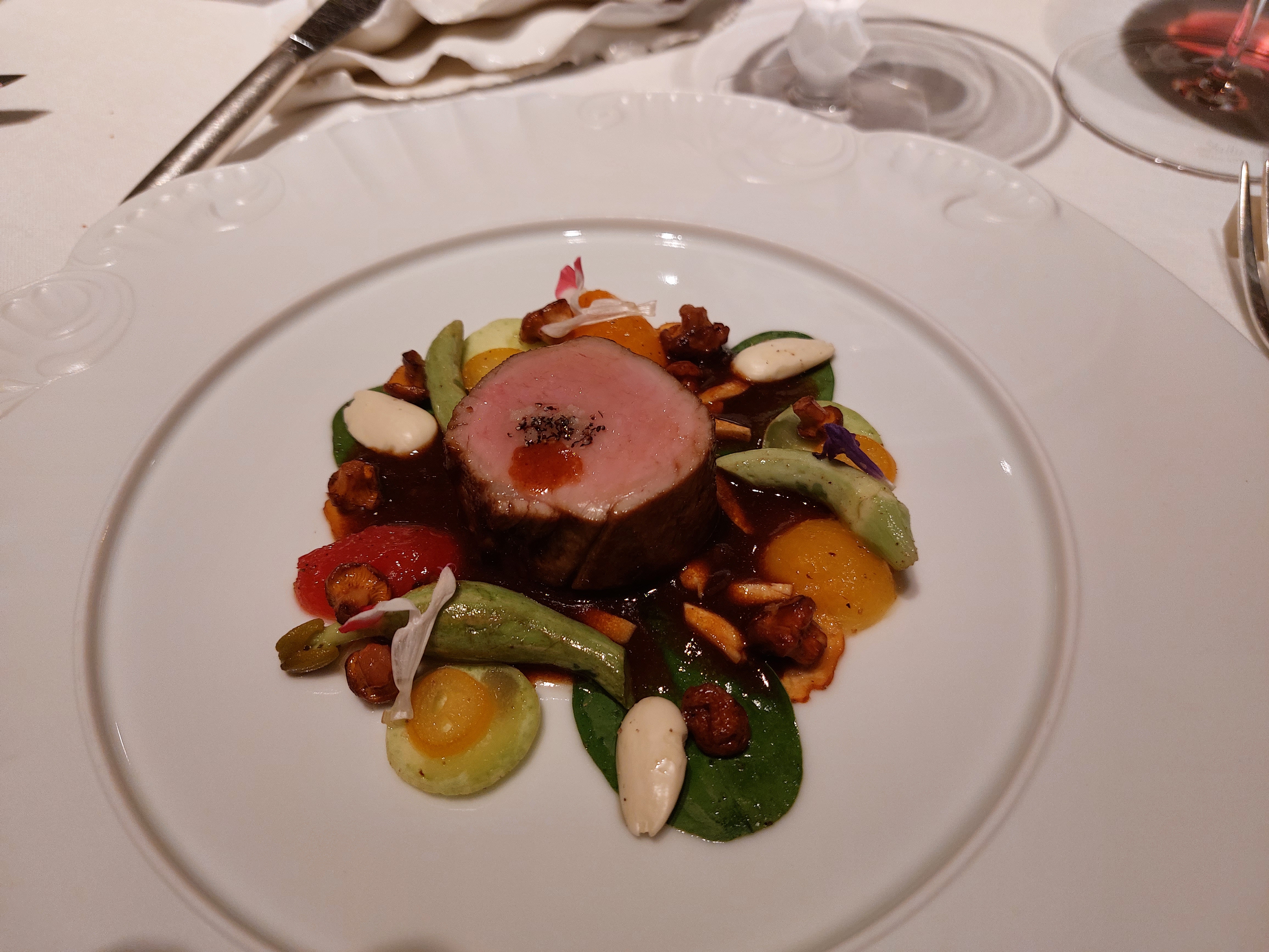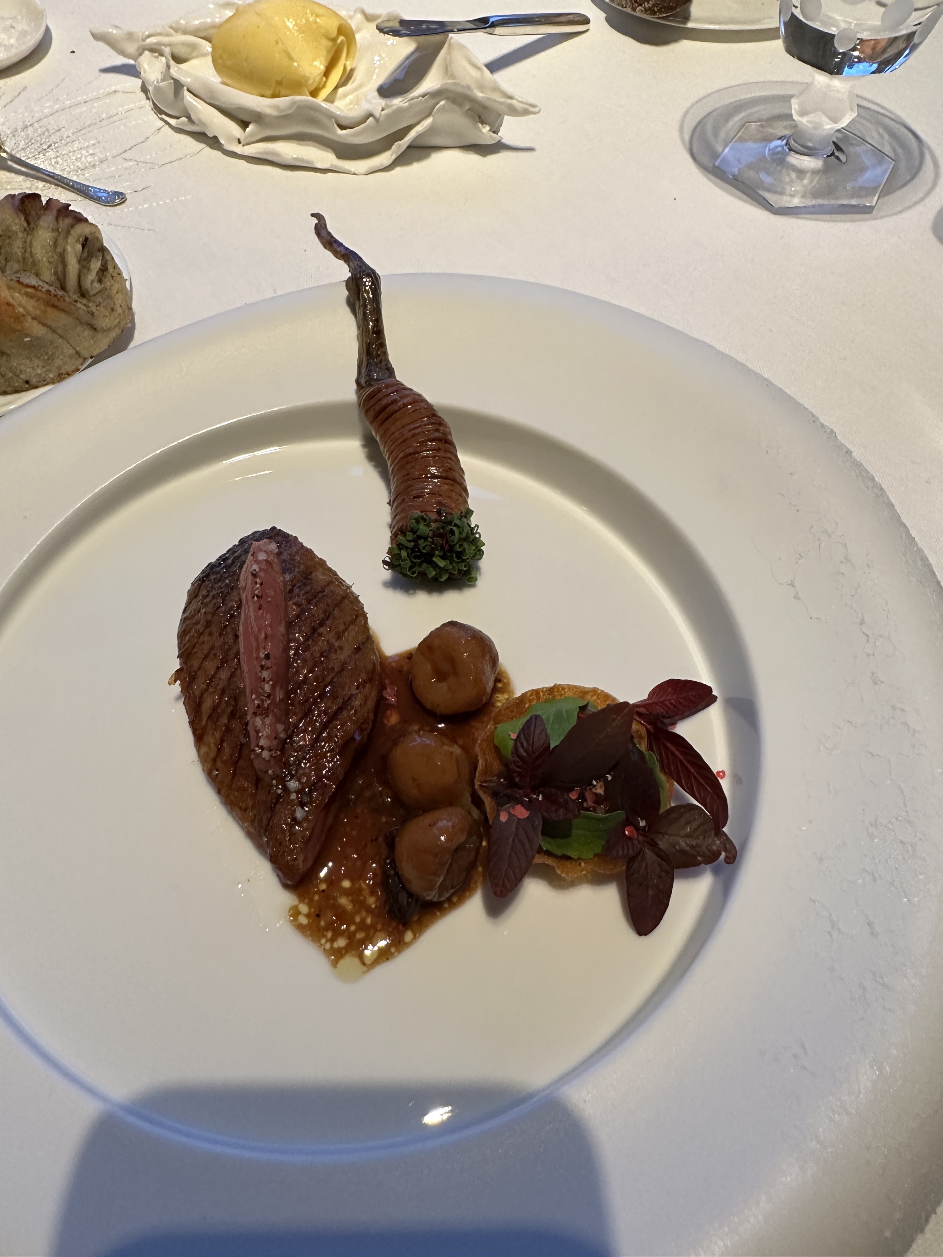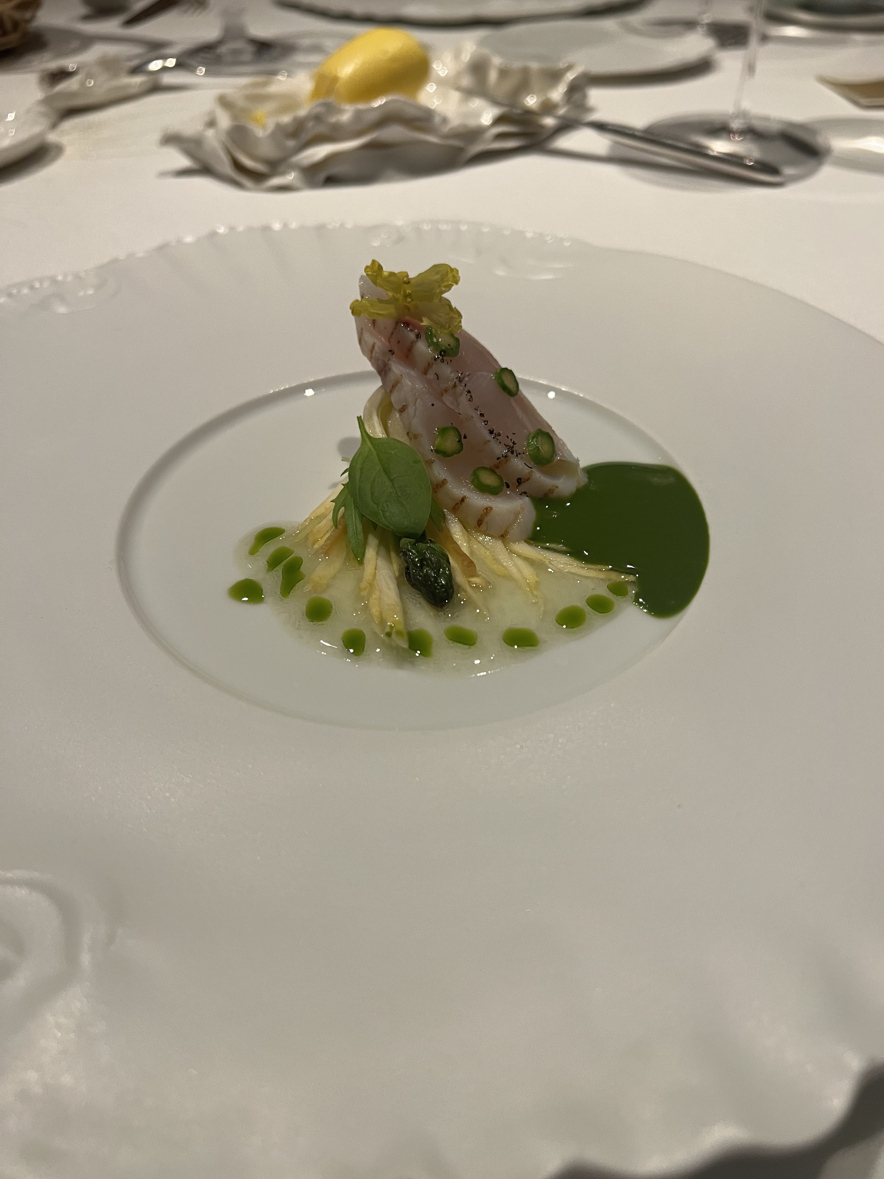 Un rare moment de gastronomie J ai été très impressionné par notre diner : la précision des cuissons du turbot et du pigeon , la finesse de la vaisselle et les œuvres d art partout , les sauces ( juste exceptionnelles ) c est d ailleurs la première fois dans un trois étoiles qu on nous demande de commencer le repas par déguster la sauce avant le plat Les desserts : poésie , dentelle ,fraîcheur, Le service est parfait tout le monde est au petit soin Une mention particulière pour Alexandre , très prévenant , drôle et smart Nous avons dîné dans le petit salon du fond et c était magique Bravo chef et bravo toute l équipe pour ce voyage sensoriel