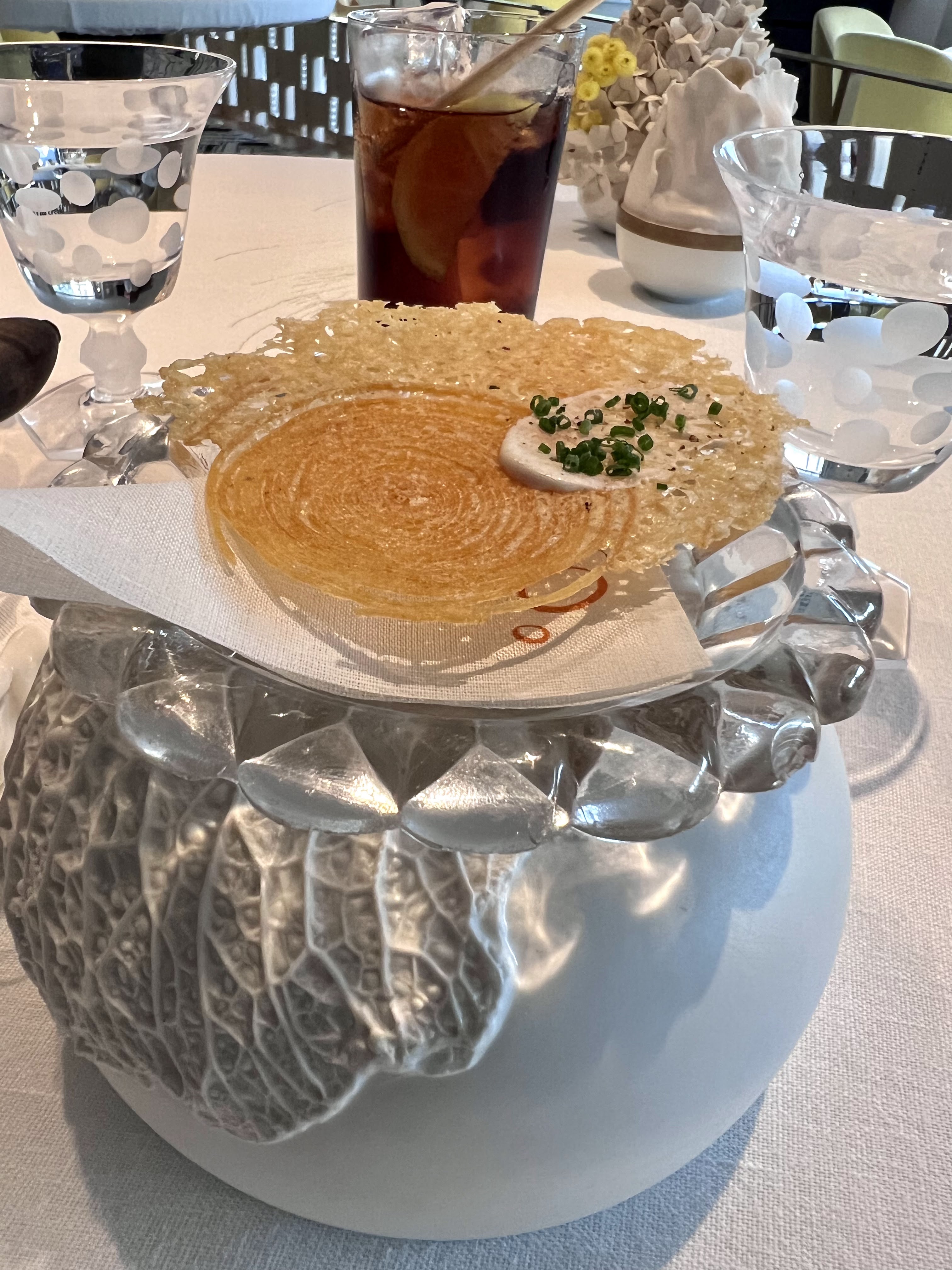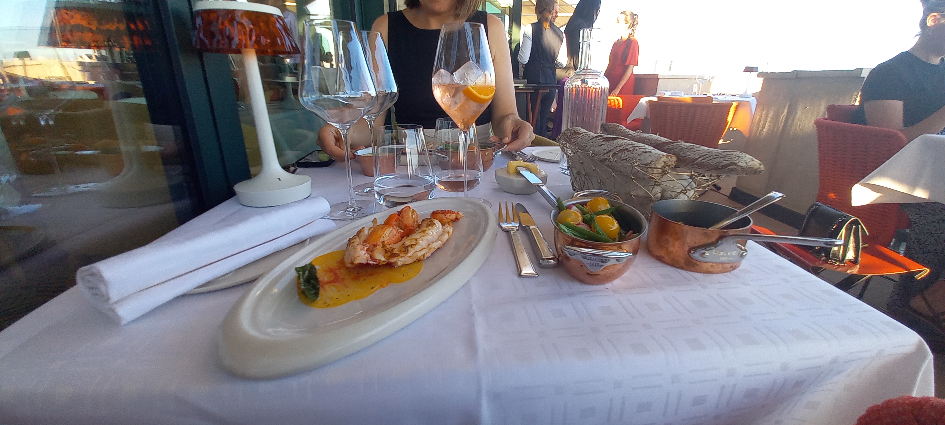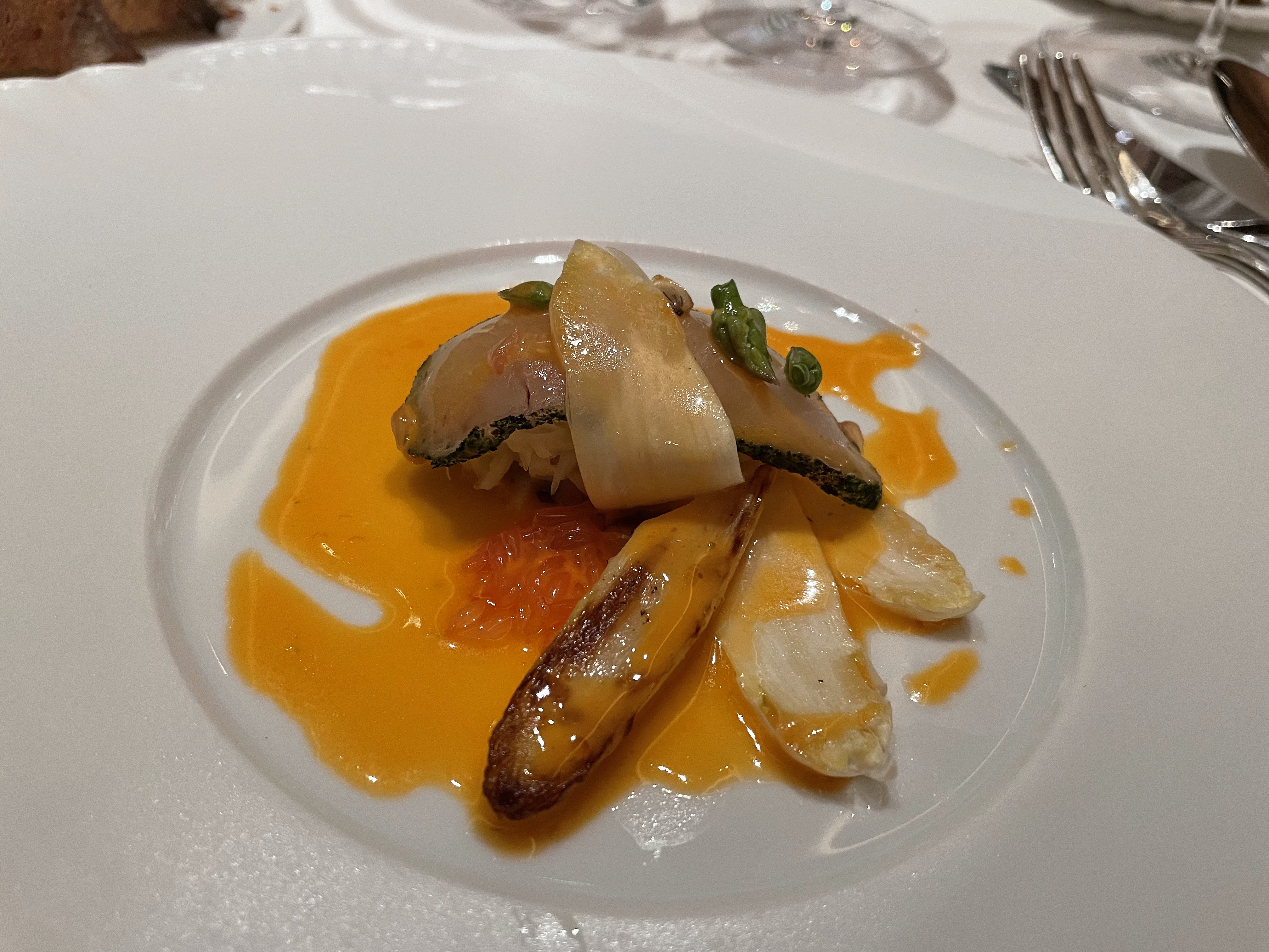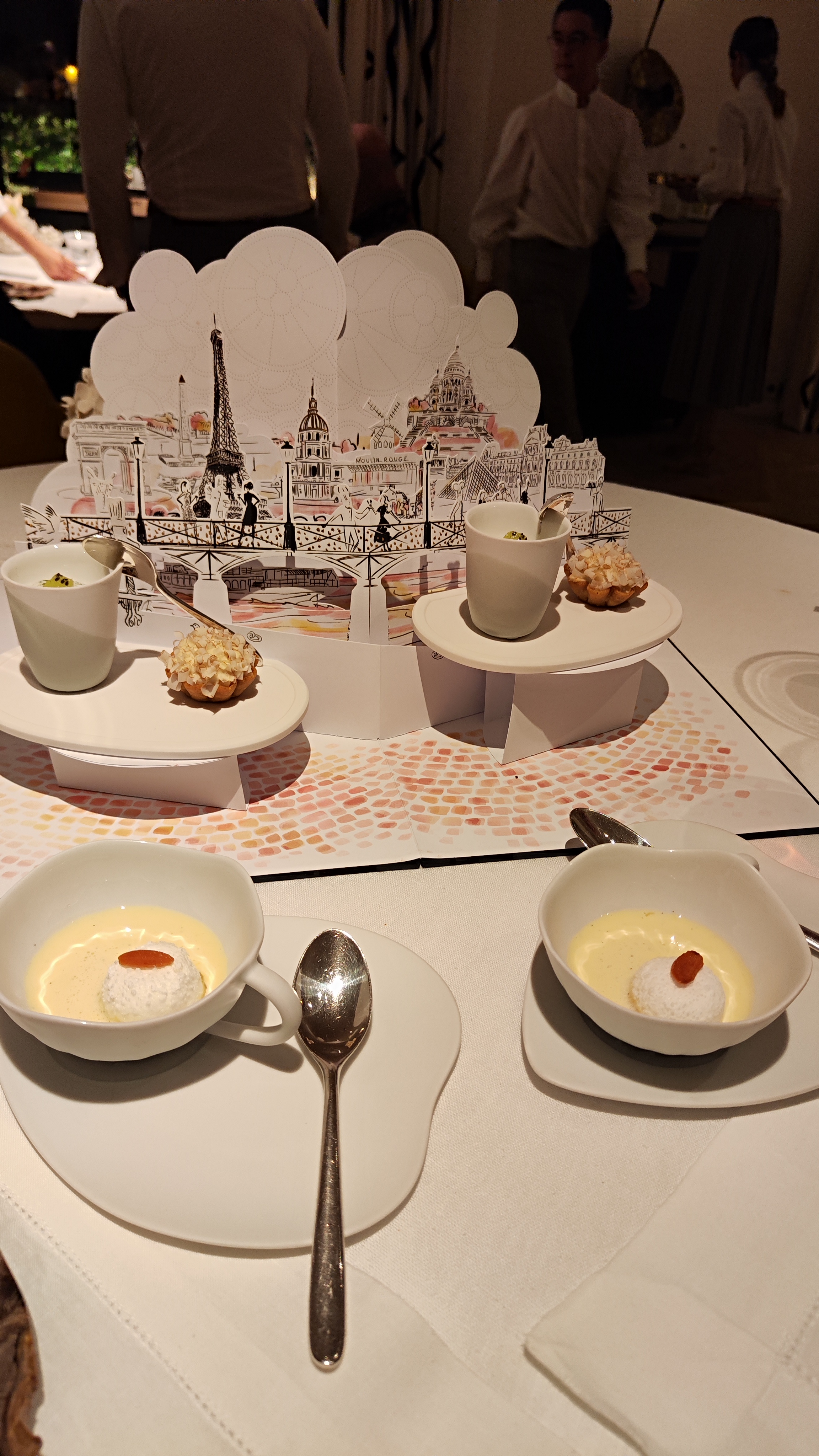 Très belle cuisine, quand-même un peu compliquée et en micro-portions. On a à peine le temps de goûter le produit. Nous avions préféré le restaurant de Saint Tropez où l'on pouvait faire un menu de poissons de Méditerranée. Le décorum autour du Paris touristique semble surtout fait … pour les touristes (encore peu présents pour l'instant). Les prix sont élevés, y compris pour les vins. Heureusement le sommelier connaît bien son affaire. Nous sommes allés explorer les vins australiens (il a fait un séjour là-bas) et n'avons pas été déçus.