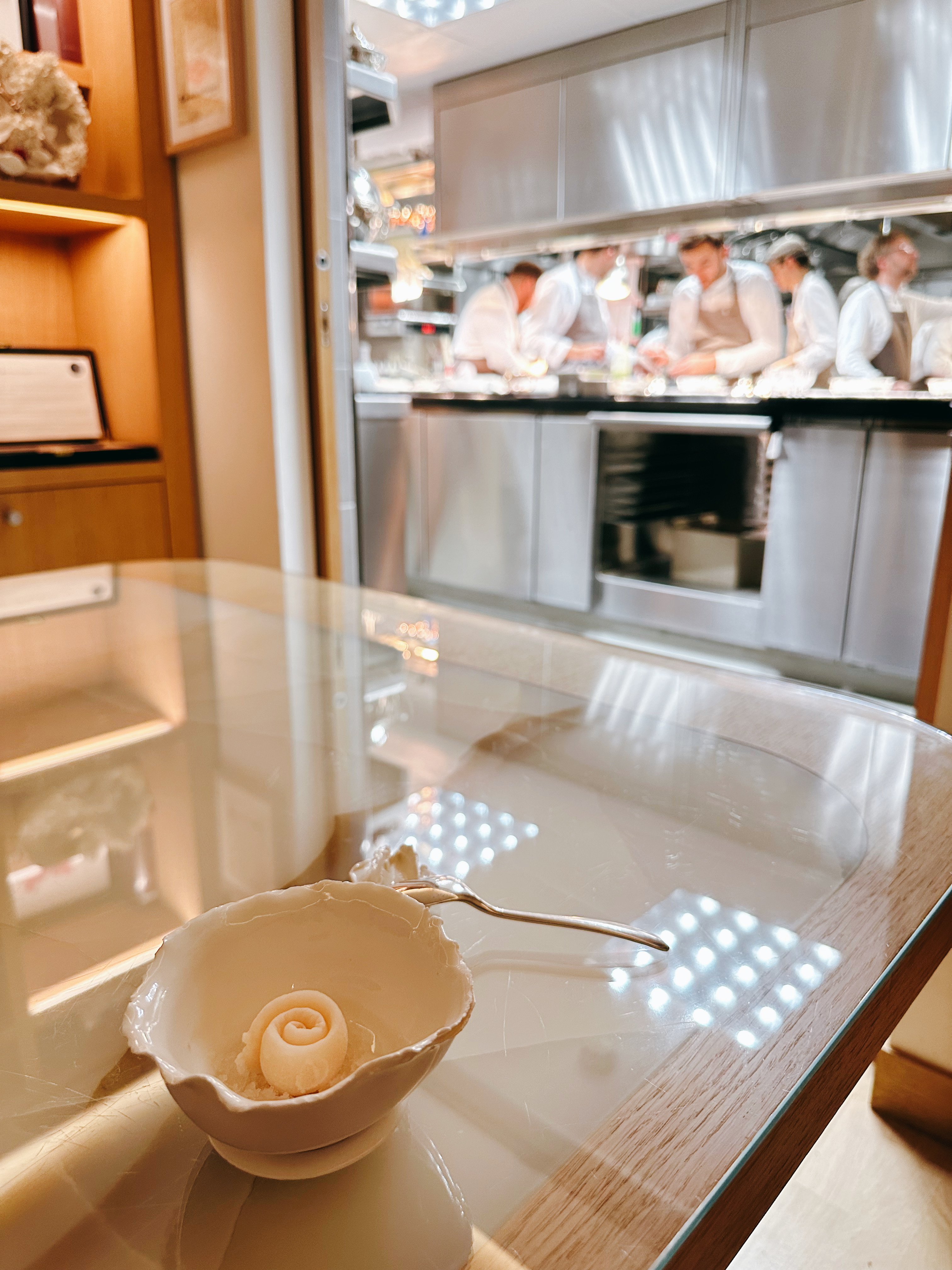 Quel établissement! Un restaurant qui touche la perfection. Service chaleureux et attentionné, une carte des vins sensationnelle, et les assiettes nous laissent sans voix. Chaque client se voit proposer de déguster un des plats dans les cuisines, expliqué par le chef. Quelle élégance! Un moment inoubliable.