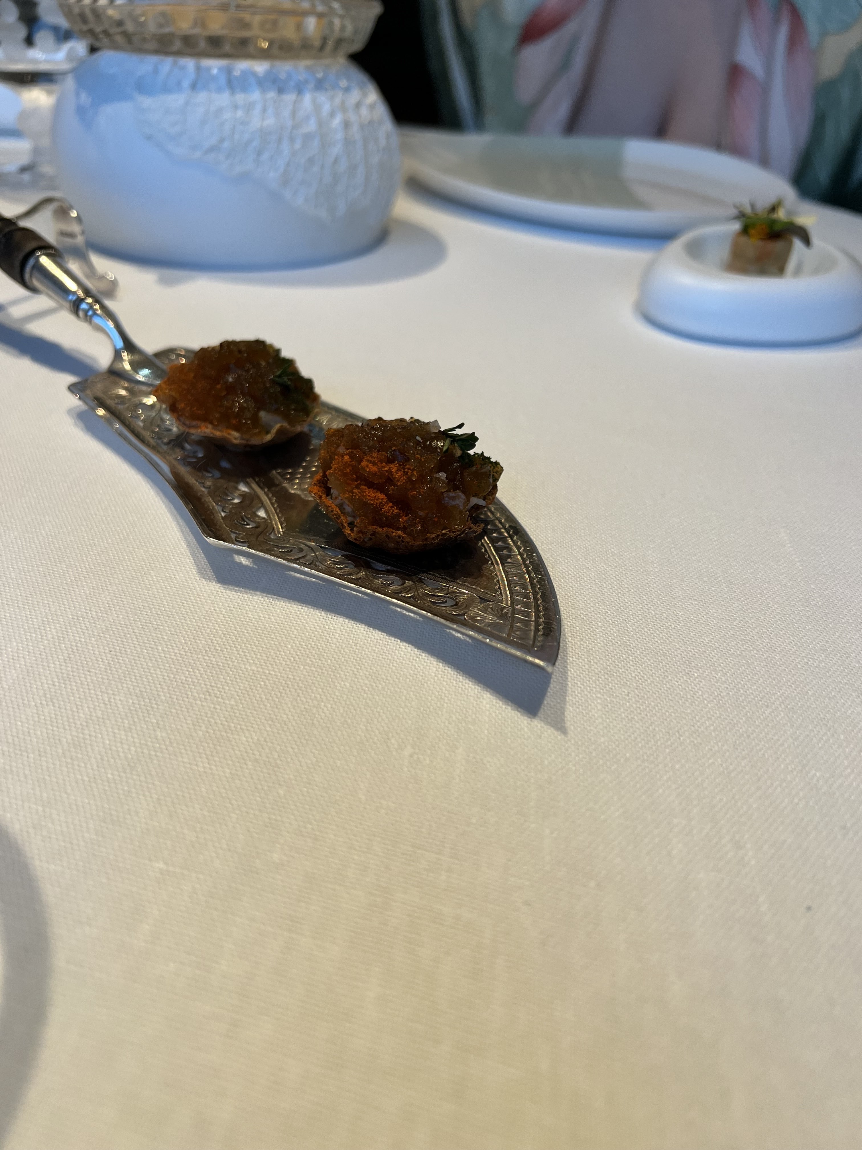 Soirée d'exception en ce lieu si attendu depuis mars 2020. La mise en scène est magique, et si singulière. Une identité toute autre à celle du Cheval blanc St Tropez. Ici, l'intimité, et l'émotionnel priment. Privilégiés, on savoure les sauces, et déguste les mets dans un cocon. On ressent la passion, et cette volonté de partager l'excellence. Laissez-vous guider comme nous par ces artistes : un cocktail explosif garanti en bouche! Le dessert fut également surprenant. On sort heureux, et comblés.