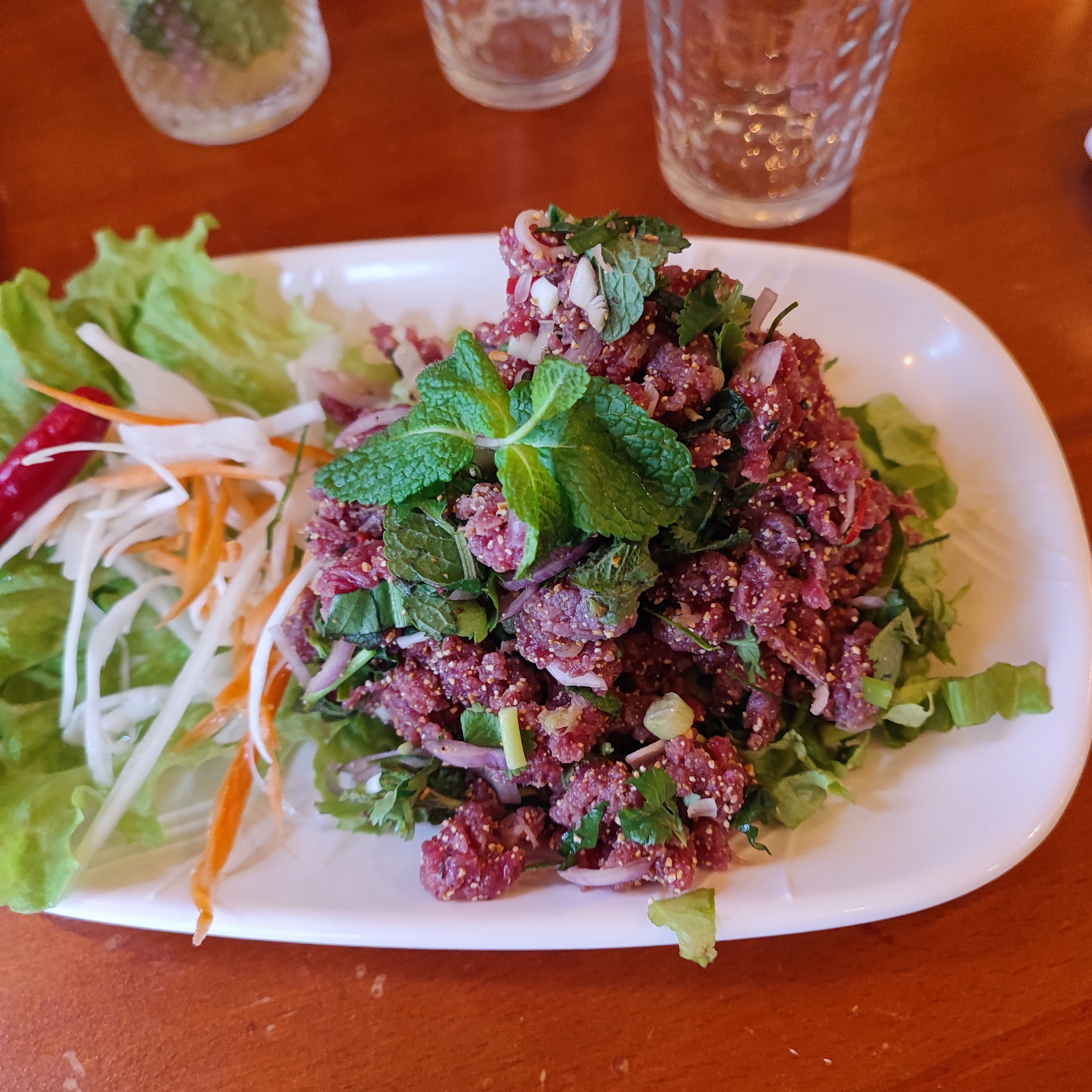 Petit thaï tout simple Avons mangé une salade de bœuf cru à la thaï🌶️, une salade de papaye (à la sauce tamarin 👍🏼) et une soupe au lait de coco citronnelle, très bon 👍🏼 (Petite remarque qui devrait être réglée dans les jours prochains pas de CB acceptée problème de terminal 🤞😬)