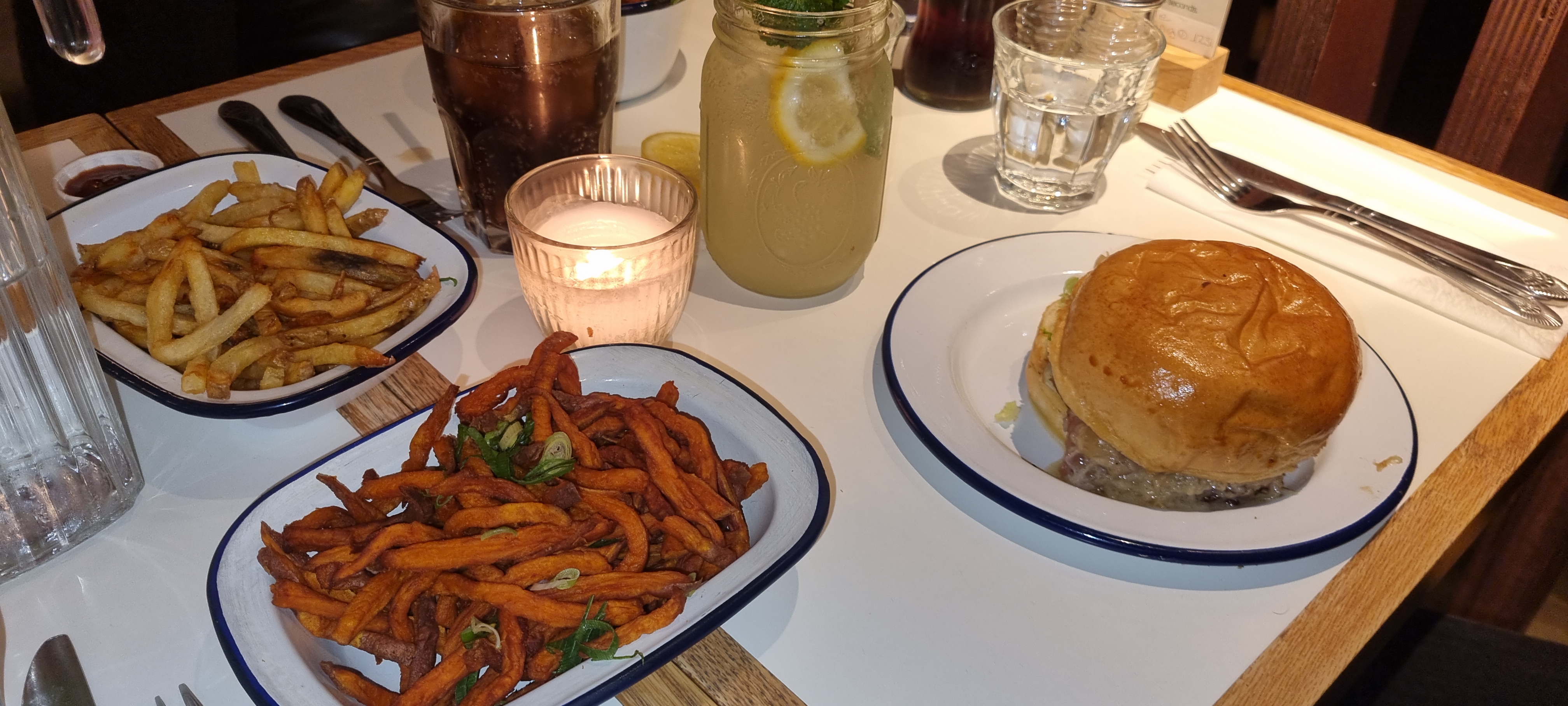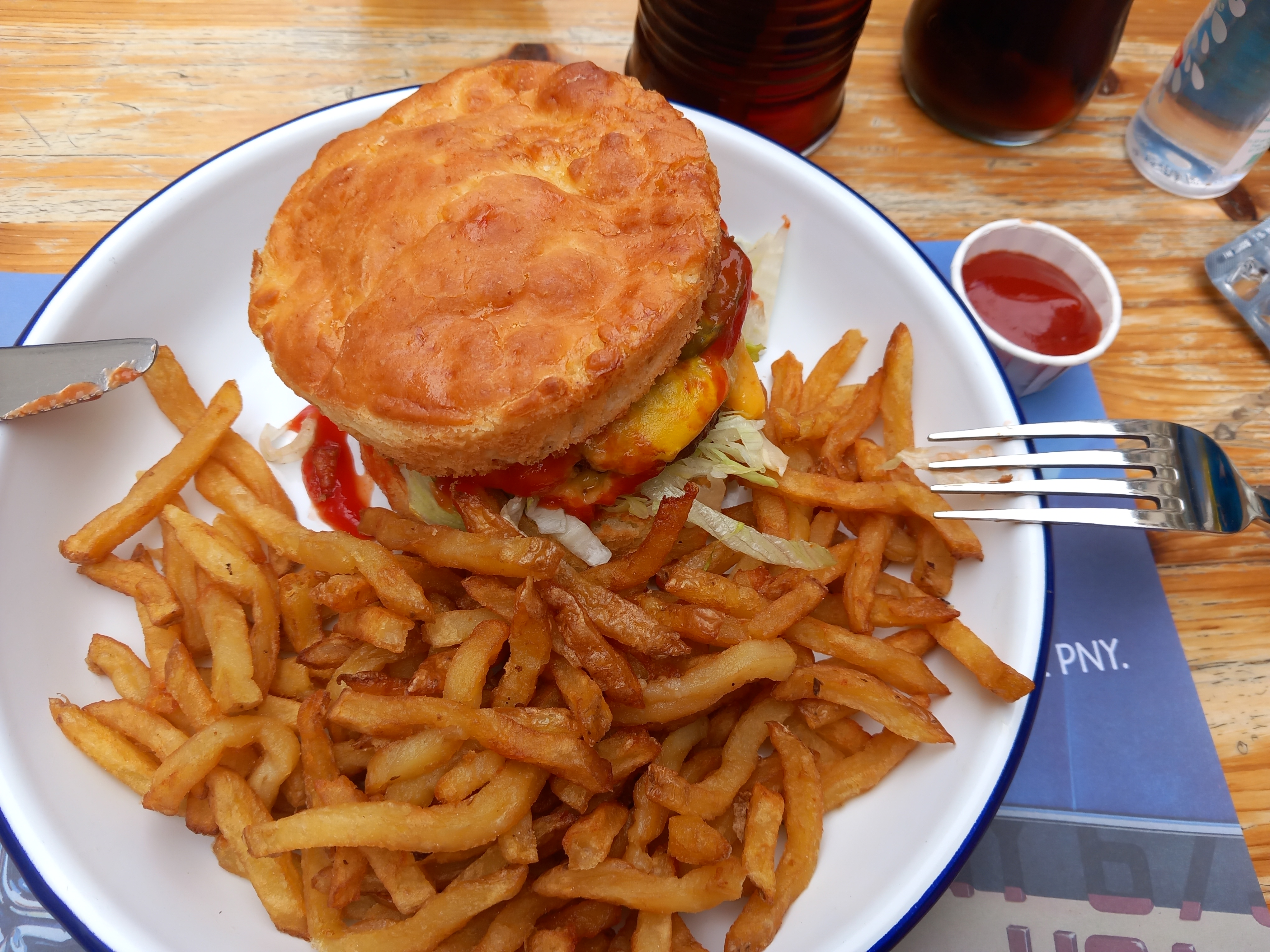 Les burgers sont tout simplement délicieux,copieux et qualitatifs, les frites le sont tout autant et surtout avec le supplément cheddar qui apporte un goût unique, les serveurs sont accueillants et le temps d’attente tout à fait raisonnable.Bref vous l’aurez sans doute compris ce restaurant est une petite pépite qu’il ne faut surtout pas manquer si vous passez dans le coin et que vous êtes fan de burgers.