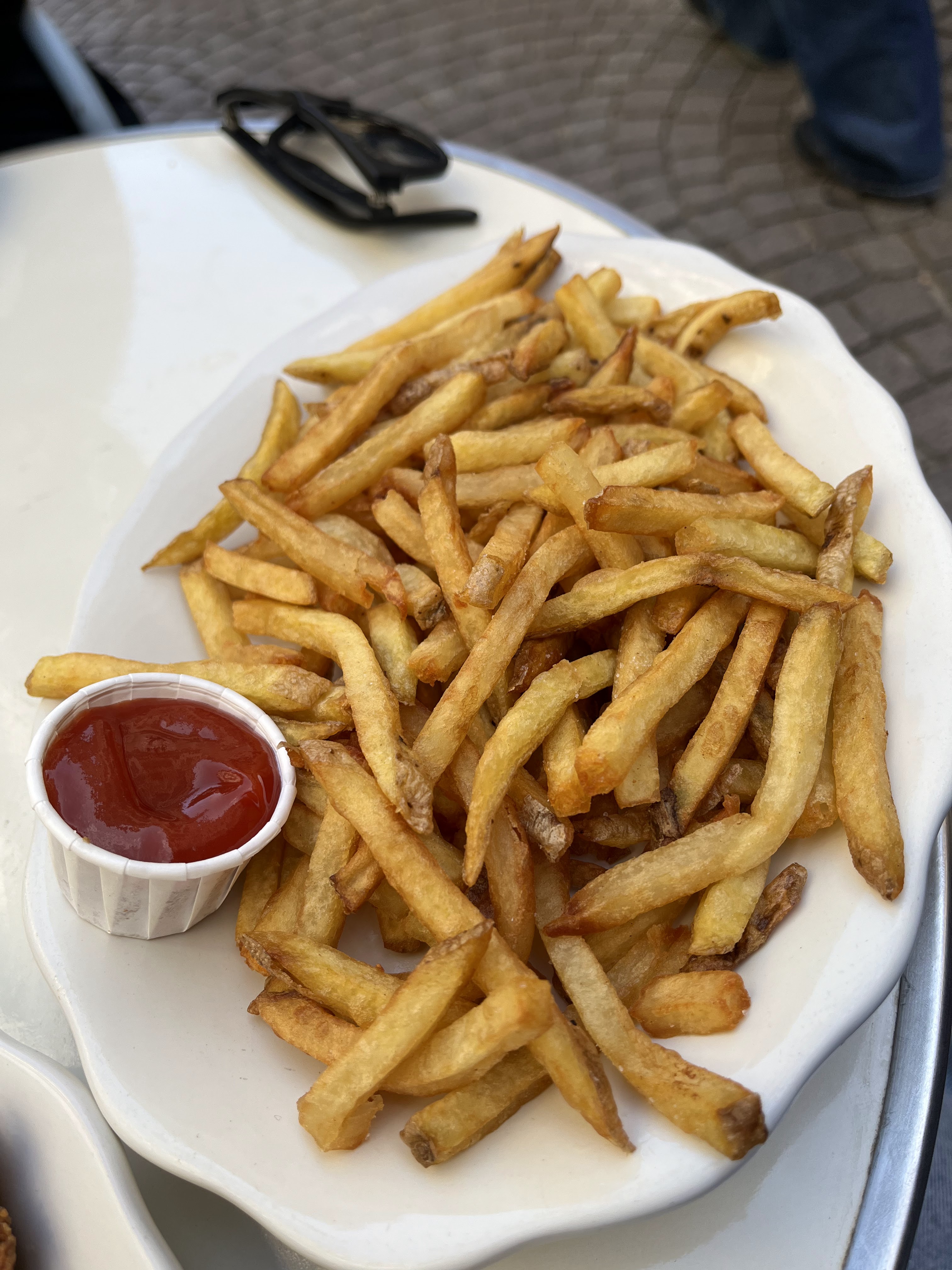 Déjeuner sympa sur la terrasse ensoleillée. Le burger et les frites sont réellement sympa. Ma conjointe est assise à 15cm d’une guirlande dont plusieurs ampoules sont brisées: le verre menace de couper et pire encore, le filament de l’ampoule est nu et sans doute prêt à vous électriser . Je le signale au serveur, celui ci me dit connaître le sujet et me dit le traiter plus tard. Les traces d’oxydation dans les ampoules me font penser que « le plus tard » semble durer depuis un moment. La sécurité des clients n’est pas une priorité: position surprenante