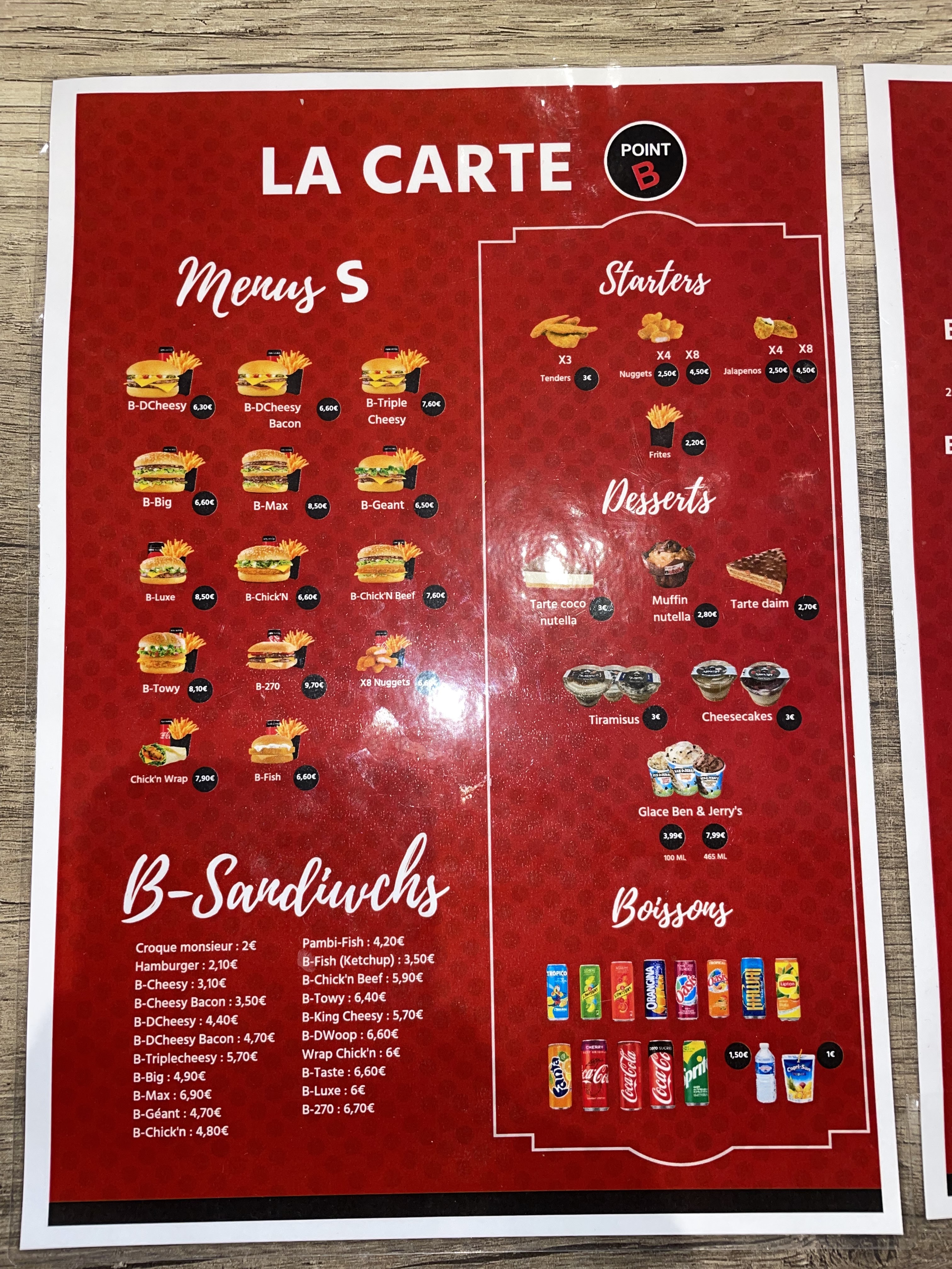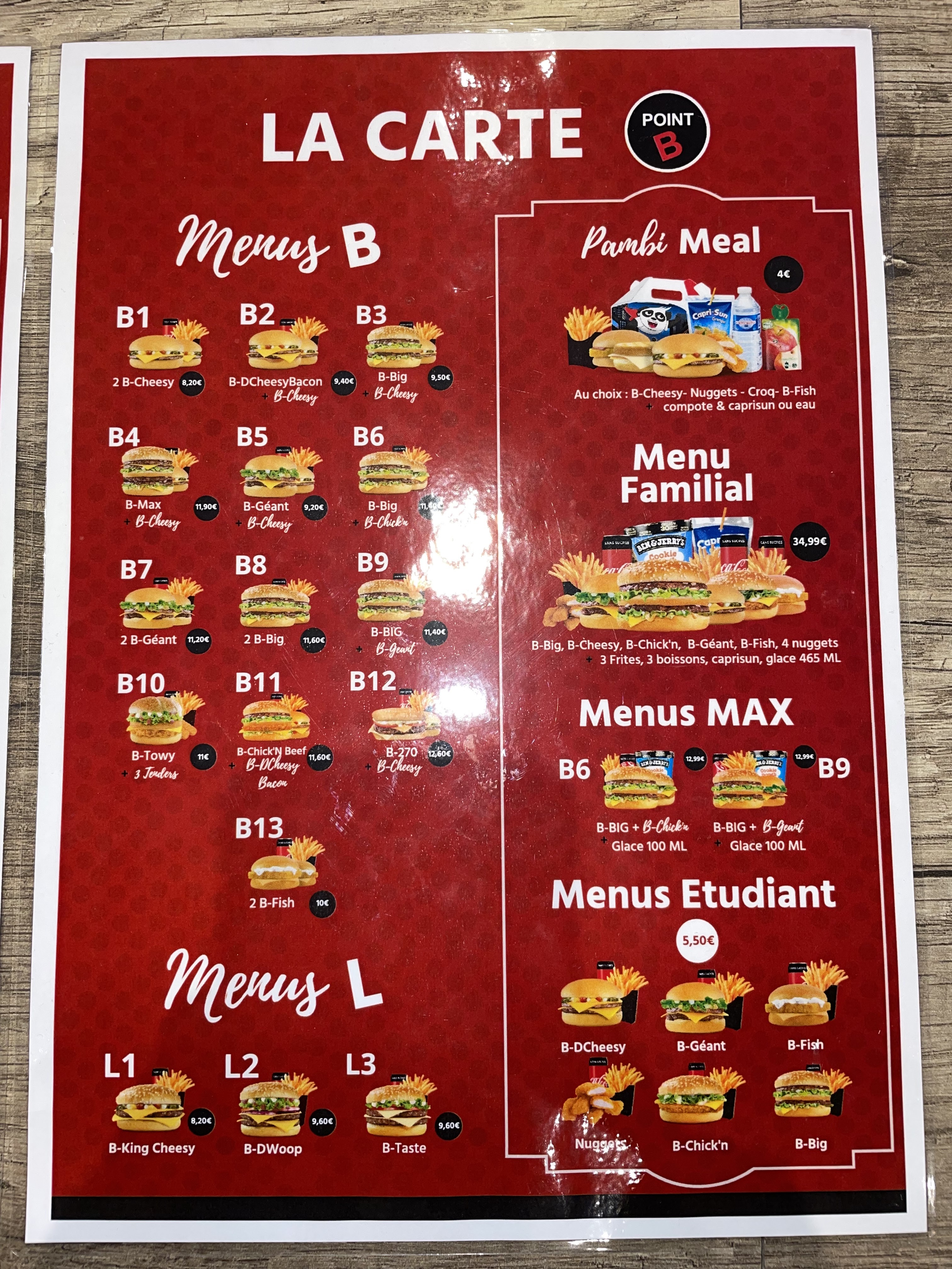 C est du fast food mais de temps en temps cela fait du bien et Point B a de bons menus et beaucoup de choix