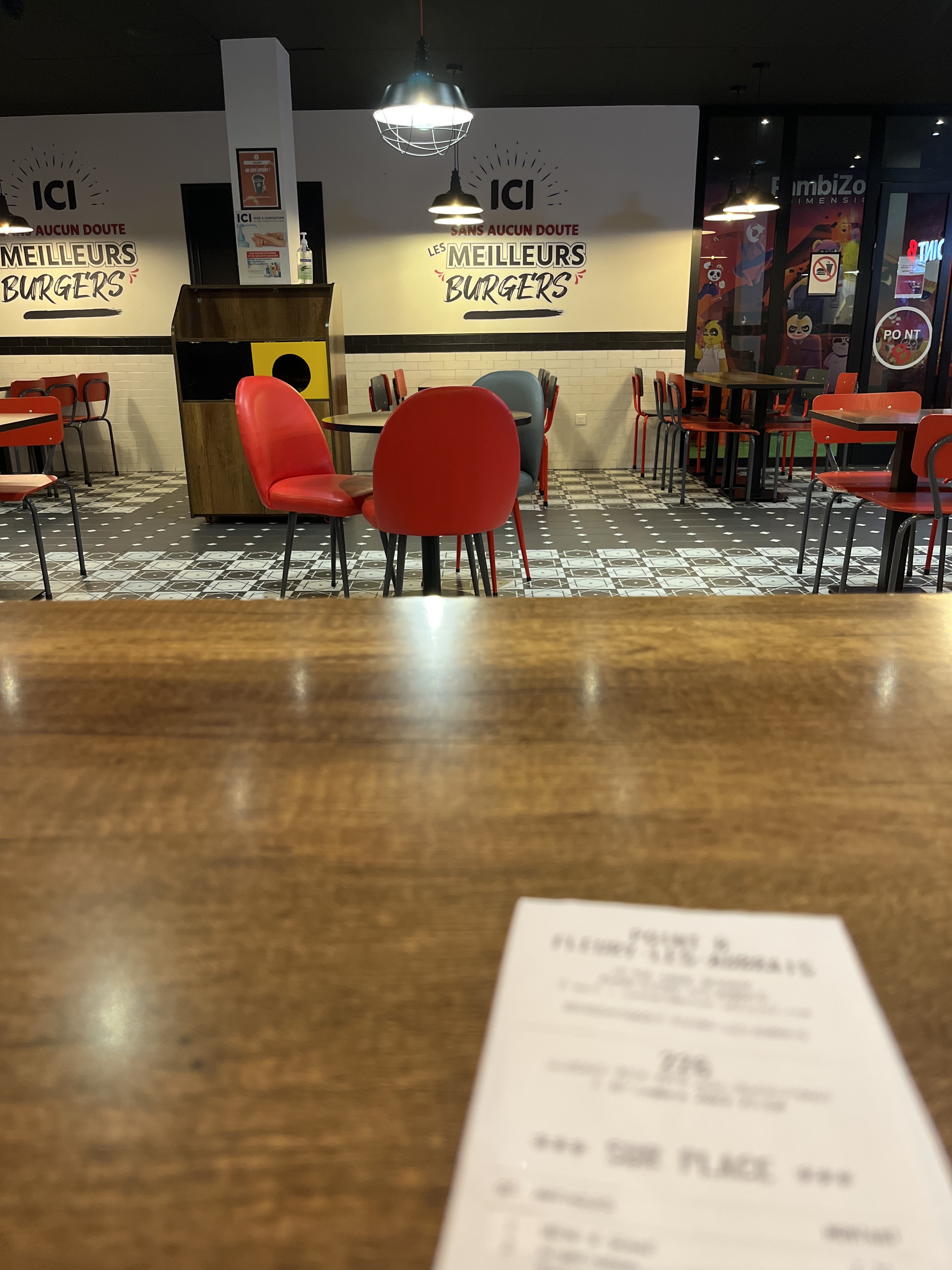 Le seule point positif c’est le parc à jeu pour enfant. Il n’y a pas trop de différence entre un Quick sauf le prix un peu plus élevé et la taille médiocre de l’hamburger. J’avais l’impression de jeter mon argent à la fenêtre