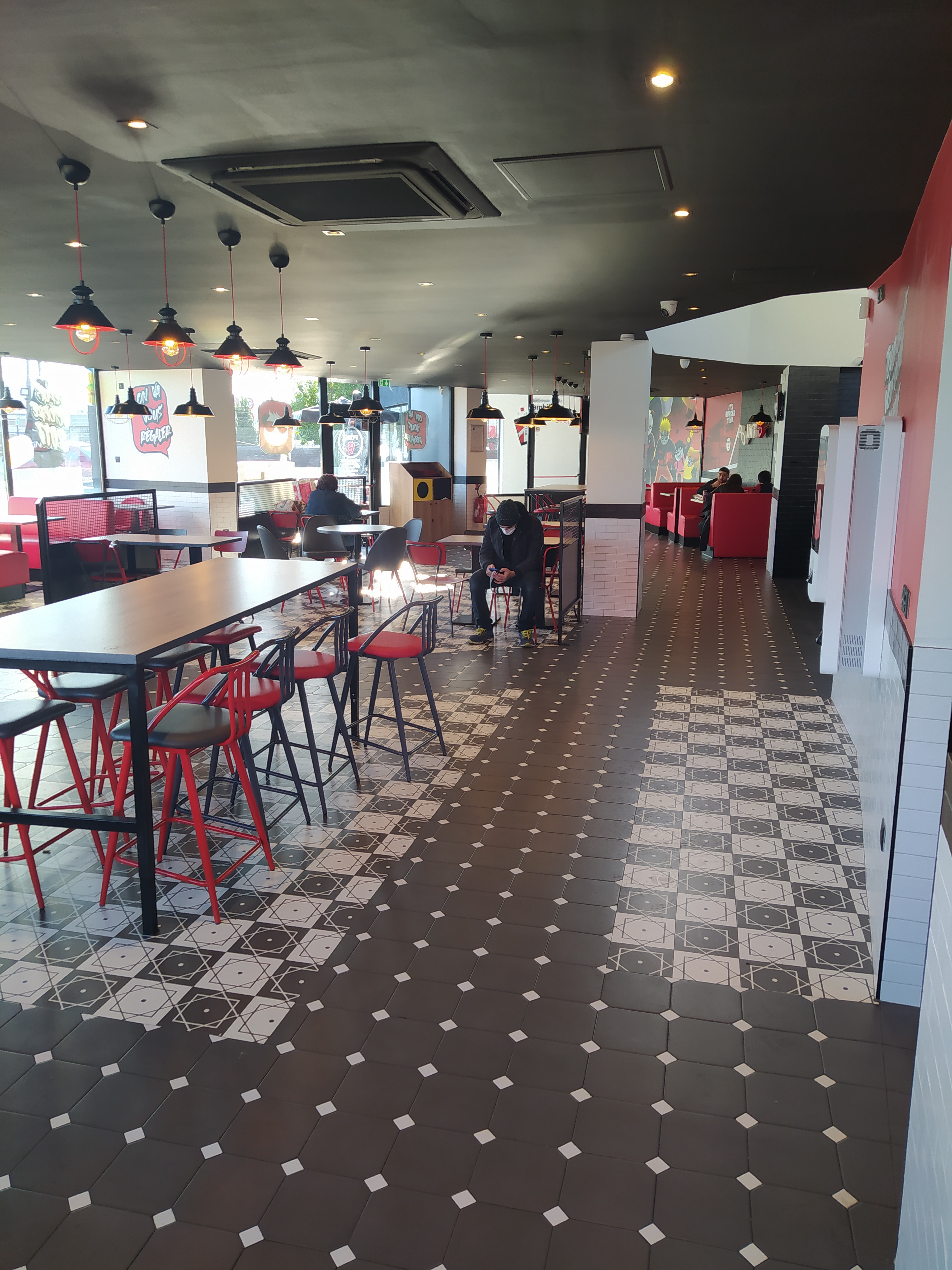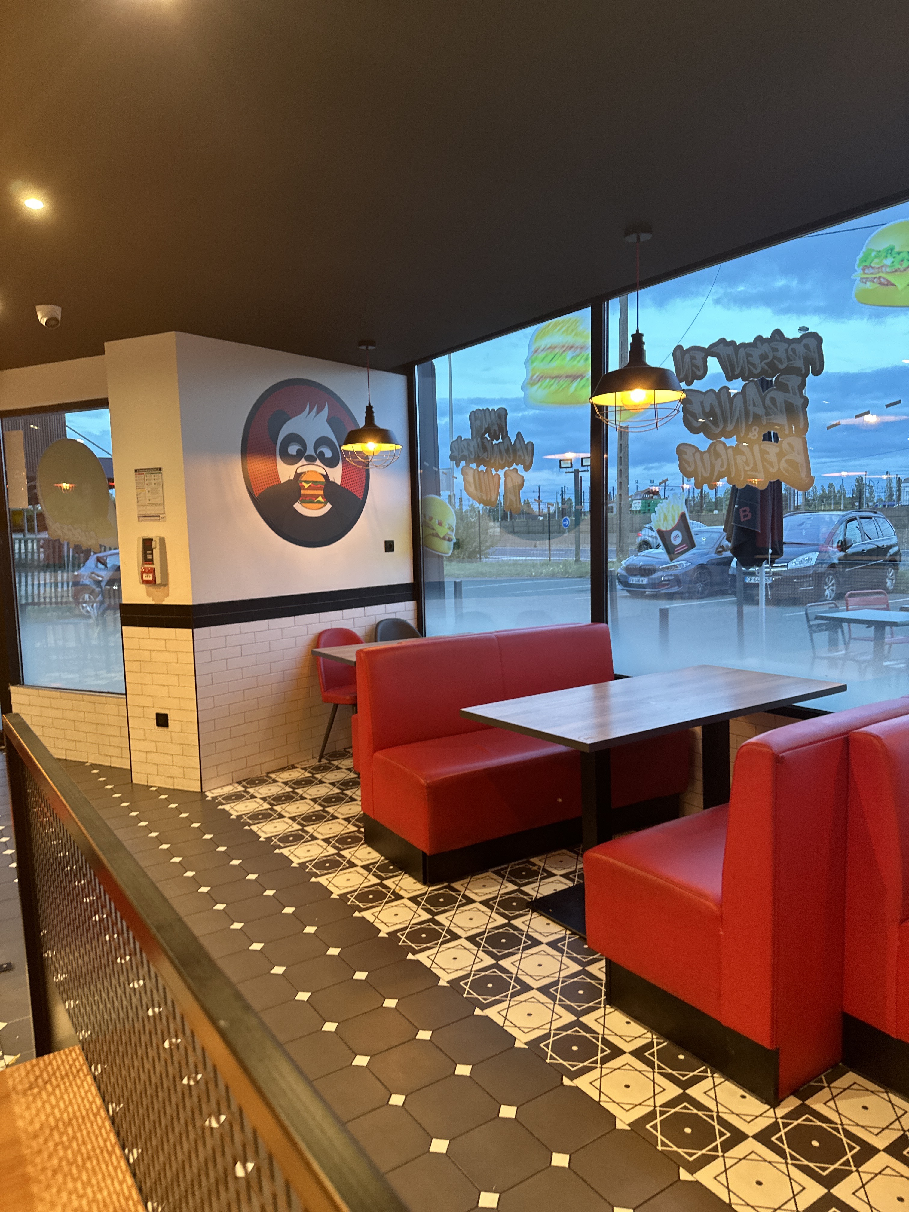Neuf et propre Borne tactile et comptoir pr commander Bcp de choix de burgers en plus des nuggets, tenders et japalenos... Grand choix de boissons fraîches également (canettes). Et les desserts sont frais : 1ere fois que je goutais un tiramisu paris-brest : belle surprise, super bon ! A recommander Accessible facilement et place de parking sur place