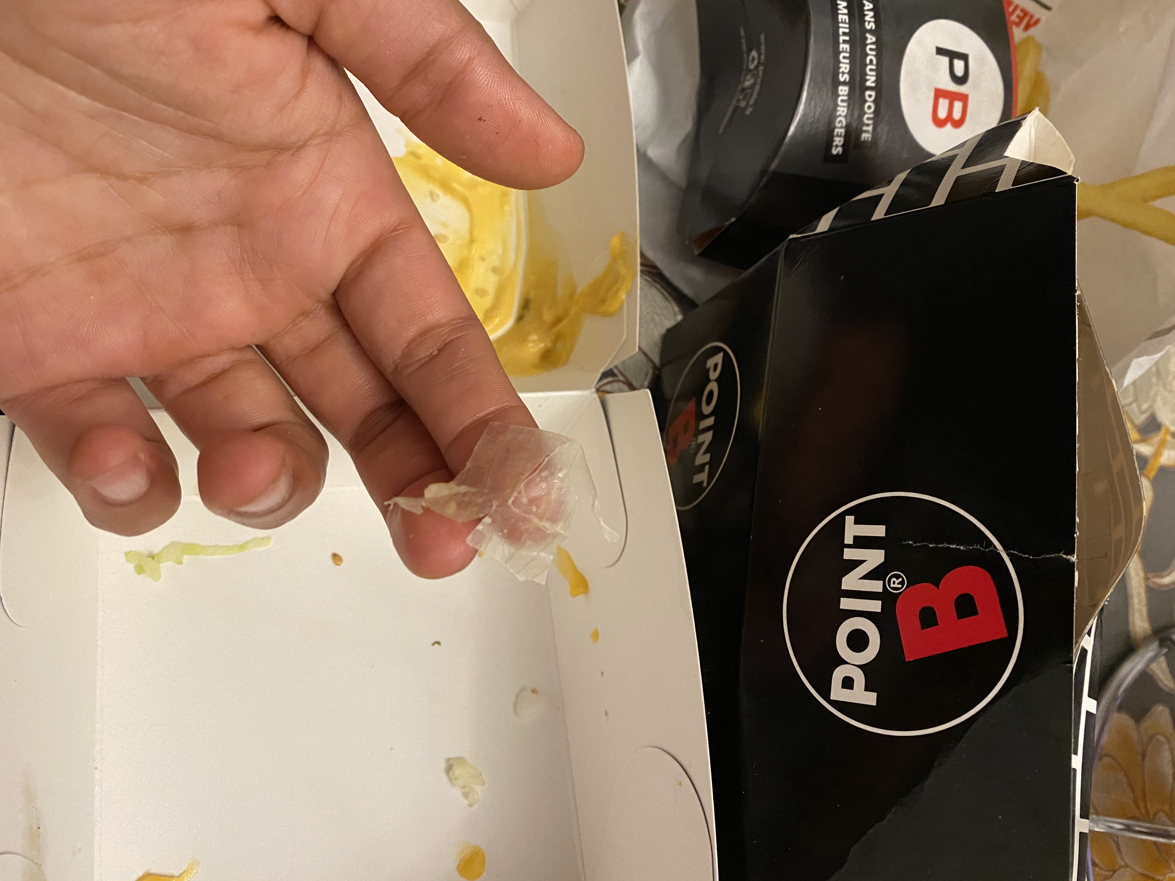 Commande passée par Uber Eats, pour la première fois je teste Point B La commande est arrivée froide, mais faute à la livraison Concernant Point B, je suis choquée de retrouver un poil dans mon hamburger Je trouve cela INADMISSIBLE, revoyez votre hygiène s’il vous plaît Avoir de l’ambition pour créer une chaîne de restauration halal qui s’inspire des chaînes les plus connues est une bonne chose Mais sachez copier l’hygiène également. (Les frites ne sont pas tops)