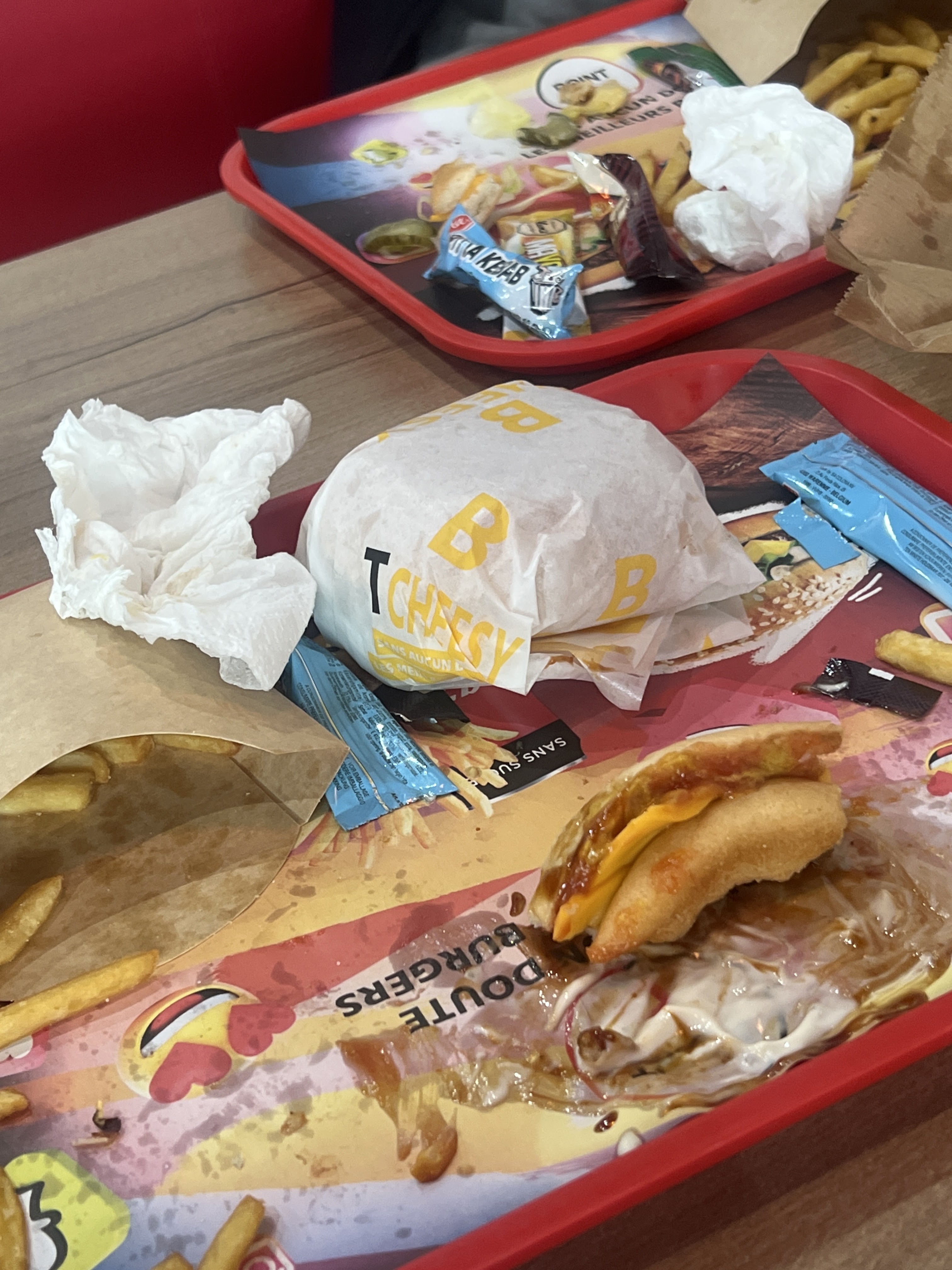 Trop trop salé que ce soit les frites ou le burger, j ai du tout jeter ! La viande chicken n est pas bonne carrément aspect de plastique, les frites sont très huileuses et molles, y a que les boîtes des burgers et des frites qui sont top !