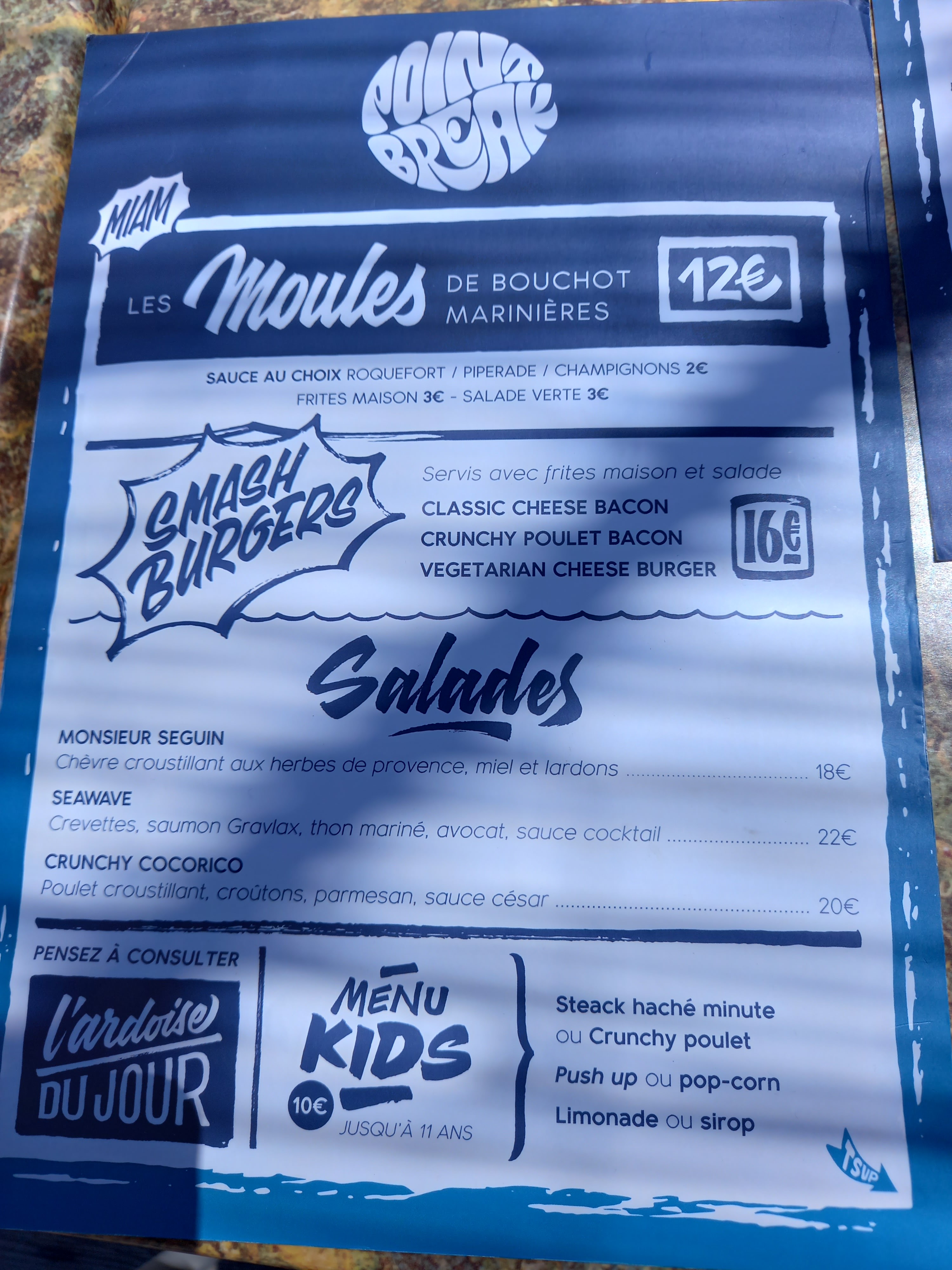 Nous sommes venus à 4 : 2 adultes et 2 enfants (4 et 7 ans). Nous avons commandé un menu enfant, environ 10 eur, qui comprend 1 sirop, une frite avec poulet pané ou steak haché, et une glace ou un pot de pop corn. Pour mon moineau d’enfant, je trouve que 10 eur pour un menu enfant c’est élevé, cependant le poulet pané était vrmt très bon, les frites étaient également bonnes. Nous avons pris des moules marinières, à 15 eur le plat, elles étaient excellentes ! Je les recommande. Nous nous sommes régalées. Mon mari a commandé des gambas pour 22 eur. Selon lui, les gambas étaient très bonnes mais il aurait fallu 2 ou 3 gambas en plus dans l’assiette (plat servi avec 5 gambas + frites + salade) Les serveuses ont été efficaces et polies, on nous avait annoncé de l’attente, et nous a fait patienter avec qques chips et un guacamole (qui au passage était excellent). Au final nous n’avons pas attendu bien longtemps. La carte propose également des burgers, de la viande rouge …
