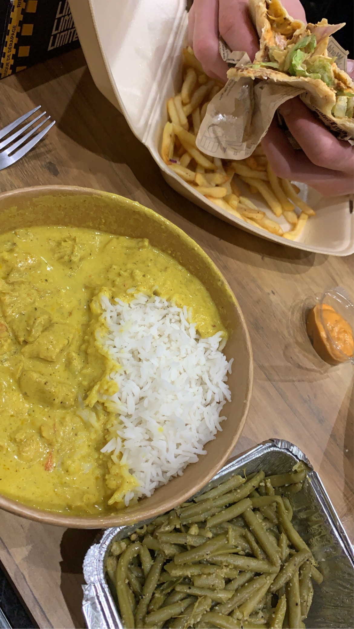 J'ai pris un sandwich dans un pain naan plié en deux (je me souviens pas du nom) c'était tellement bon, le pain naan est fabuleux. Cependant, il n'y avait pas assez de crudités à mon goût (mais ça dépend des goûts évidemment). En revanche, qu'est ce qui s'est passé avec les frites ? Les pommes de terres sont très riches en sucre et apparemment non blanchies avant la cuisson en friteuse, ce qui les rend beaucoup trop brunes, sucrées et pas du tout croustillantes. Y'en a peut être qui aimeront cela dit. Le propriétaire est très gentil et arrangeant et la boutique est très bien tenue. Je recommande ( mais pas les frites ! )