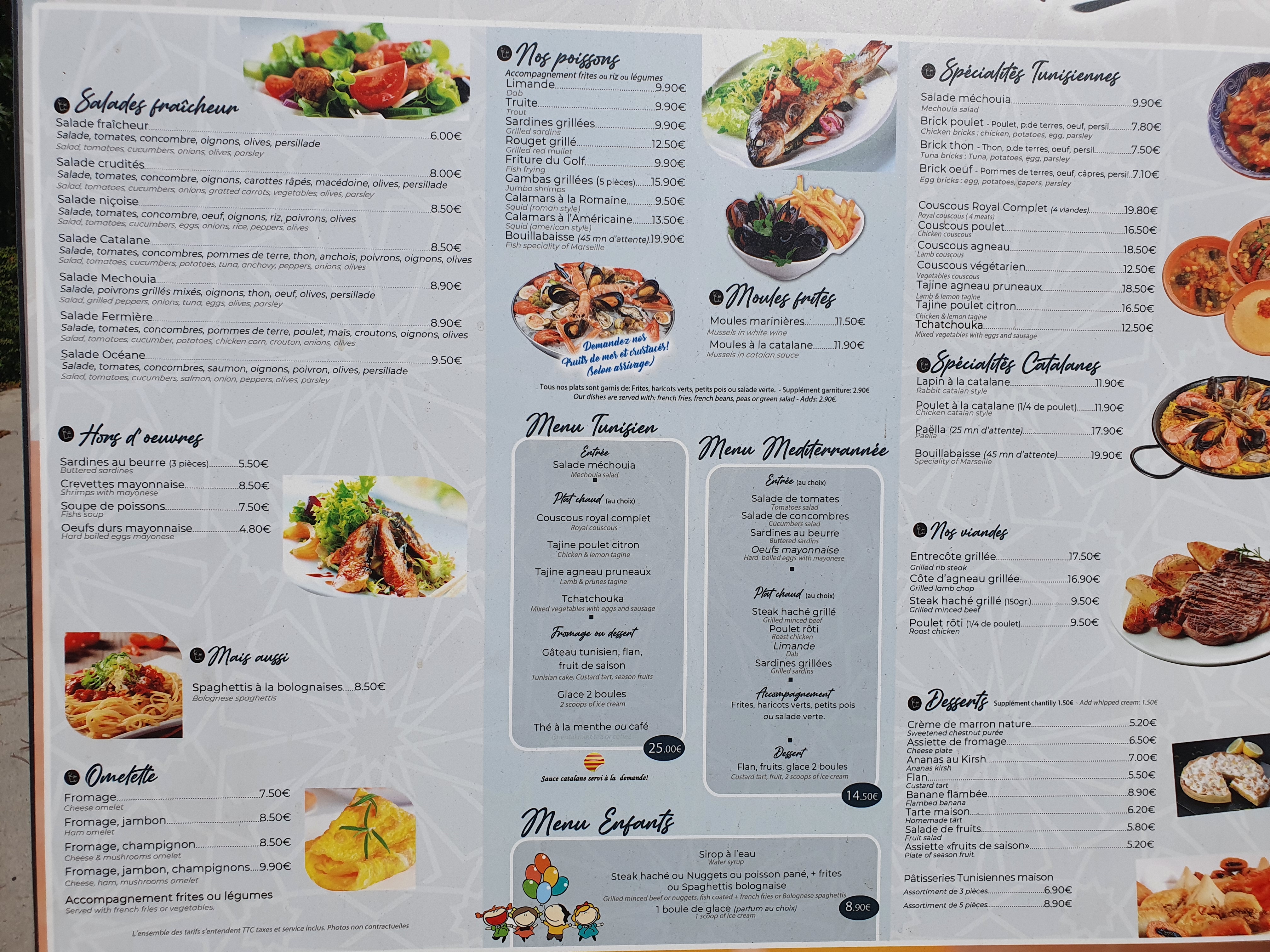 Restaurant typique tunisien et déco vraiment comme si on est en Tunisie les serveurs sont sympa souriant les quantité sont bien copieuse dommage les frites sont pas maison et le rouget manqué un filet d'huile d'olive et de jus de citron sinon bon restaurant j'y retournerai étant donné que sa fait 28 ans que je vais dans cette région bonne continuation et que votre commerce soit fructueux inch'Allah 🥰